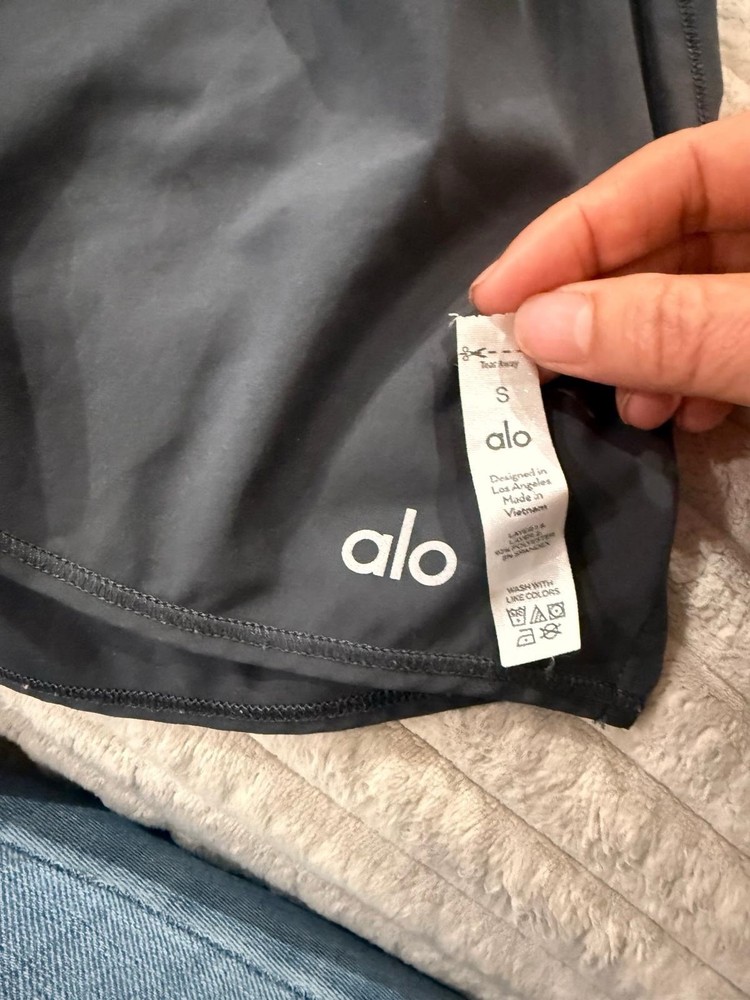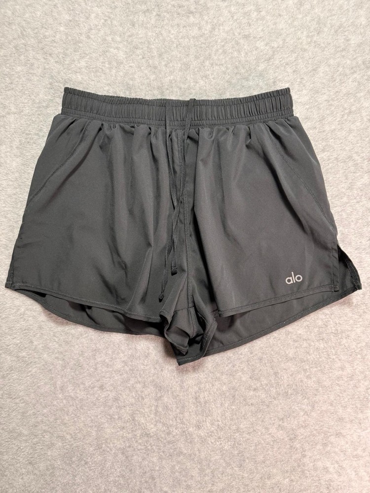 These women's black alo shorts in size small are perfect for active wear. They feature a solid pattern, drawstring closure, and pockets for convenience. Made for running and jogging in the spring and summer seasons, these athletic shorts by alo are machine washable and designed for the modern woman on the go. Size tag came off but will ship it out on the pocket side