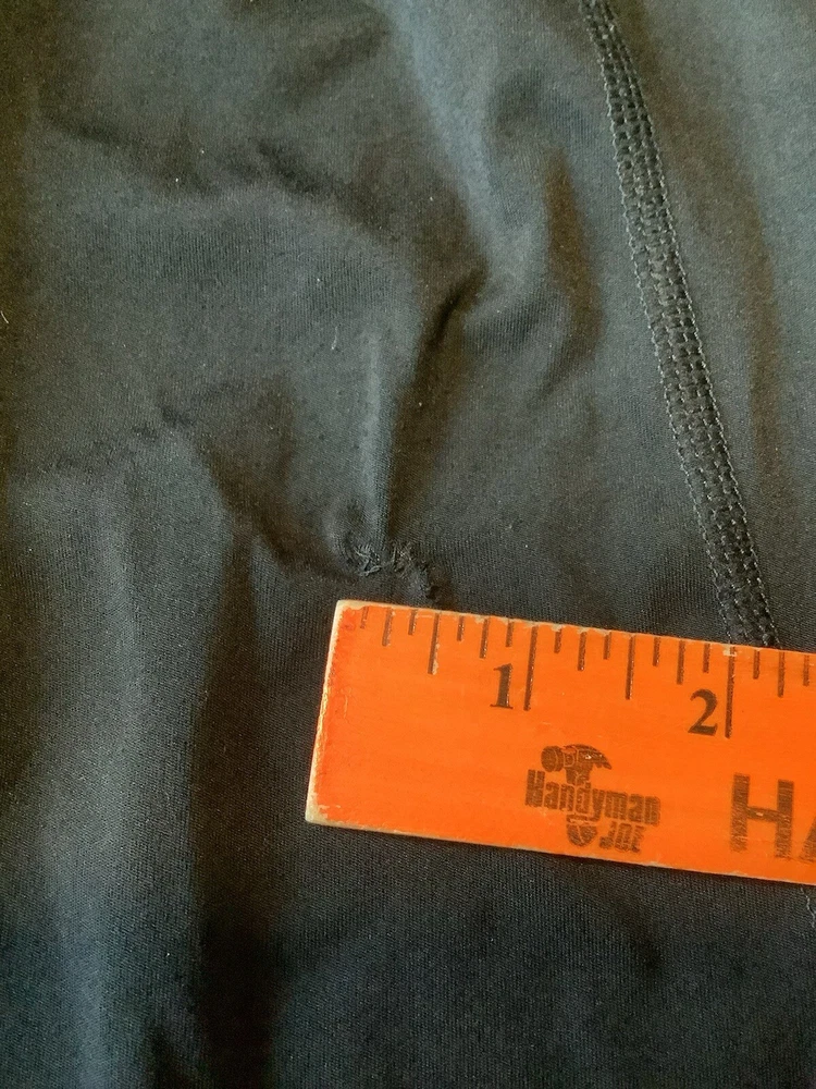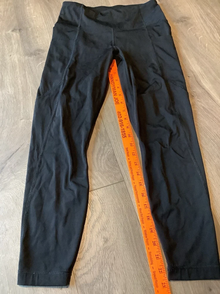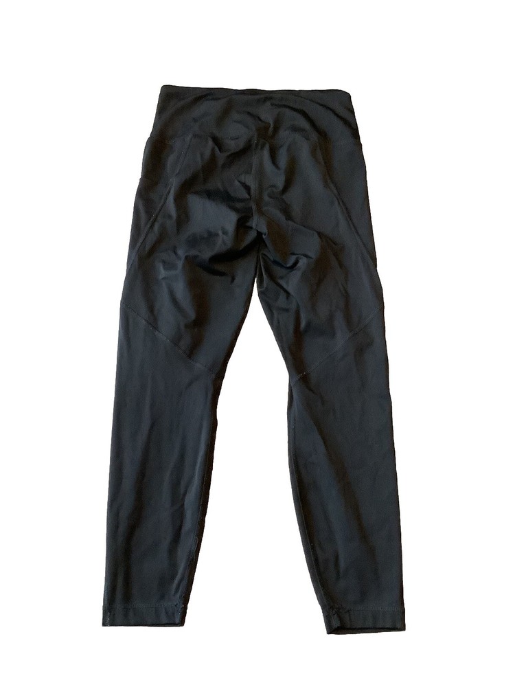 Elevate your activewear game with these Members Mark Women's Black Everyday Athletic Ankle Leggings. Designed with comfort, stretch, and breathability in mind, these leggings are perfect for all your favorite activities, from running to yoga. The elastic waistband and tapered leg style provide a flattering fit, while the media pocket and easy care features add convenience. Made from a blend of nylon and spandex, these leggings are machine washable and have a solid pattern with a black color. They are suitable for travel, casual wear, and activewear, making them a versatile addition to your wardrobe. With a size of M and a waist size of 24 inches, these leggings are perfect for everyday use. I did stitch a hole in the left knee - see photo- otherwise the leggings are in good condition. Pet free and smoke free household