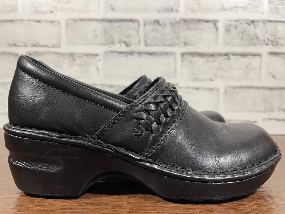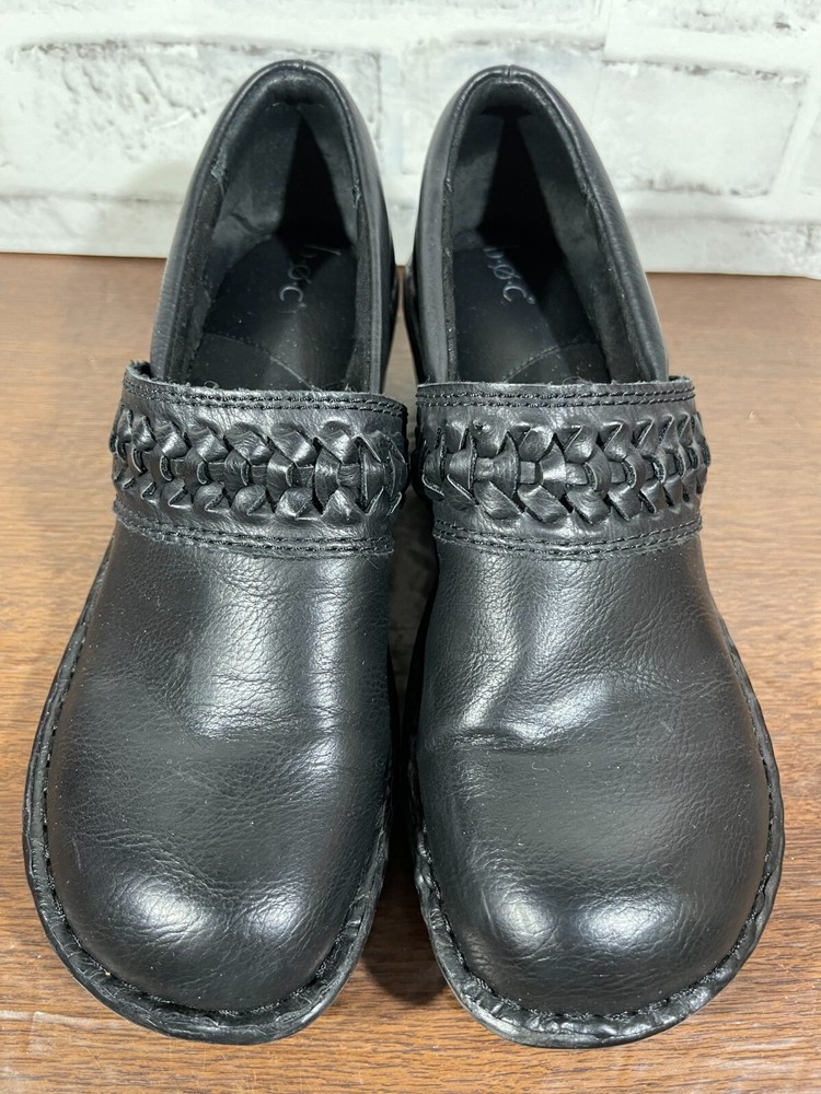 Brand: Børn Accents: Strap Performance/Activity: Driving, School, Walking Lining Material: Fabric Upper Material: Vegan Leather Model: Born B.o.c Toe Shape: Round Toe US Shoe Size: 7.5 Type: Casual Shoe Shaft Style: Low Top Features: Vegan Color: Black Heel Style: Block Pattern: Solid Insole Material: Faux Leather Theme: Bohemian, Classic, Modern, Occupational Country/Region of Manufacture: China Shoe Width: Standard Department: Women Occasion: Casual, Travel, Workwear Outsole Material: Rubber Handmade: No Seller Notes: “Very good preowned condition with normal preowned wear and no issues. Please see all photos.” Closure: Slip On Style: Clog Season: Fall, Spring, Summer, Winter