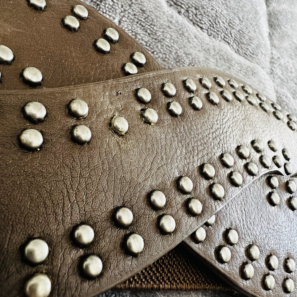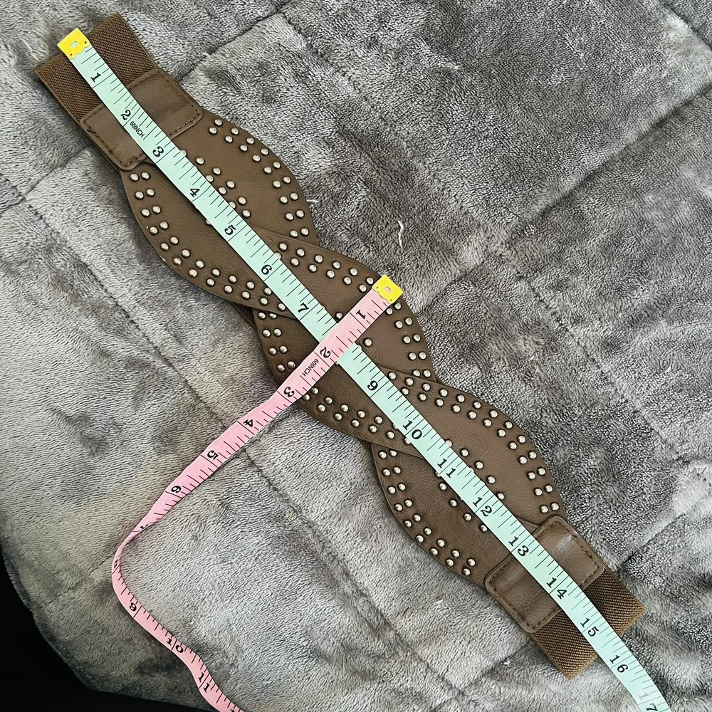 This women's belt is made of brown vegan faux leather and features a studded wide braided elastic design. It is suitable for waist sizes up to 32 inches. The belt has a stretch feature for added comfort and has a snap closure at the back. There is one stud missing. See photo(s) for measurements. Color in photos may not be an accurate respresentation of actual color due to lighting. ABOUT ME: • I accept reasonable offers • Next business day shipping • New items posted daily • Smoke free home