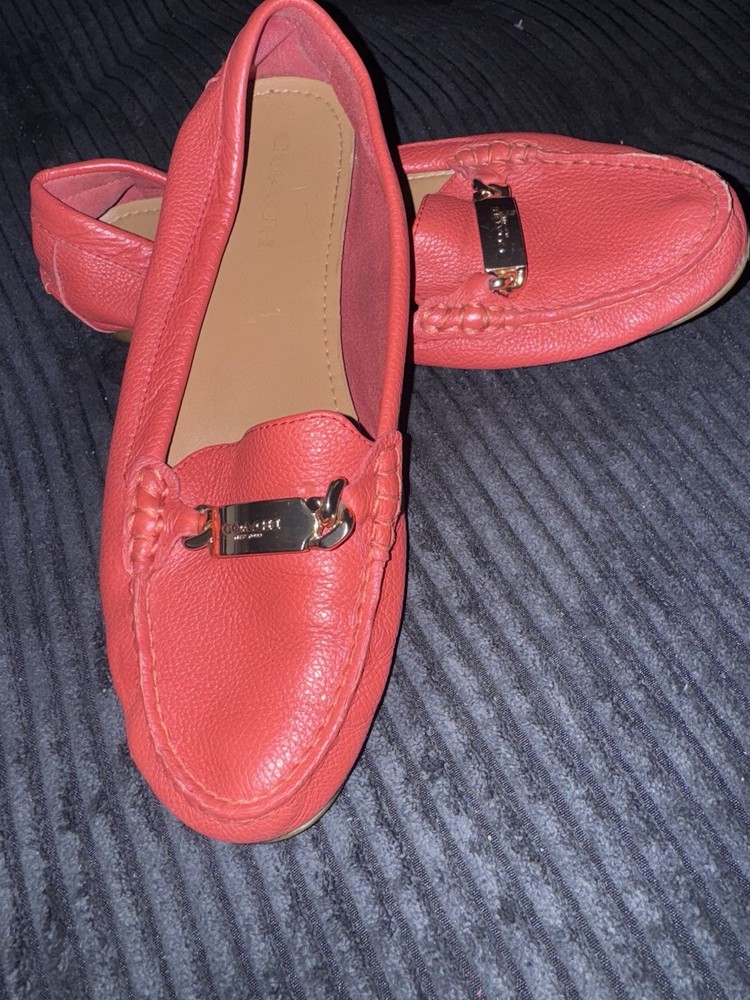 These Women's Coach Red Leather Bit-Detail Loafers in size 9 are a stylish and versatile addition to any wardrobe. Made with high-quality leather, these slip-on loafers feature a solid red color and intricate bit detailing, adding a touch of sophistication to a casual outfit. The comfortable B width and flat design make them perfect for all-day wear, while the Coach Signature product line ensures both quality and style. Whether it's for a summer picnic, fall outing, or spring dinner, these loafers are a chic choice for any season.