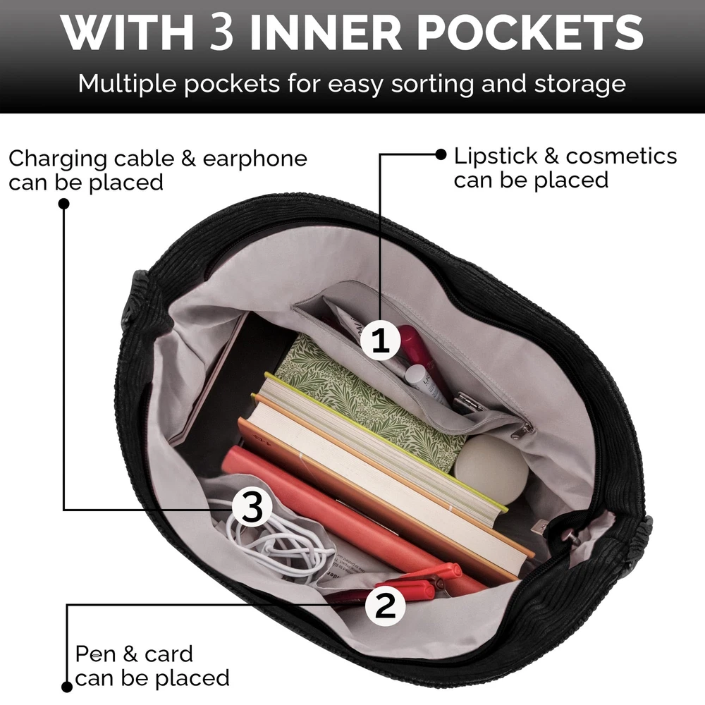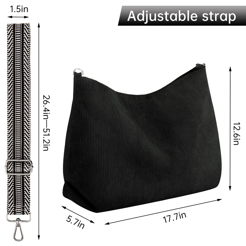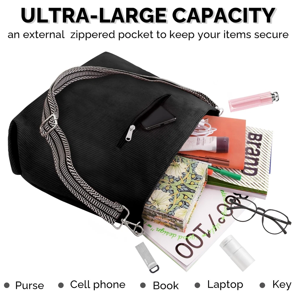 【Large Capacity】 17.7x12.6x4 inches. Corduroy Tote Bag is designed with a spacious interior, allowing you to carry all your essentials and more. Say goodbye to the hassle of constantly switching bags and embrace the convenience of a generous storage space. 【Outside zipper pocket】 We have thoughtfully added a outside zipper pocket to provide easy access to your small essentials. No more rummaging through the main compartment to find your keys or phone. Keep your essentials within reach and save time and frustration. 【Interior zipper pocket and two slip pockets】 Main compartment comes with one interior zipper pocket and two slip pockets. Keep your valuables secure and within easy reach. Whether it's your wallet, laptop, or books, you'll always know where to find them. 【Adjustable shoulder strap】 Our tote comes with an adjustable shoulder strap, allowing you to wear it comfortably and effortlessly. Adjust the strap to your preferred length and carry it as a shoulder bag or crossbody. Say goodbye to uncomfortable straps and hello to a customized fit. 【Versatile Style】 Whether you're heading to work, running errands, or going out for a casual outing, Corduroy Tote Bag effortlessly complements any outfit. Its timeless design and neutral color options make it a versatile accessory, suitable for any occasion.