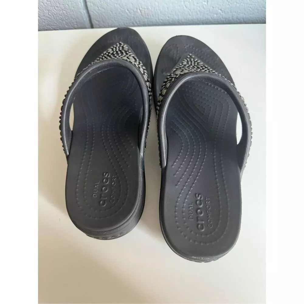 Women’s Crocs Monterey Diamanté Slip On Embellished Wedge Sandal in Black Size 9 Decorative studs and rhinestones accents. Open toe. Comfort, cushioned footbed. Lightweight. outer material: Rubber closure type: Slip-On material : Croslite Runs true to size