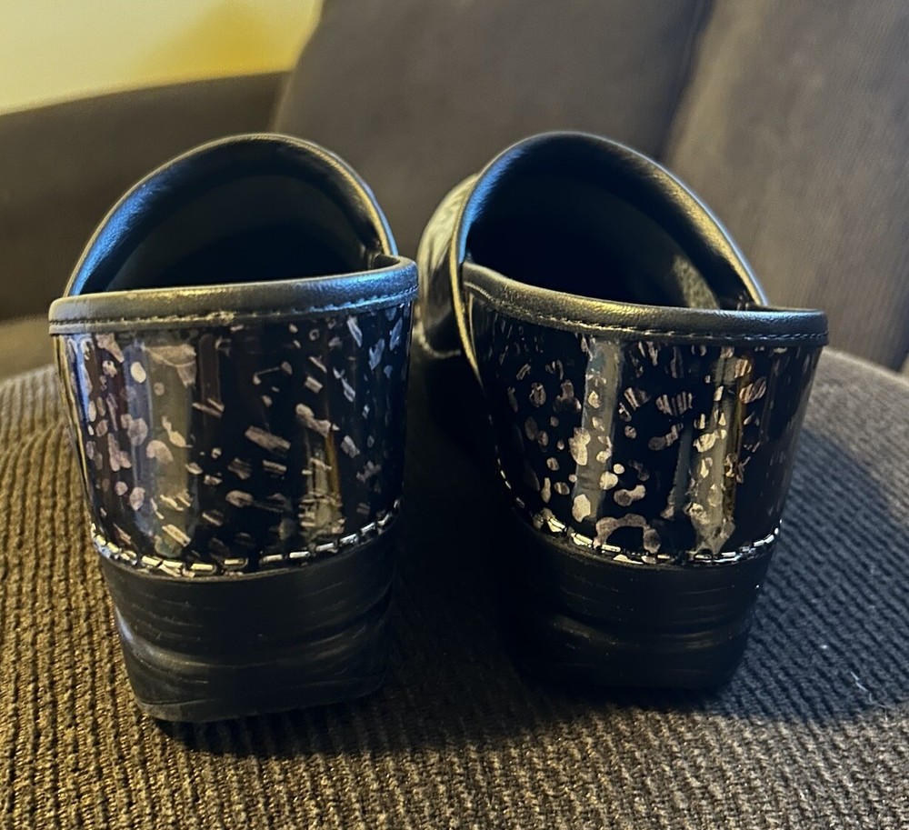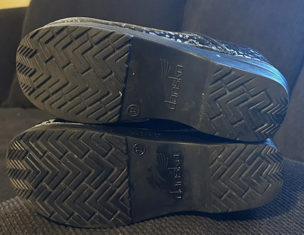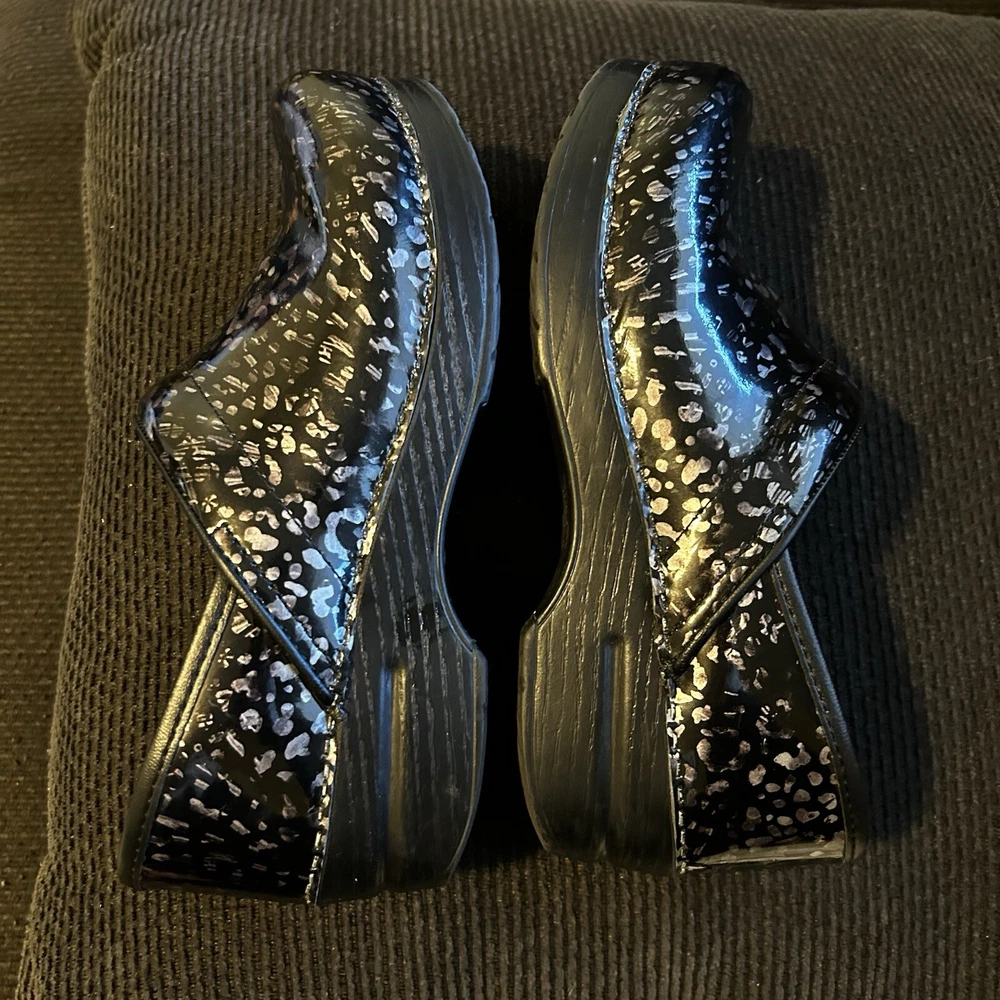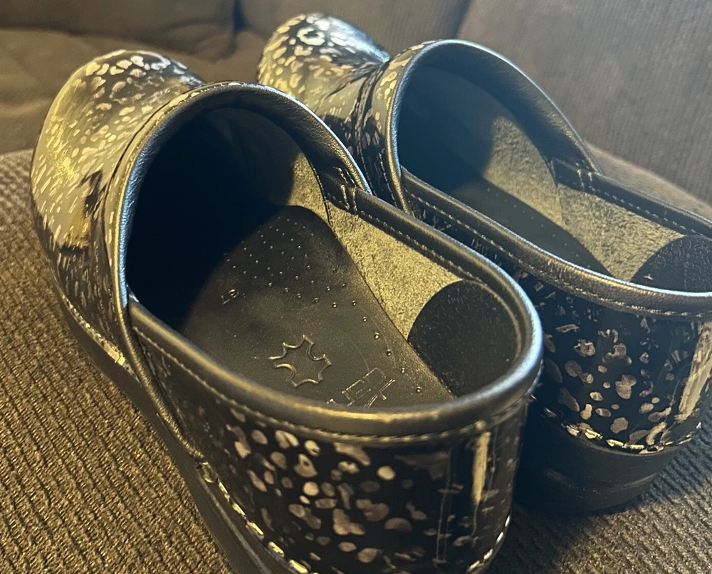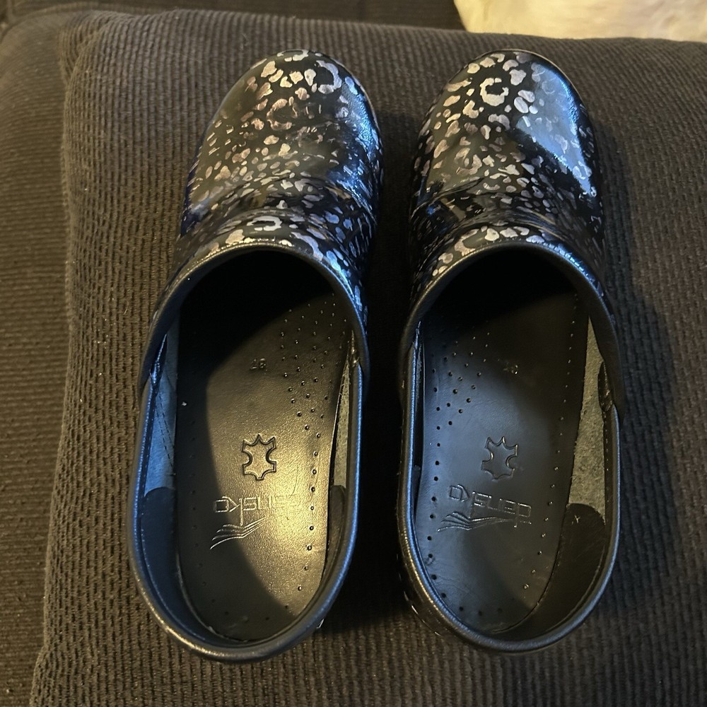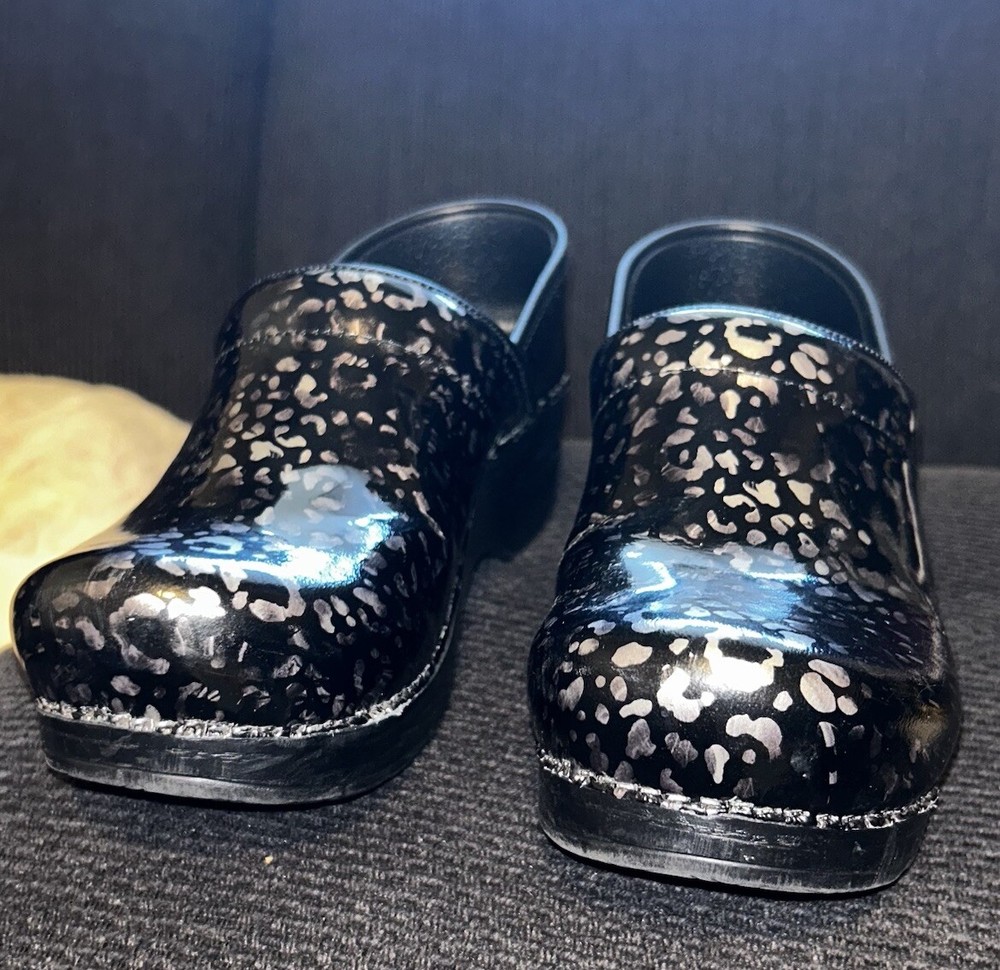 No major flaws if any ! They are in great condition , super comfortable ! These women's DANSKO Professional clogs are stylish and comfortable in a pewter leopard patent leather design, perfect for sizes 6.5-7. Featuring a round toe shape, slip-on closure, and low block heel, they are ideal for casual wear, work, or travel. The clogs are made with slip-resistant rubber outsoles, breathable leather lining, and a leather insole for added comfort. With a modern animal print pattern and Dansko logo accents, these clogs are a versatile choice for any season or occasion.