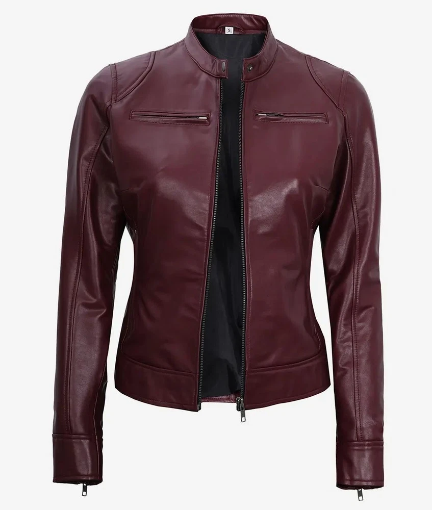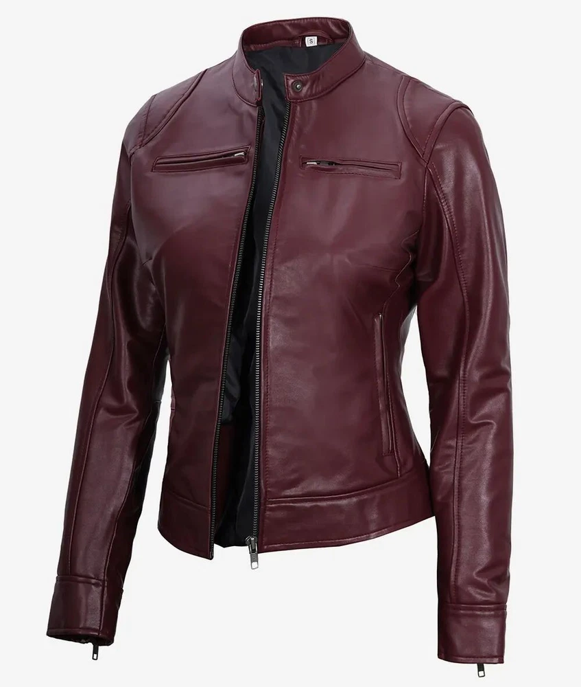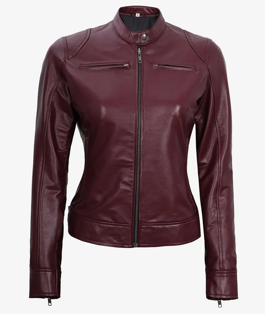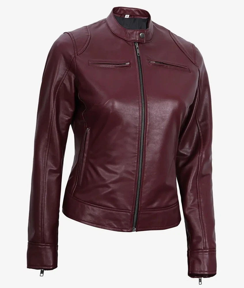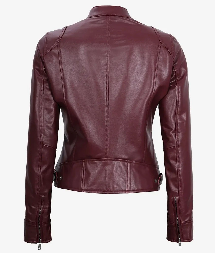 Women's Designer New Slim Fit Moto Biker Genuine Sheepskin Maroon Leather Jacket Product Descriptions: Material: 100% Genuine Sheepskin Leather Internal: Soft Skin Friendly Polyester Lining Colour: Maroon Style: Moto-Biker Style Front: Zipper Closure Front Features: Waist Adjuster Collar: Snap Button Collar Cuffs: Zipper Cuffs Pockets: Four Pockets Outside & One Pocket Inside Stitching: Excellent Quality Care: Dry Clean Only
