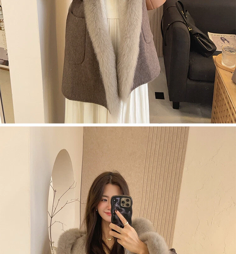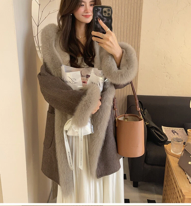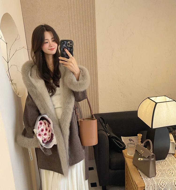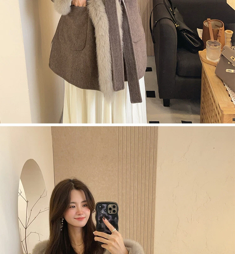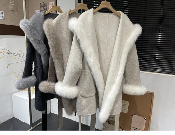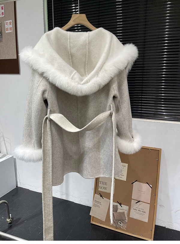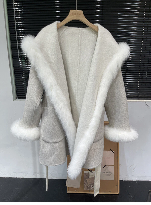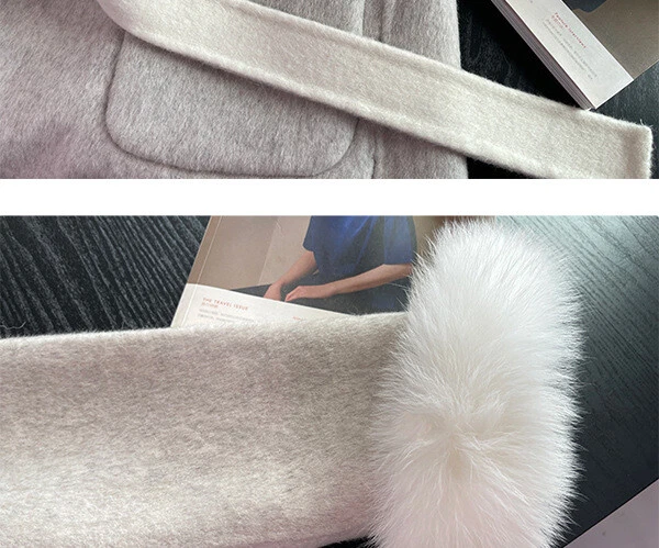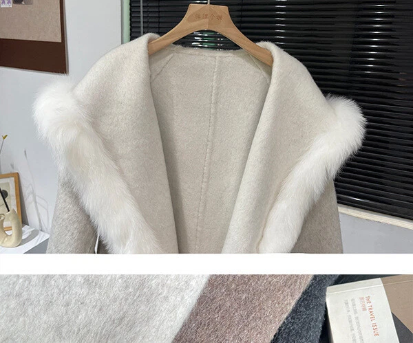 $ 80.8Women's Wool Cashmere Trench Coat with Fox Fur Trim Double-Sided Jacket