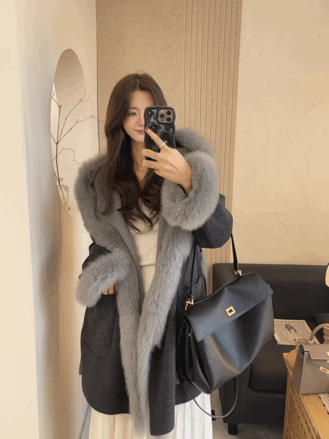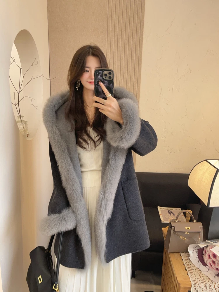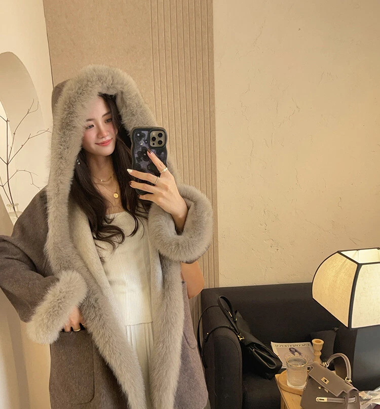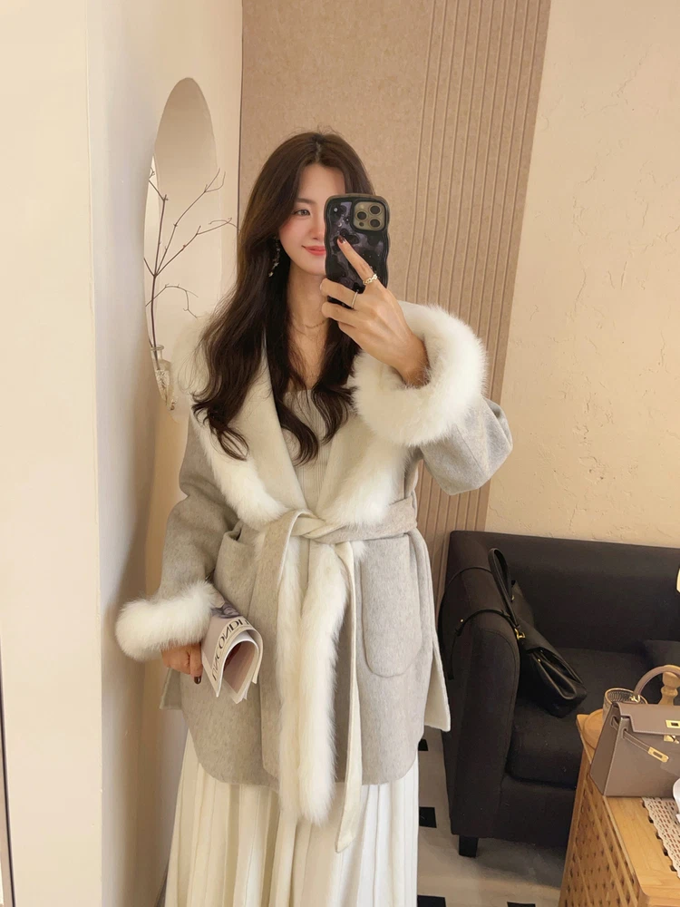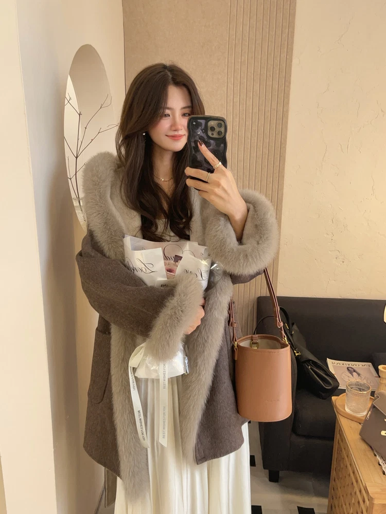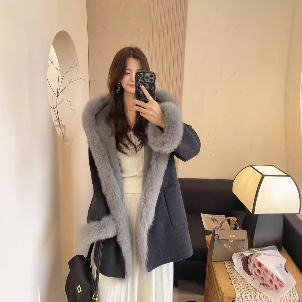 $ 80.8Women's Wool Cashmere Trench Coat with Fox Fur Trim Double-Sided Jacket