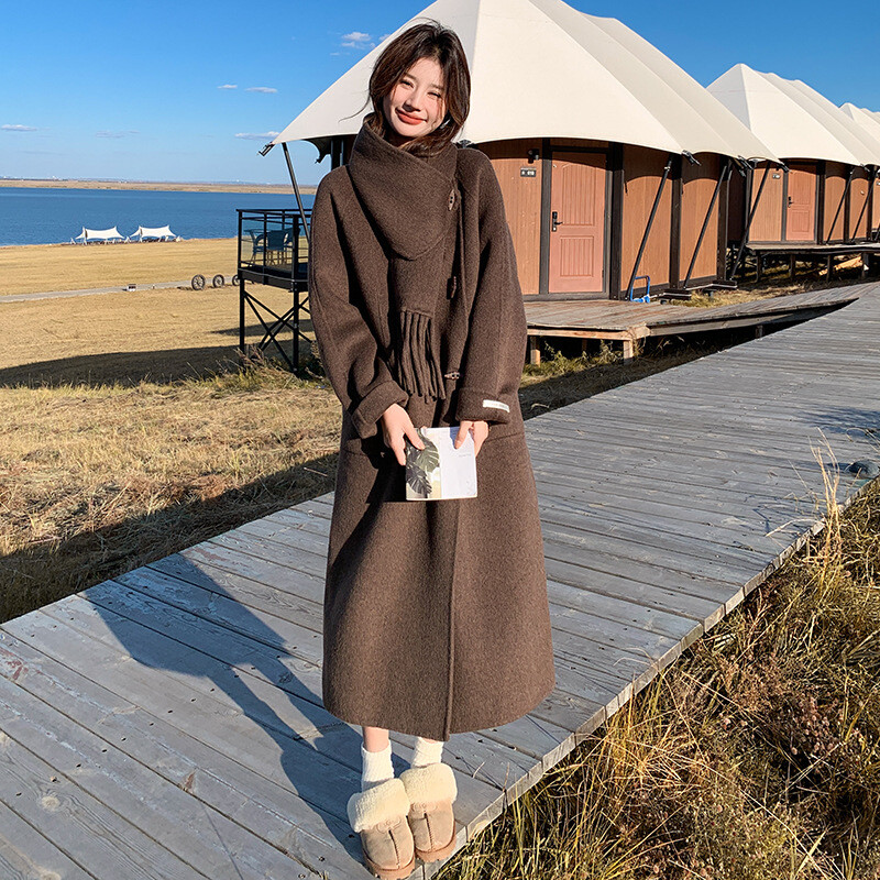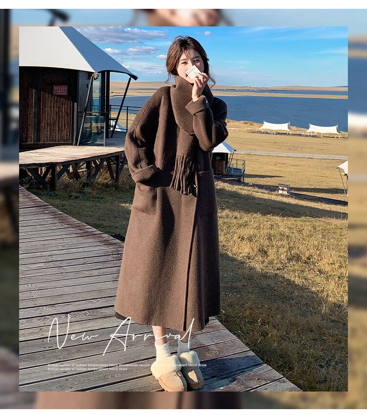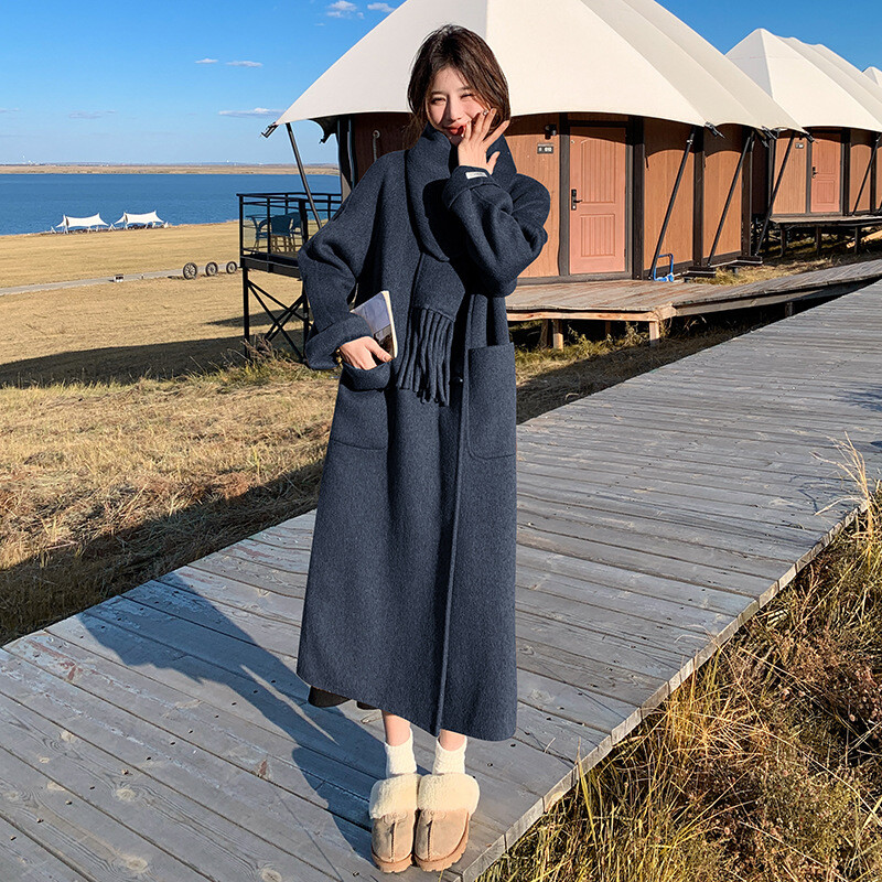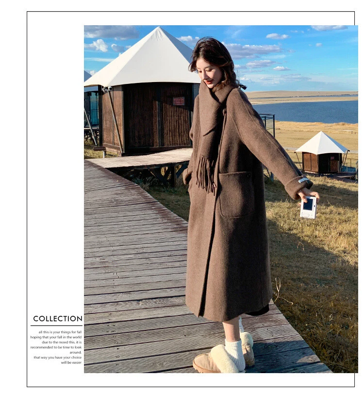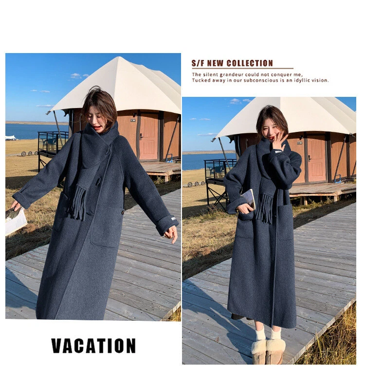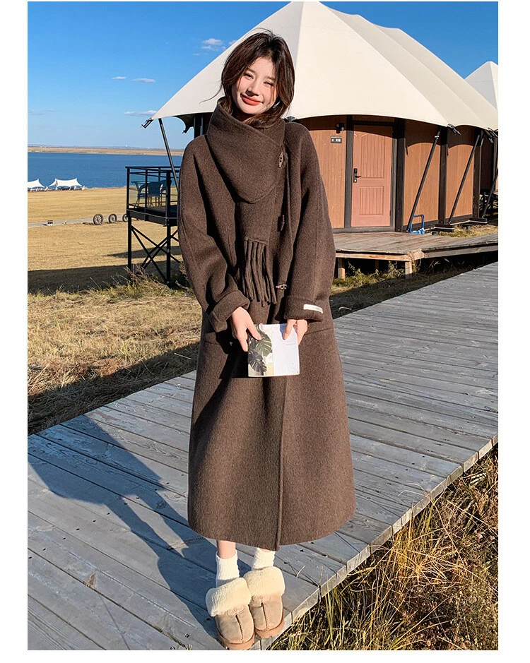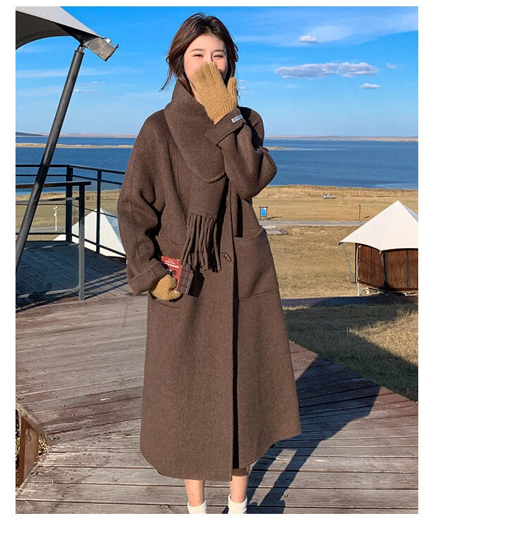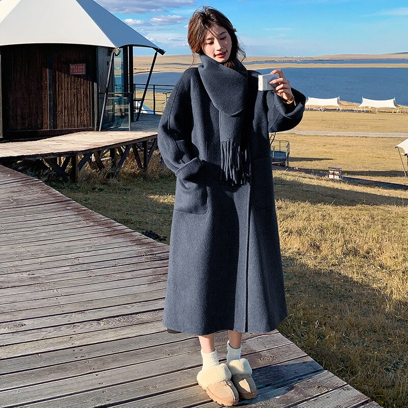 Women's Double-Sided Wool Trench Coat Winter Korean Loose Fit with Scarf