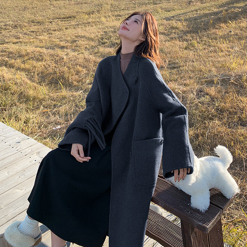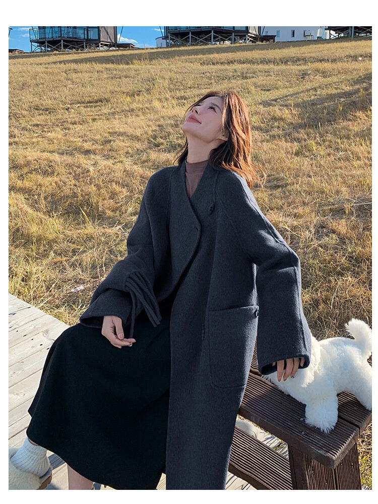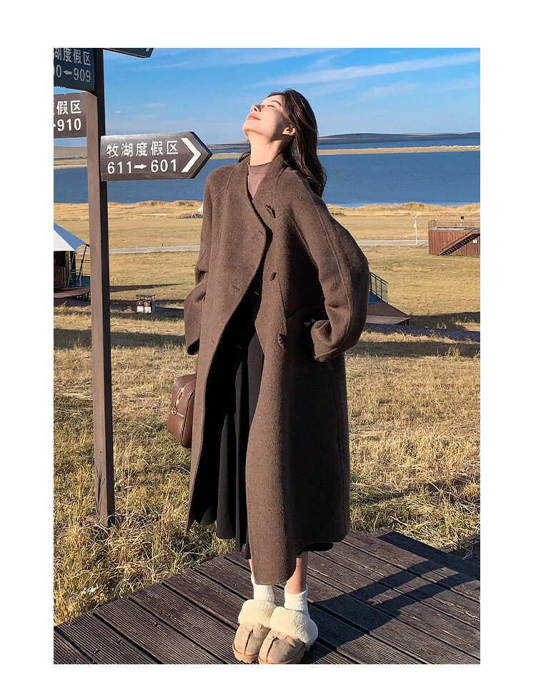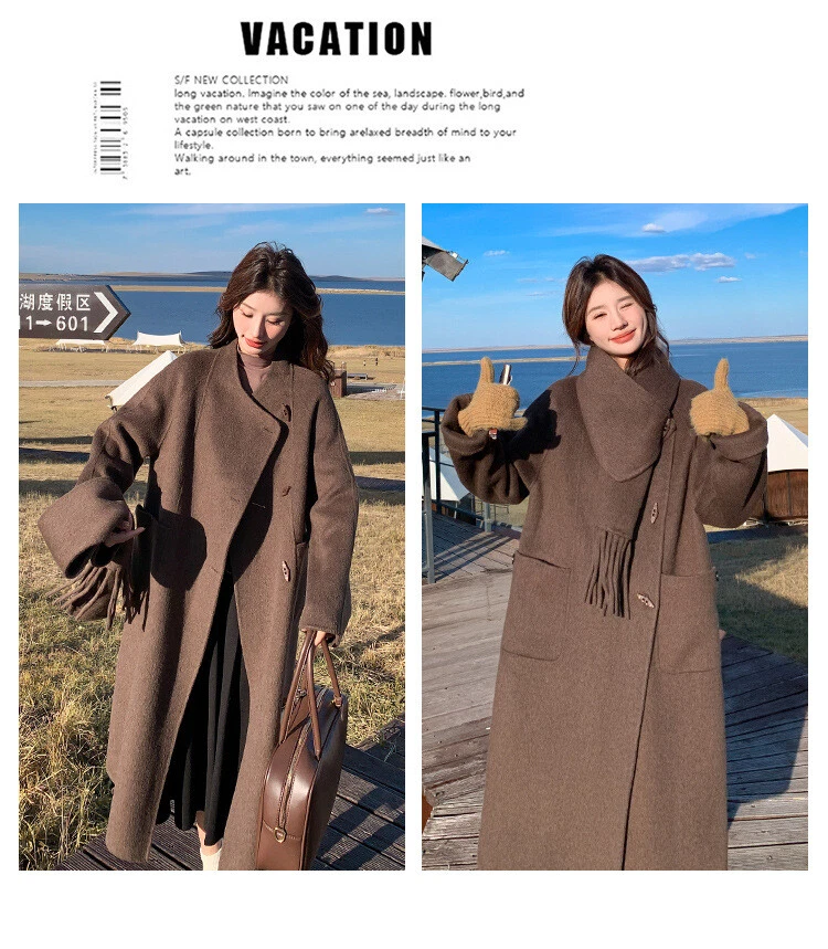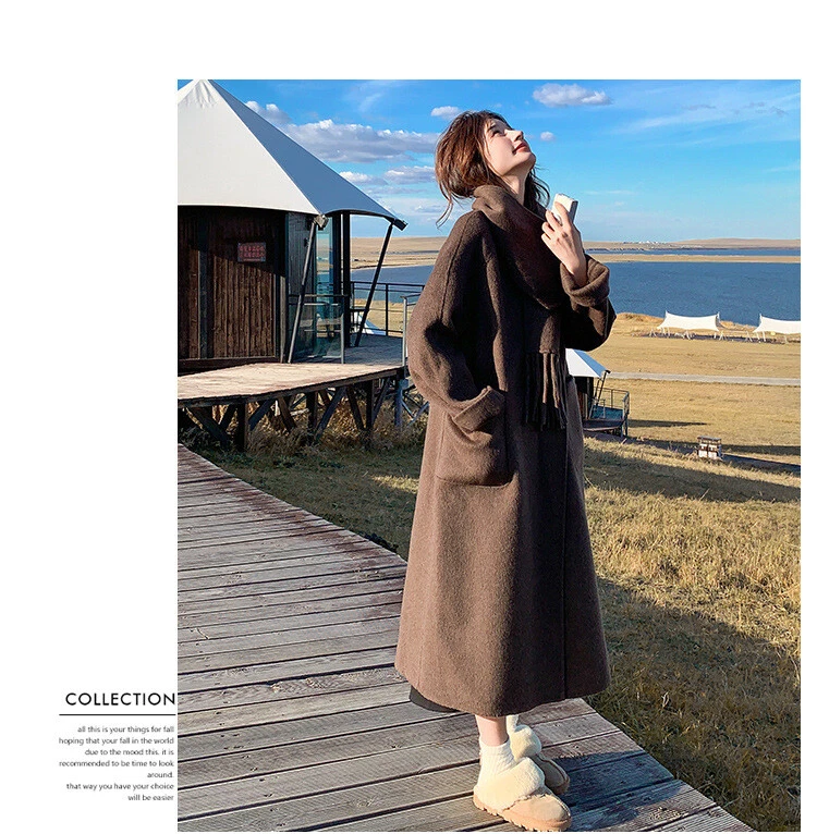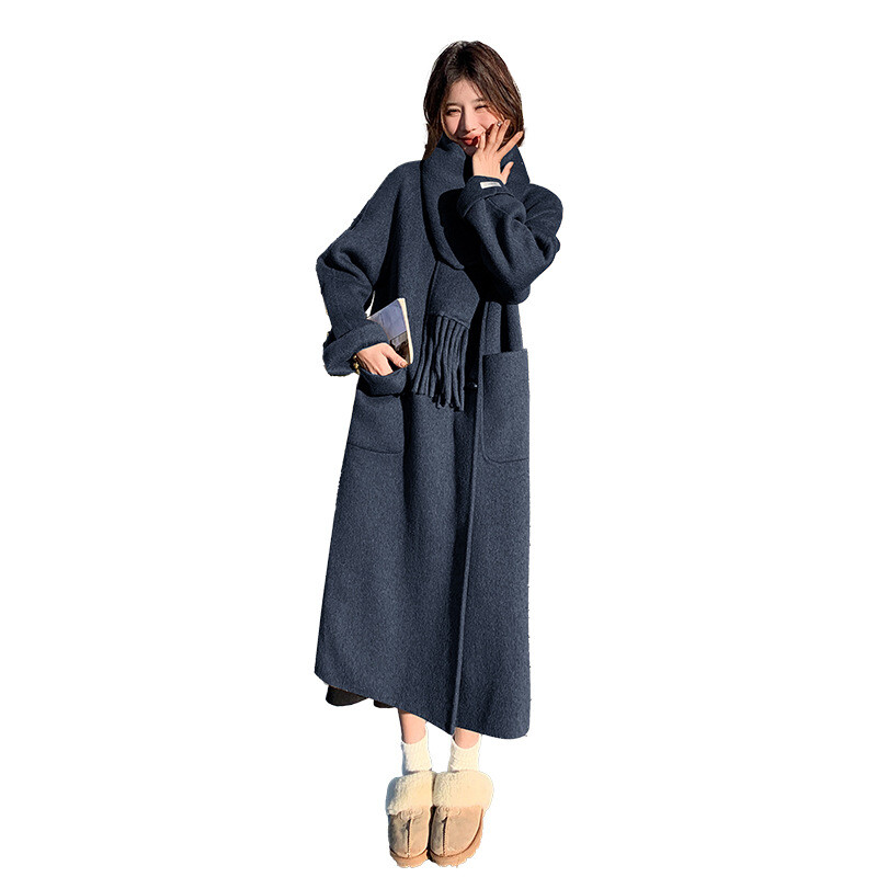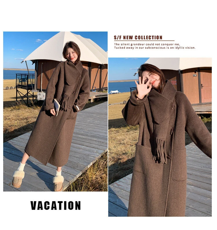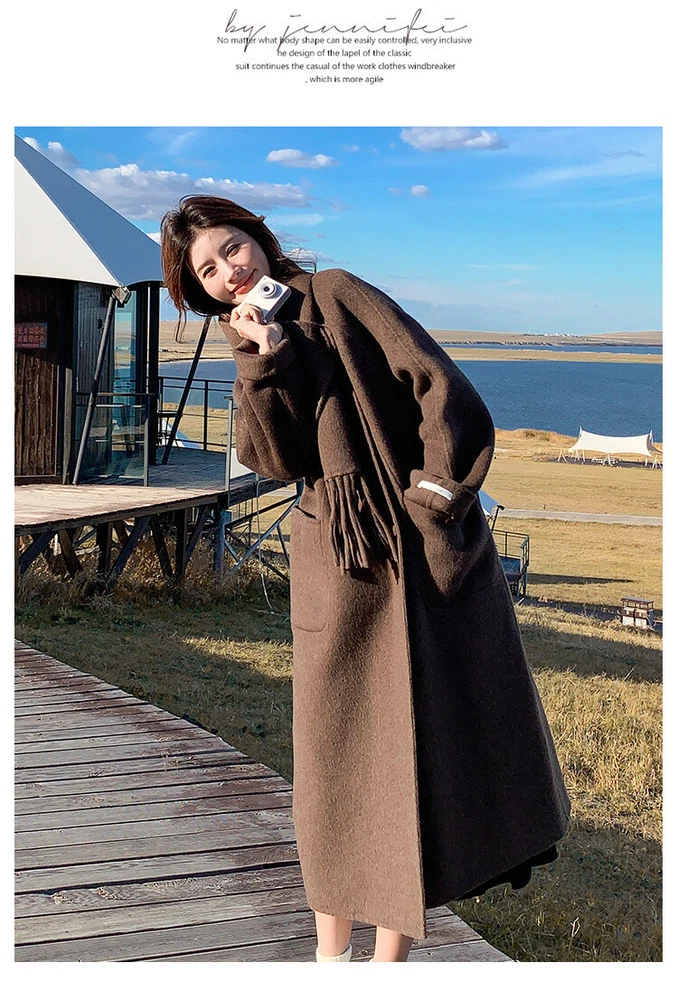 Women's Double-Sided Wool Trench Coat Winter Korean Loose Fit with Scarf