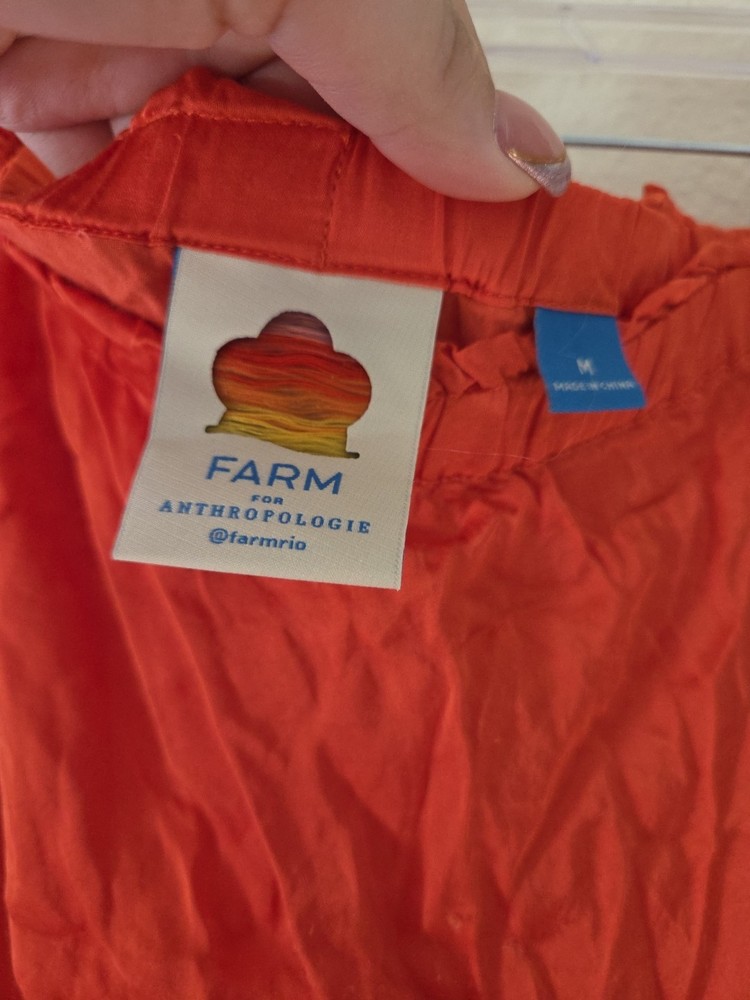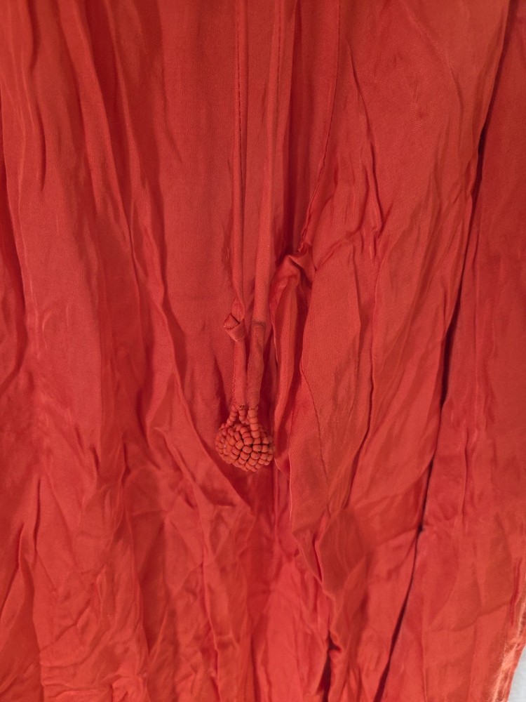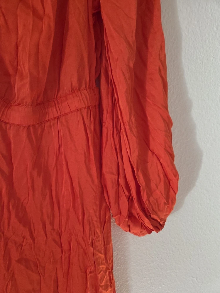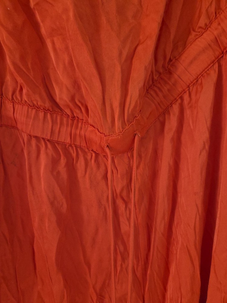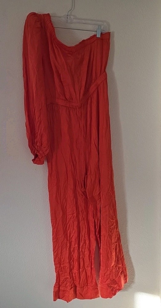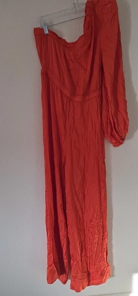 The product is a women's Farm Rio Anthropologie orange satin one shoulder jumpsuit in size M. It features a solid pattern, long sleeves, one shoulder neckline, and a pull-on closure. This stylish jumpsuit is perfect for various occasions including travel, weddings, parties, casual outings, and formal events. Made from polyester satin fabric, it is lightweight, breathable, and has tasseled accents. The jumpsuit has a straight leg style and is designed to offer a regular fit for a comfortable and flattering look. Pit to pit 19 in