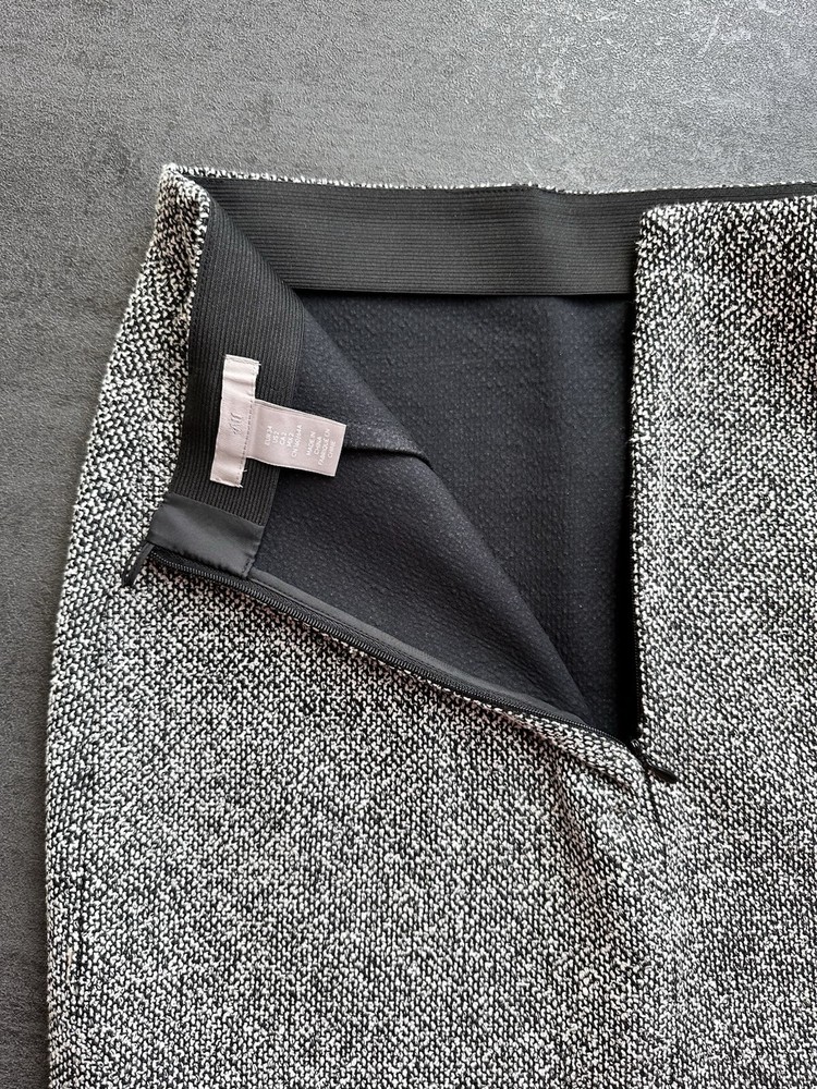 Women's Tweed Gray Mini Skirt by Zara. This is a short, mini skirt in size XS made of polyester and cotton. It has a zip closure and is suitable for party/cocktail or casual occasions. The skirt is designed in a tweed fabric, perfect for winter, summer, fall, and spring seasons.