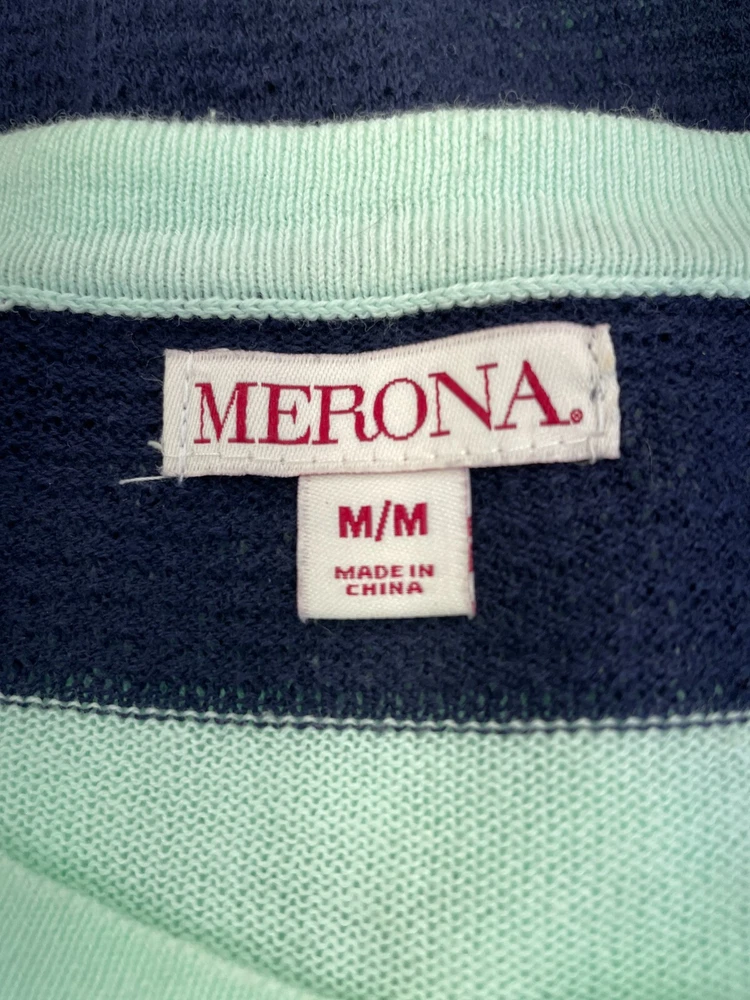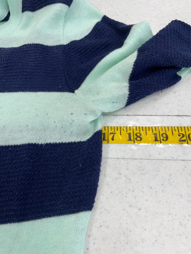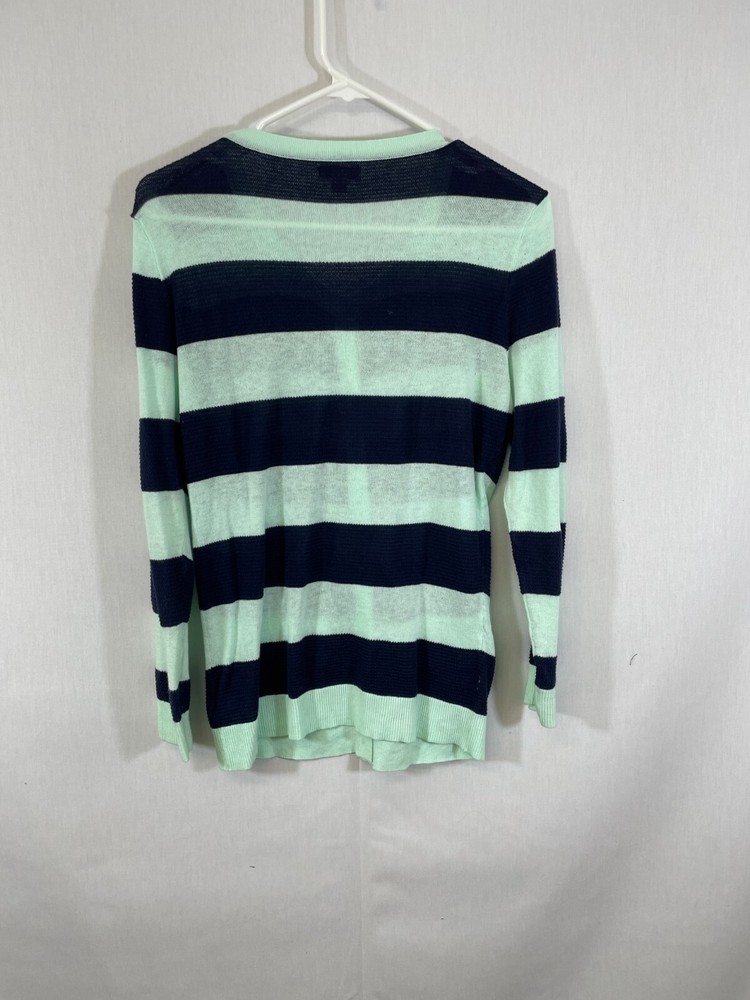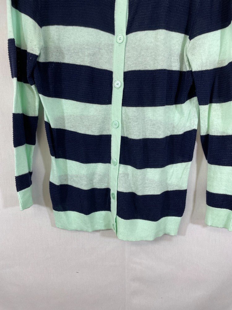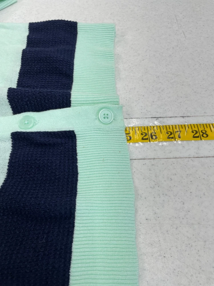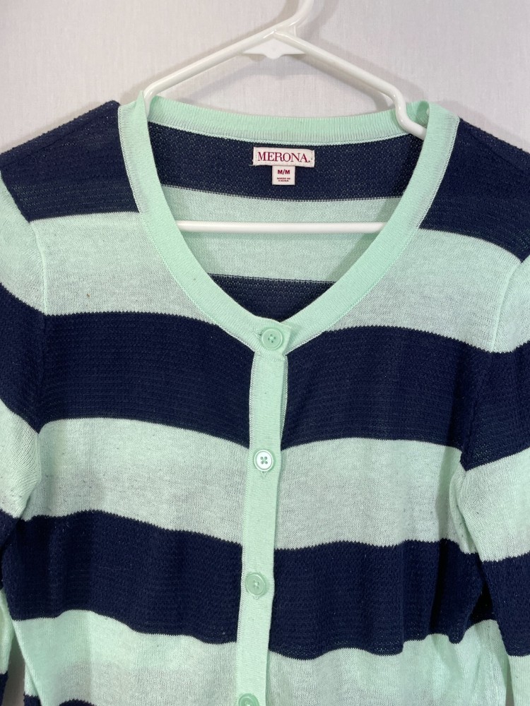 Merona Womens Green Blue Striped Long Sleeve Button Front Cardigan Sweater Sz M Brand: Merona Department: Women Color: Green, Blue Size: Medium Type: Sweater Style: Cardigan Pattern: Striped Sleeve Length: Long Sleeve Material: 100% Cotton Closure: Button Occasion: Casual Fit: Regular Vintage: No Country/Region of Manufacture: China Condition: Pre-Owned, In Good Condition SKU: 1-0570-0030 Measurements Armpit To Armpit: 17" Length: 25" “Please examine and study all pictures carefully for damage, wear, condition, and missing parts and pieces. We try to state any defects but the items will arrive as they are pictured. Thank you for your purchase! Please check out our other listings. My Purpose Thrift's mission is to work and partner with various local ministries, organizations, and nonprofits to help facilitate and monetize physical donations. We carefully select items that are in good to great condition to sell online and offer you the best products and best service. Be assured that your purchase will help local ministries/charities! We are a registered 501(c)3 organization. All Offers will be considered.”