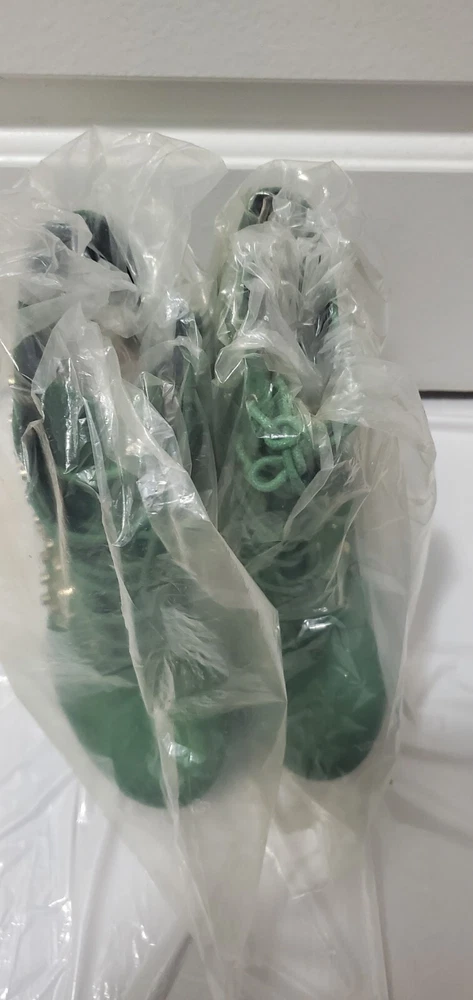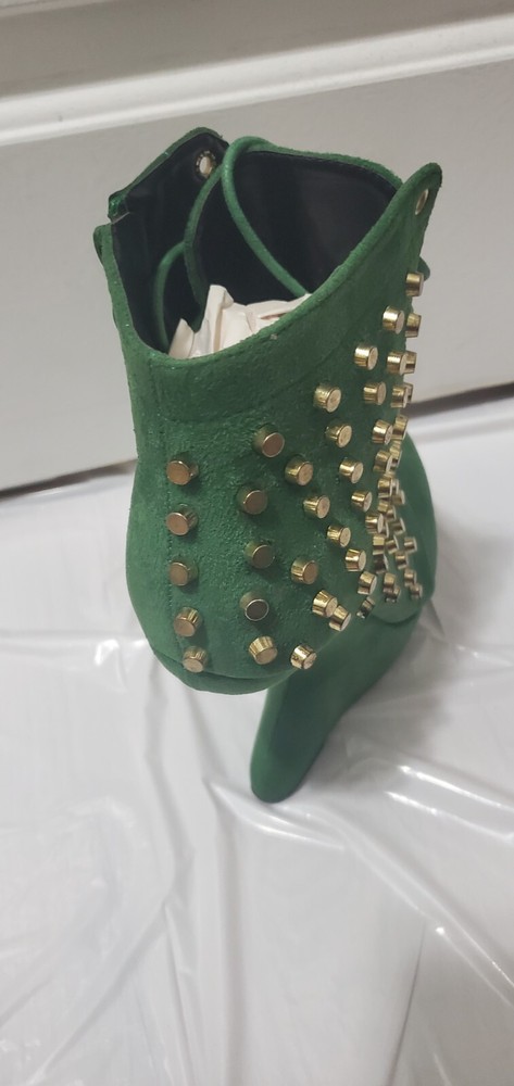 This is a stylish green bootie in size 8 with a round toe shape and a mid heel height of 2-2.9 inches. The bootie features a unique blunt metal studded pattern and a gravity wedge heel style, giving it a trendy and edgy look. It has a zipper closure for easy wear and is suitable for various occasions such as travel, parties, or formal events. The bootie is made of faux suede material with a faux leather insole, providing comfort and durability. The studded anti gravity design adds a vintage touch to the overall metal-themed style of the shoe.