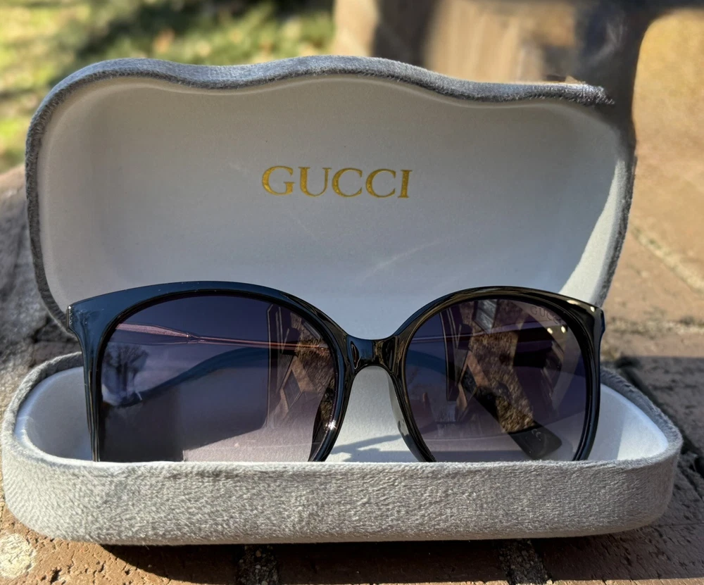 These women's Gucci sunglasses have an oversized frame in black, making a bold and stylish statement. The model number is GG1719 56 21-142, showcasing the iconic Gucci design and craftsmanship. Perfect for adding a touch of luxury to any outfit, these sunglasses are a fashionable accessory for women looking to elevate their style.