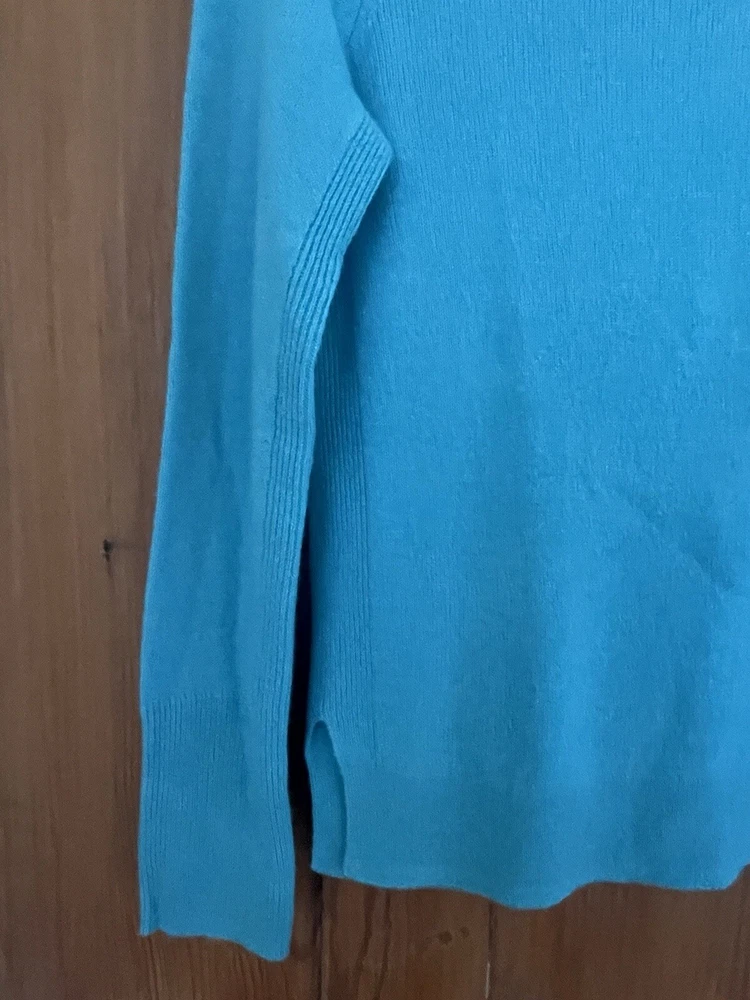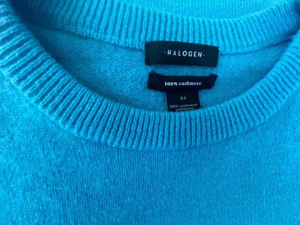 Beautiful turquoise blue cashmere sweater from Halogen. Size extra small. Crew neck. Long sleeves. Ribbed detail and hems. Vents at side seams. 100% cashmere. Dry clean. Mint condition. Pit to pit 18 inches Sleeve length from pit to hem 18 inches Back length from neck to hem 25 inches