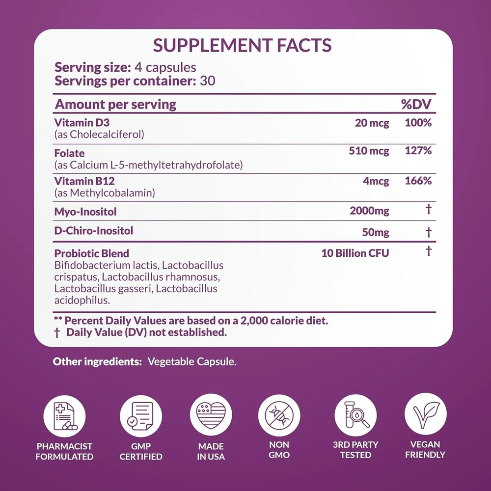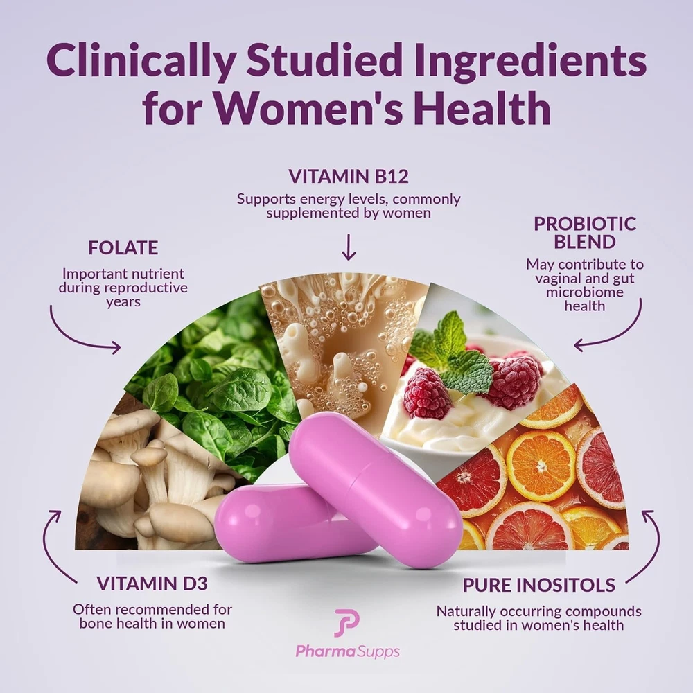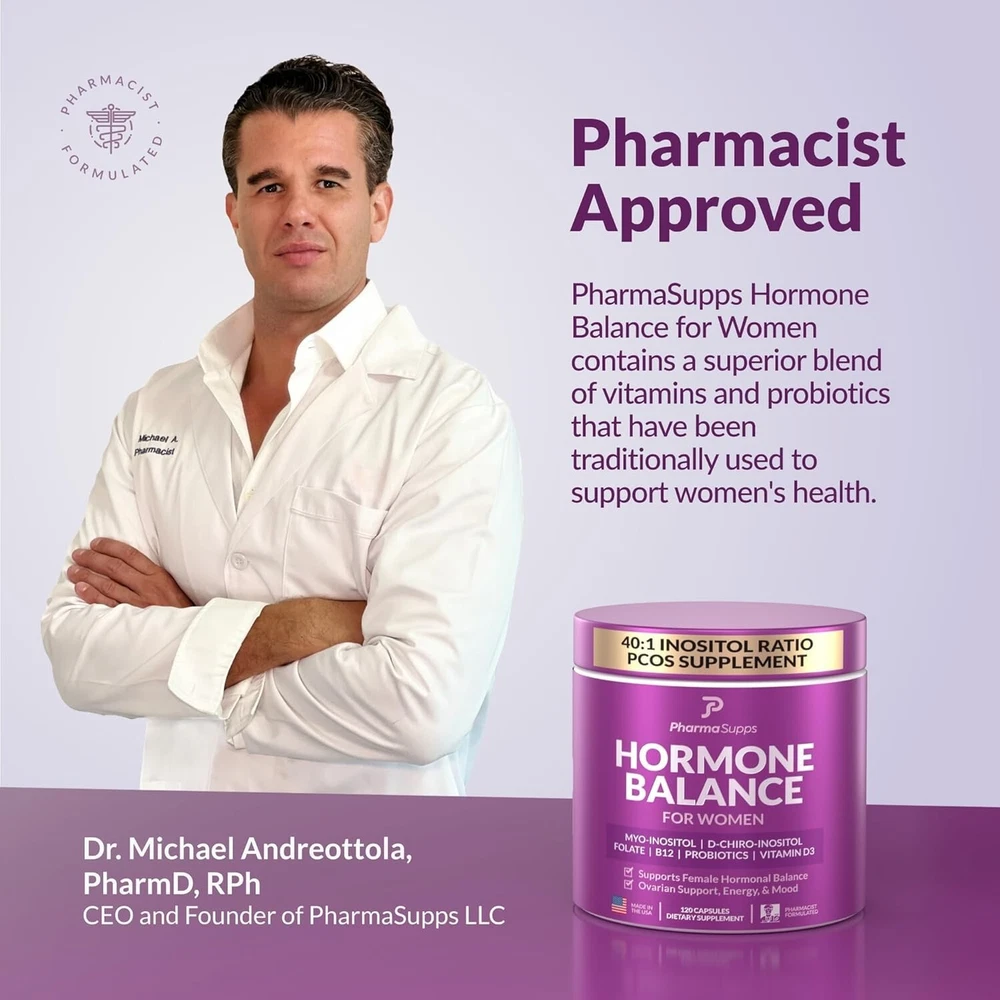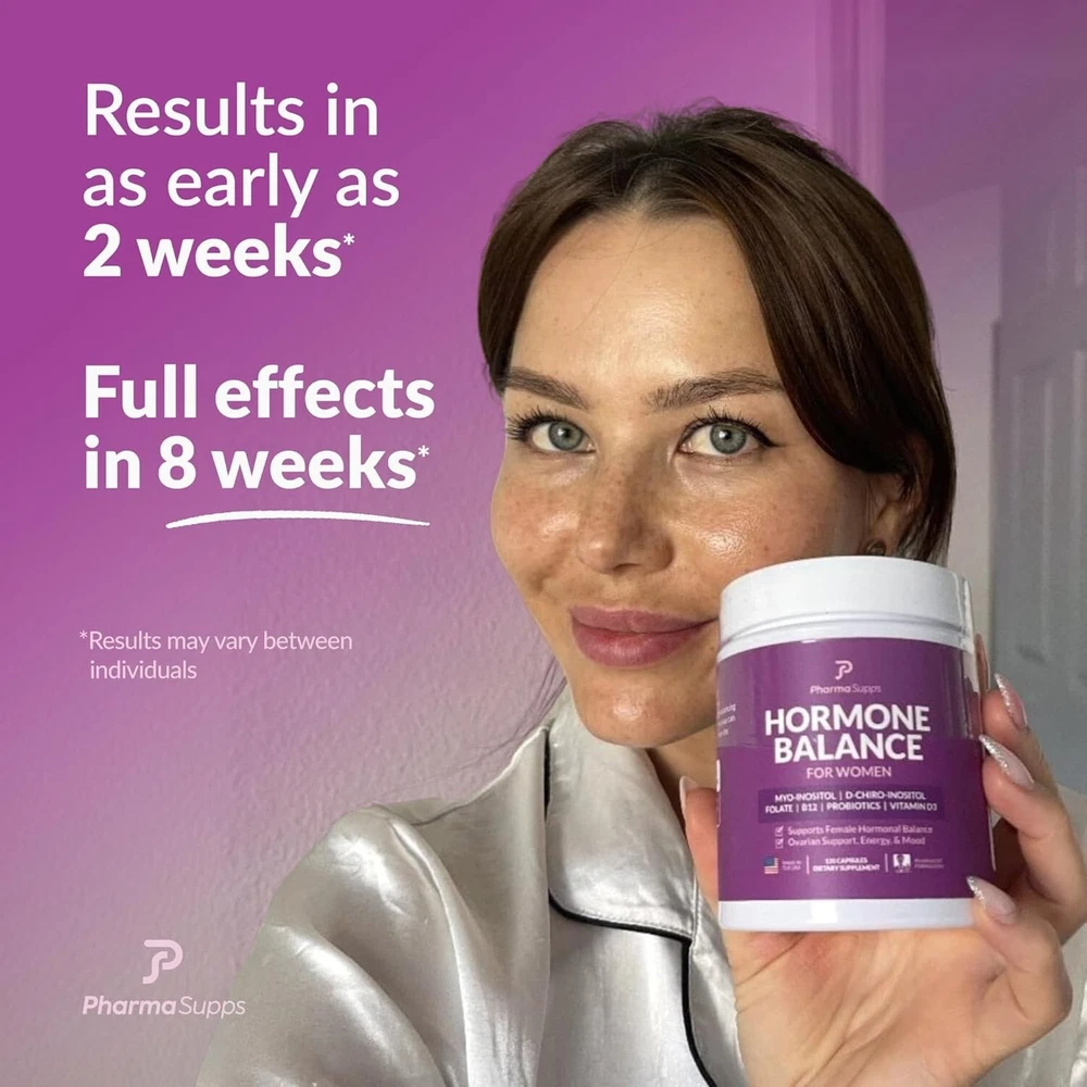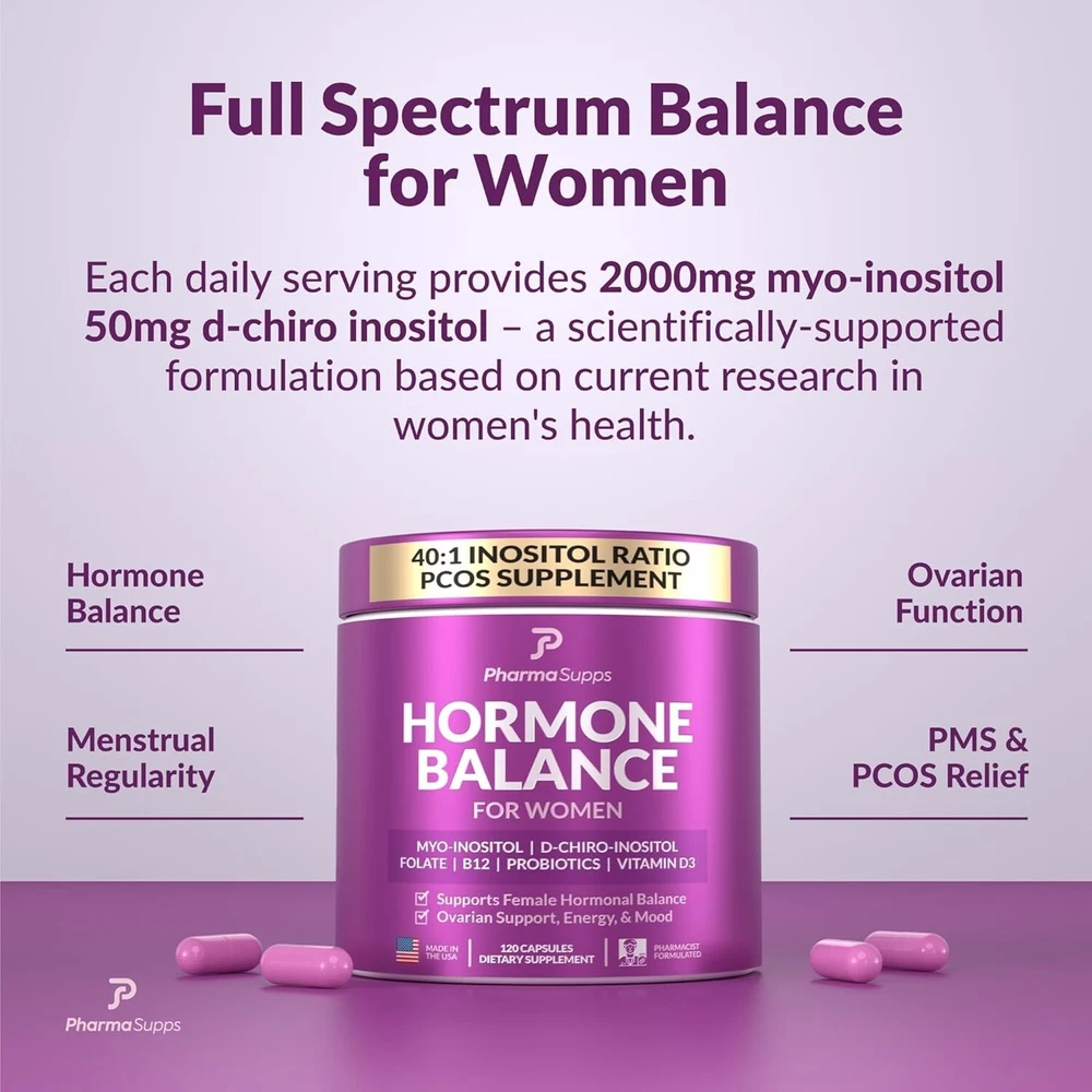 Our scientifically formulated supplement features a unique combination of Myo-Inositol, D-Chiro-Inositol, and probiotics to support hormonal balance, reproductive health, and digestive wellness. Key Benefits: Hormonal Balance for Women: Tailored to support perimenopausal women, pre-menopause, and women of all ages, promoting natural hormonal harmony. PMS & Mood Support: Enriched with B12 and Folate, this supplement helps ease PMS symptoms and mood swings, fostering overall emotional well-being. PCOS & Ovarian Health: With 2000mg Myo-Inositol and 50mg D-Chiro-Inositol, our blend targets PCOS and ovarian support, balancing estrogen levels for enhanced reproductive health. Gut-Hormone Connection: A potent 10 Billion CFU probiotic blend supports digestive health, recognizing the crucial link between gut and hormone health. Vegan, Non-GMO & Allergen-Free: Made in the USA under strict GMP guidelines, our formula ensures quality you can trust, with no added allergens. Each bottle contains 120 capsules, providing a full 30-day supply for consistent hormonal and digestive support. Take control of your wellness journey with PharmaSupps Hormone Balance for Women—crafted to help you feel your best every day.