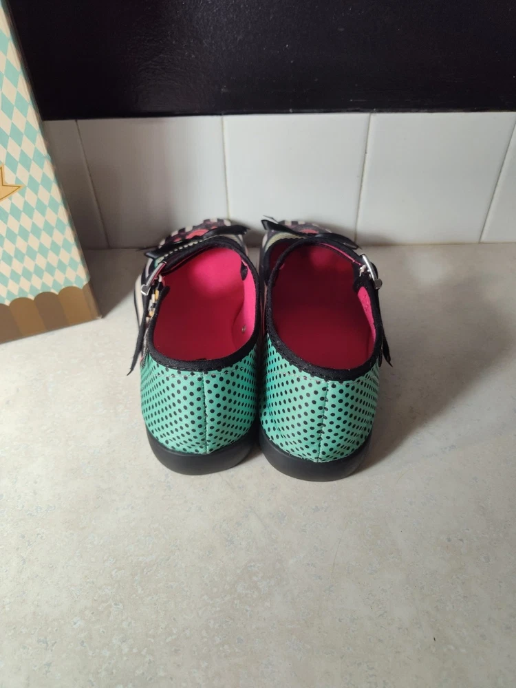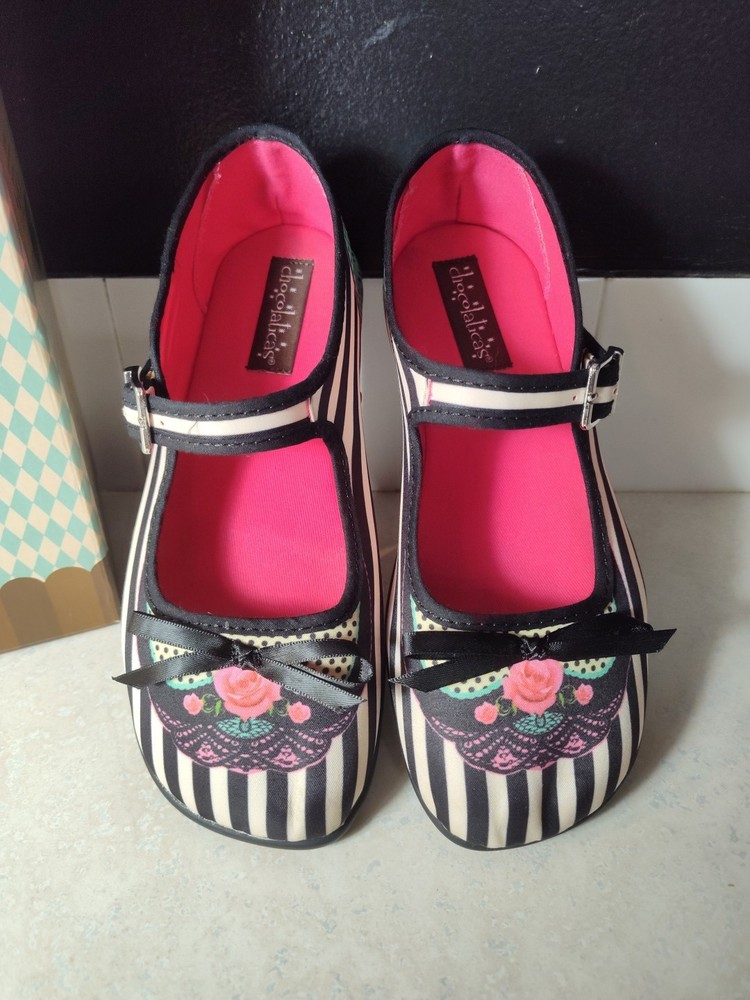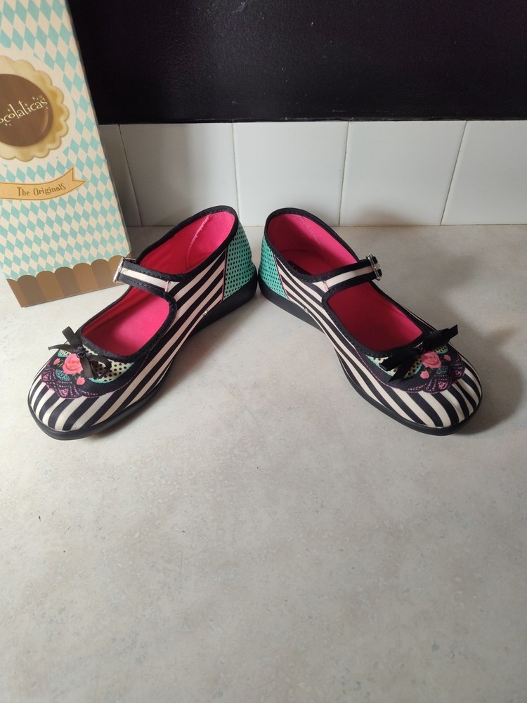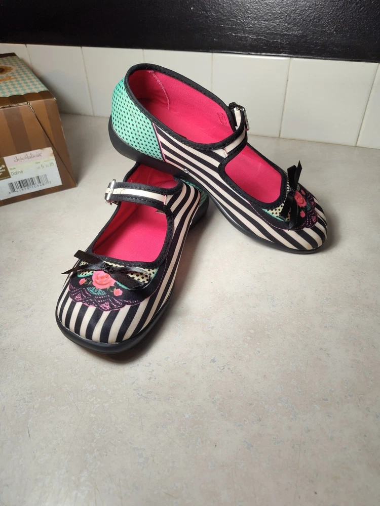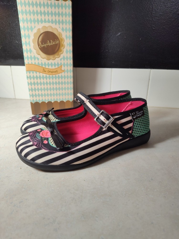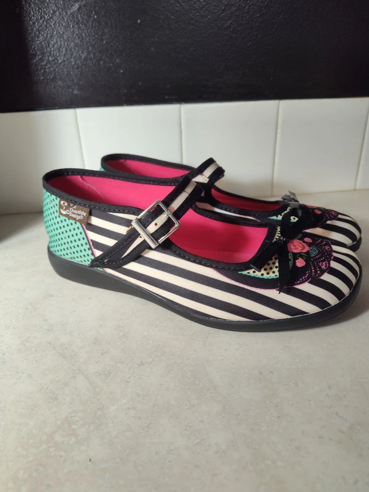Very excellent used condition. Must see photos! Step out in style and comfort with the Women's Hot Chocolate Design Chocolaticas Daphne Shoes. These funky multicolor flats boast an adjustable strap with a buckle, ankle strap, and a round toe shape that provides a perfect blend of support and flexibility for all-day wear. The cushioned insole and breathable fabric lining ensure your feet stay comfortable, whether you're running errands or enjoying a casual party. Designed to match a variety of occasions, from activewear to casual outings, these shoes are as versatile as they are fashionable. The durable fabric upper and outsole are made to withstand daily use, and the standard shoe width accommodates a range of foot sizes. These shoes come with the original box, making them a great gift for the designer shoe enthusiast in your life.