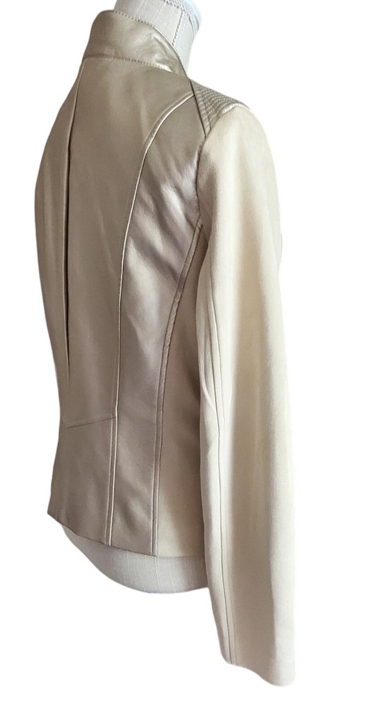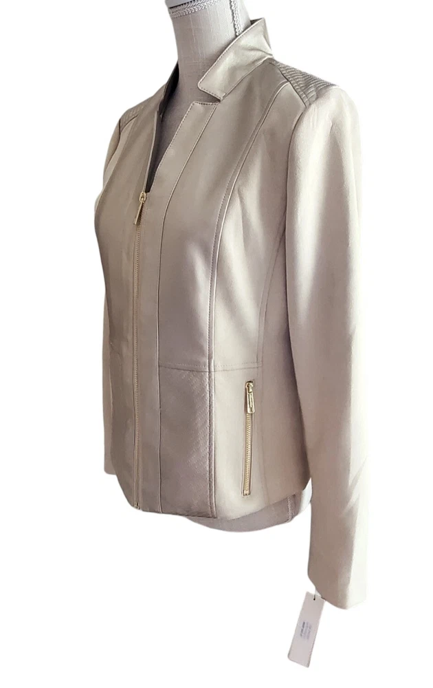 Measurements laying flat unstretched Pit to pit: 18" Waist: 17" The Women's Kenneth Cole Reaction Full Zip Faux Leather Jacket in Ivory, size XL, is a stylish mid-length jacket perfect for casual occasions. Made of faux leather with a polyester lining, this jacket features a solid pattern and a full zip closure for easy wear. The biker-style design and regular fit make it a fashionable and versatile addition to any woman's wardrobe. Easy to care for with its machine washable material, this jacket combines both style and practicality for a timeless look.