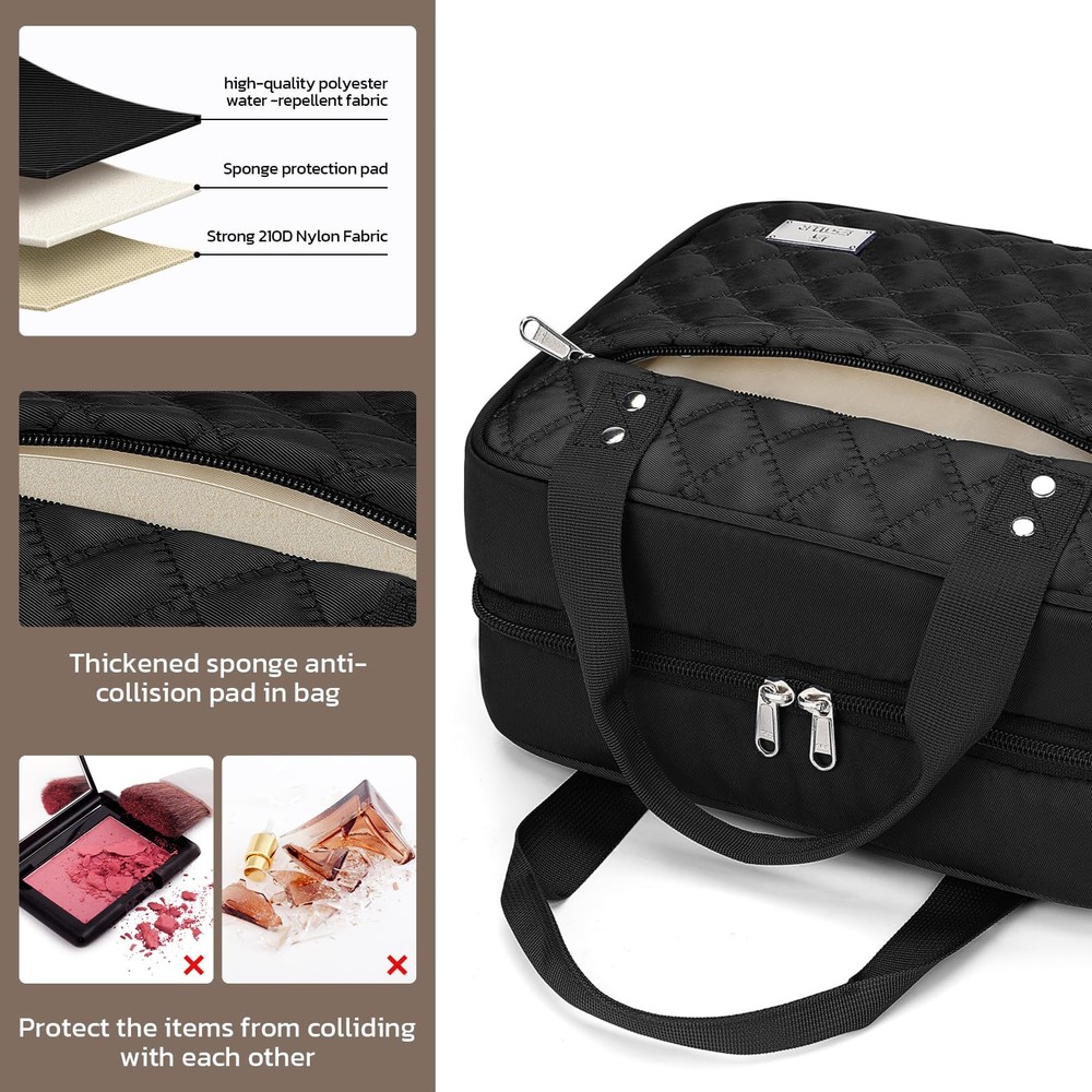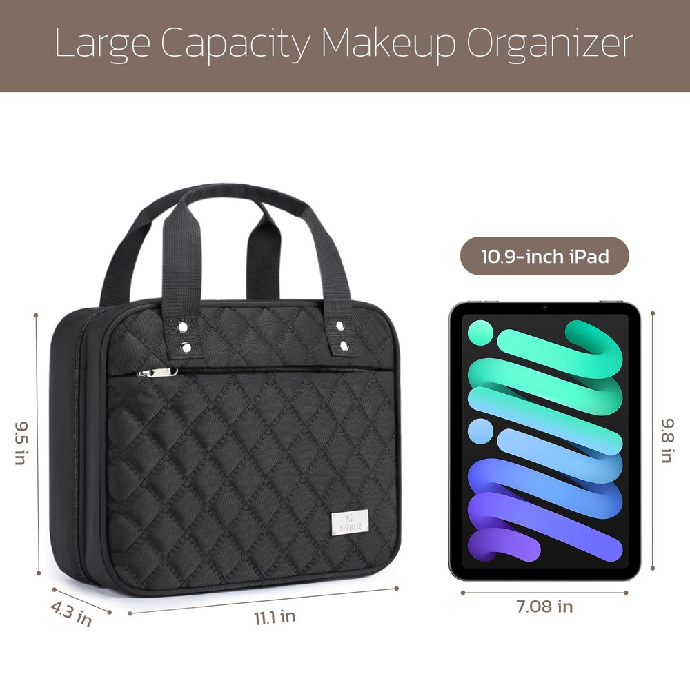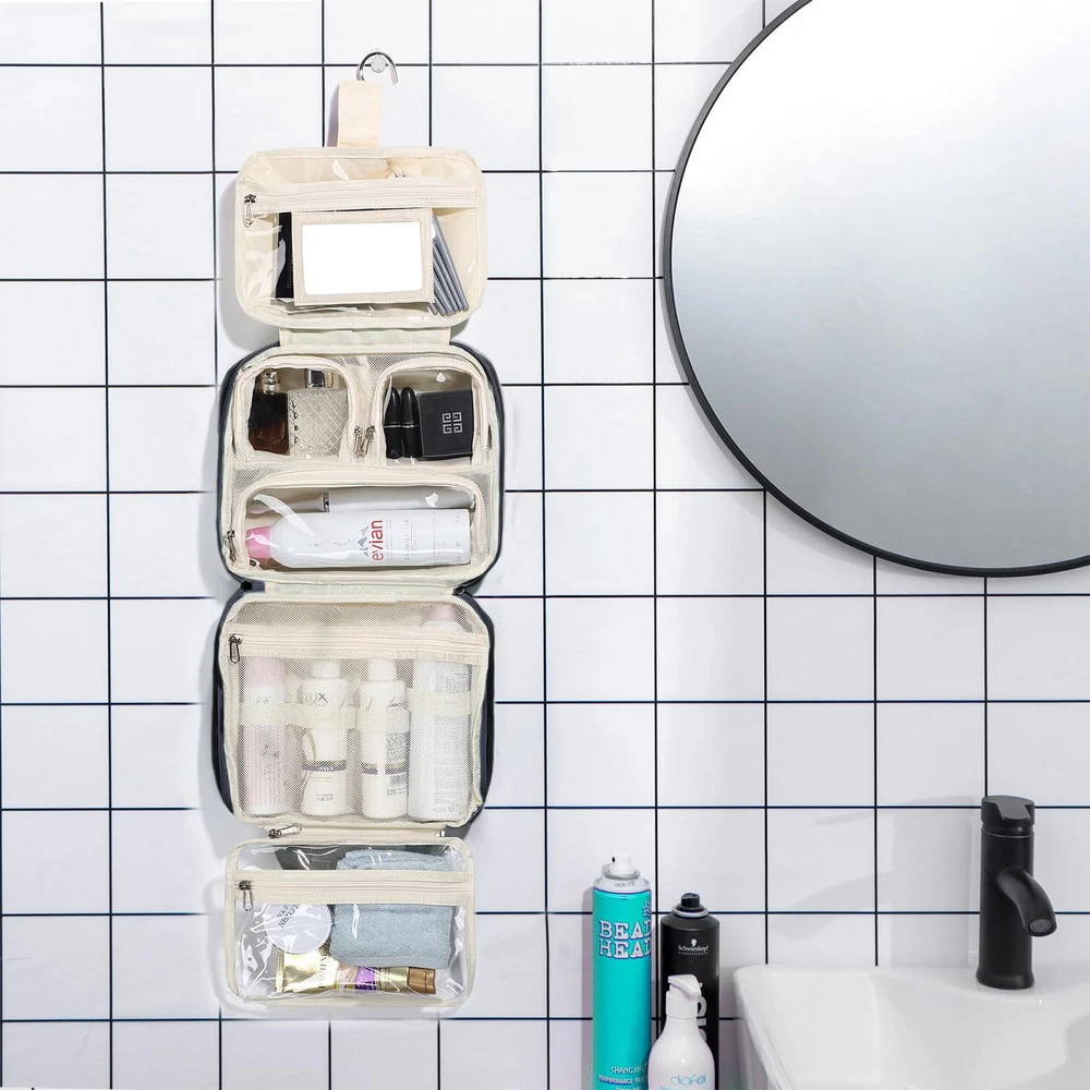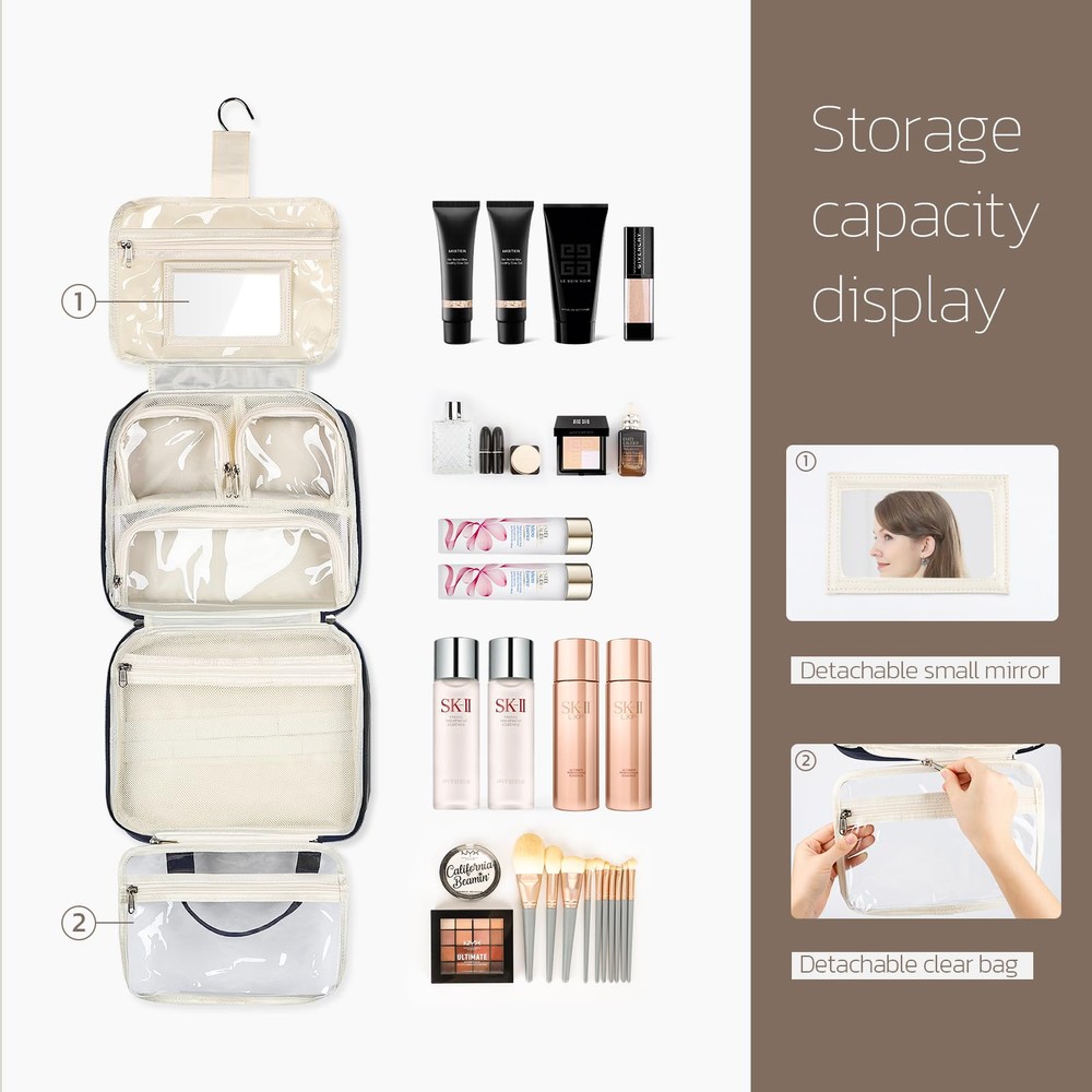Innovative Design: The toiletry bag is designed with a special jewelry compartment. Multi-functional toiletry bag-combination of toiletry bag, jewelry bag and cosmetic bag in . skincare, also accompanied by a transparent cosmetic bag that can be adjusted to hold 1-2 days of vacation essentials, the TSA-approved toiletry bag gives you complete control over your packing needs. User-friendly Details: 360° rotating hook for easy hanging. Mesh pockets with elastic straps for keeping the bottle upright, avoiding liquid tilting leaks.PVC compartment for dry and wet separation, also easily visible. Durable PU leather handles, toiletries Kit Set with trolley belt, each detail of the travel toiletry bag is convenient and portable for users. Compact and Organized: This extra large toiletry bag is designed with 4 toiletry storage compartments and a special jewelry compartment to keep your toiletry kit neatly arranged. ensuring easy access and clear visibility of your supplies. High-quality Fabric: Crafted from top-notch polyester fabric, our traveling toiletry bags offer a comfortable and lightweight experience. The added foam interlayer provides excellent protection for your belongings, safeguarding them from impact during your journey. Multifunction Makeup Organizer Bag: Not just any toiletry bag, bag meets all needs. Its stylish appearance and practical design, also serve as an excellent gift option for your friends, showcasing your thoughtfulness and consideration. practical design, also serves as an excellent gift option for your friends, showcasing your thoughtfulness and consideration.