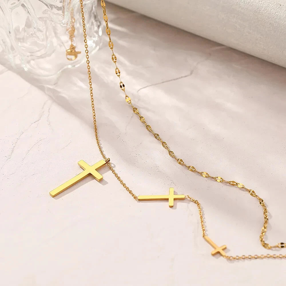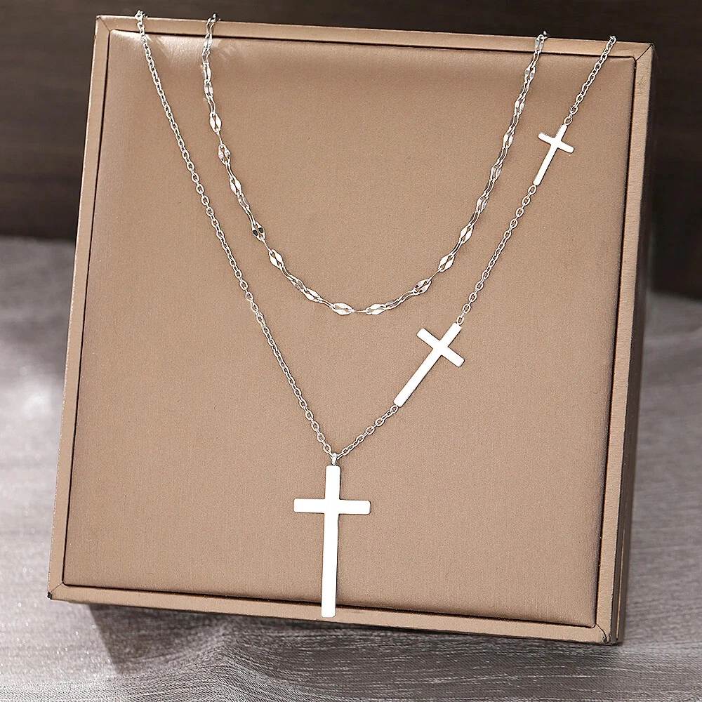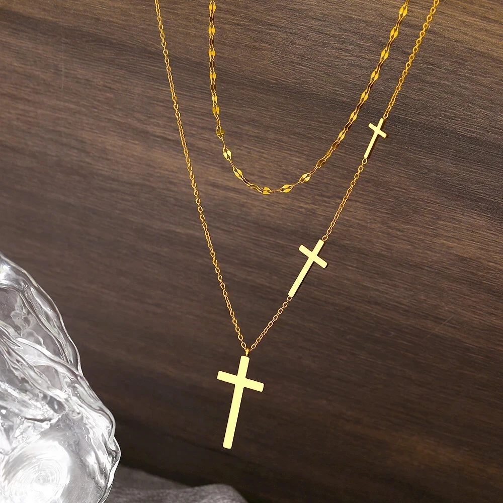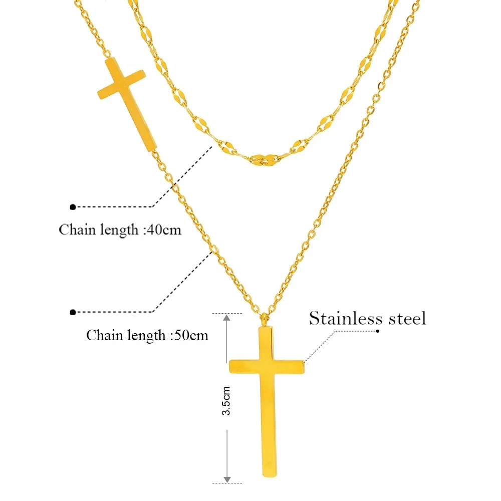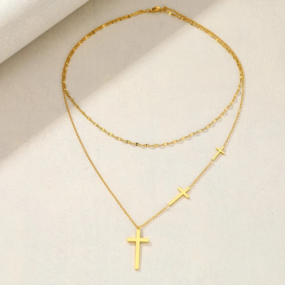 Overview: Indulge in the exquisite elegance of faith and fashion with our Women's Layered Cross Necklace. Crafted with precision and care, this stunning piece features a double-layered design adorned with three radiant crosses, symbolizing the enduring strength and guidance found in Christian faith. Beyond its captivating beauty, this necklace serves as a powerful reminder to honor God and the significance of the cross in everyday life. Each cross represents a pillar of strength, offering protection and guidance through life's journey. The intricately layered design adds a modern twist to traditional Christian jewelry, making it a bold fashion statement for the contemporary woman. Whether worn as a standalone piece or layered with other necklaces, this stunning accessory is sure to garner attention and spark conversations about faith and style. Designed for the modern woman who seeks both beauty and meaning in her accessories, this necklace is perfect for daily wear or special occasions. Let it serve as a testament to your faith while adding a touch of sophistication to any outfit. Crafted with high-quality materials, including durable gold plating, this necklace promises longevity and timeless elegance. Its adjustable chain ensures a perfect fit, allowing you to wear it comfortably throughout the day. Elevate your style and embrace the power of faith with our Women's Layered Cross Necklace. Order now and experience the perfect blend of fashion and spirituality. Product: Occasion : Elevate your party ensemble with the timeless elegance of this Double Layered Stainless Steel Cross Womens Cross Necklace/Layered Choker Necklace. Pendant Size : As pictured, this necklace features a beautifully crafted row of 3 cross pendants. Shape/Pattern : The focal point of this necklace is the classic cross shape, representing faith and devotion. Material : Made from durable stainless steel, this necklace promises quality with longevity and enduring style. Chain Type : The necklace is adorned with a delicate link chain, adding to its feminine allure. Style : Embrace the latest trends with this trendy pendant necklace, perfect for modern women. Necklace Type : This piece is a double layered pendant necklace and choker, designed to add a touch of sophistication and makes a bold statement to any outfit. Gender : Designed for women, this necklace exudes femininity and grace. Metals Type : Crafted from high-quality stainless steel, ensuring durability and resistance to tarnishing. Fine or Fashion : Versatile For Both Fine Jewelry And Fashion.