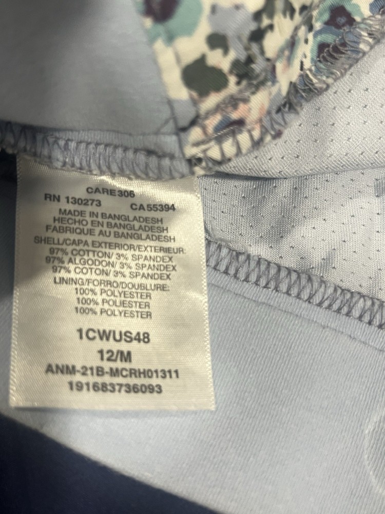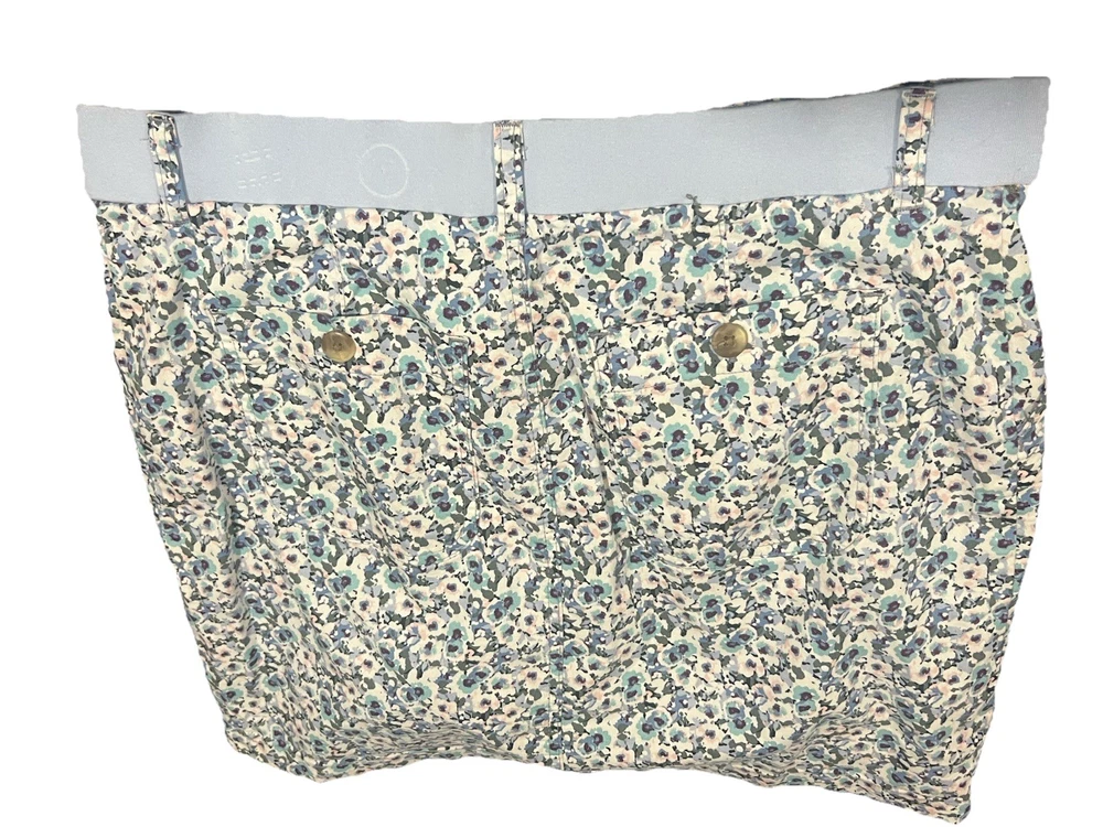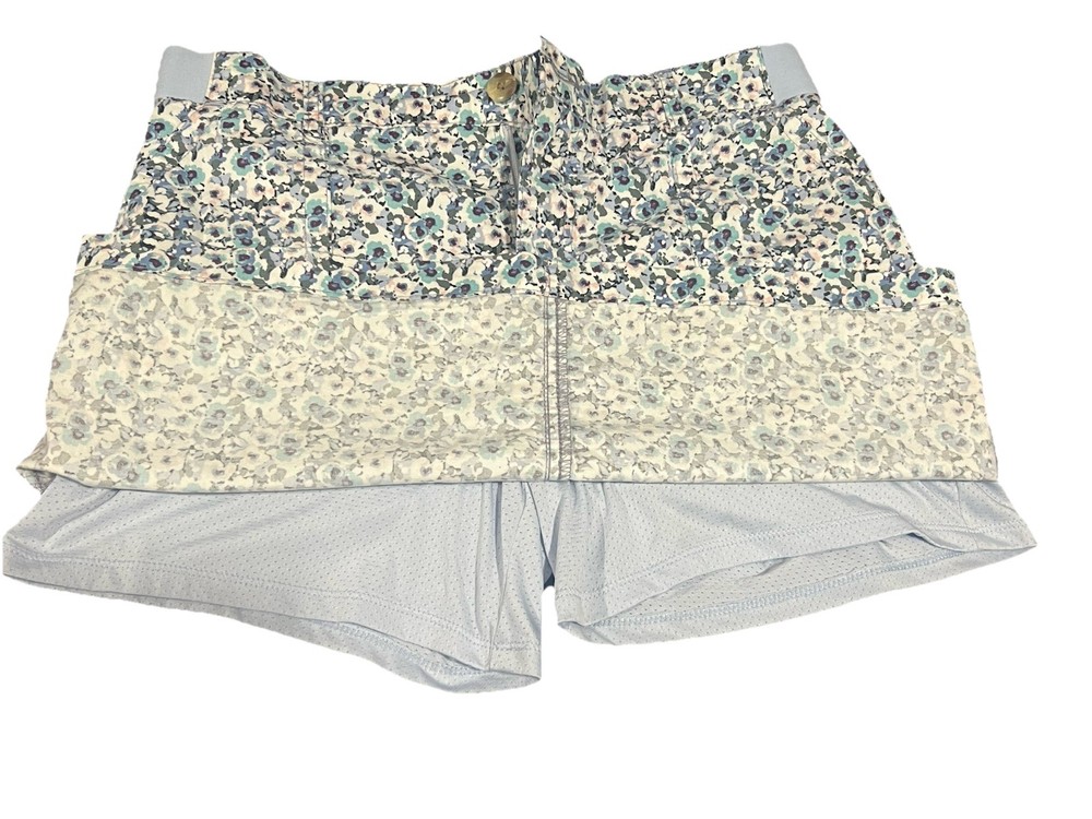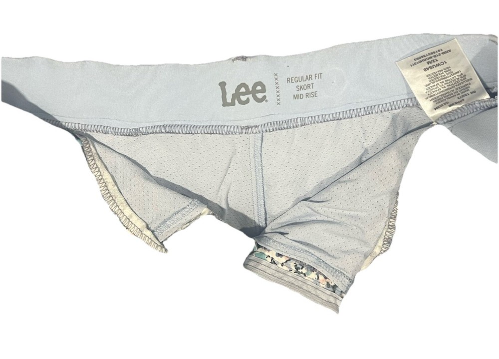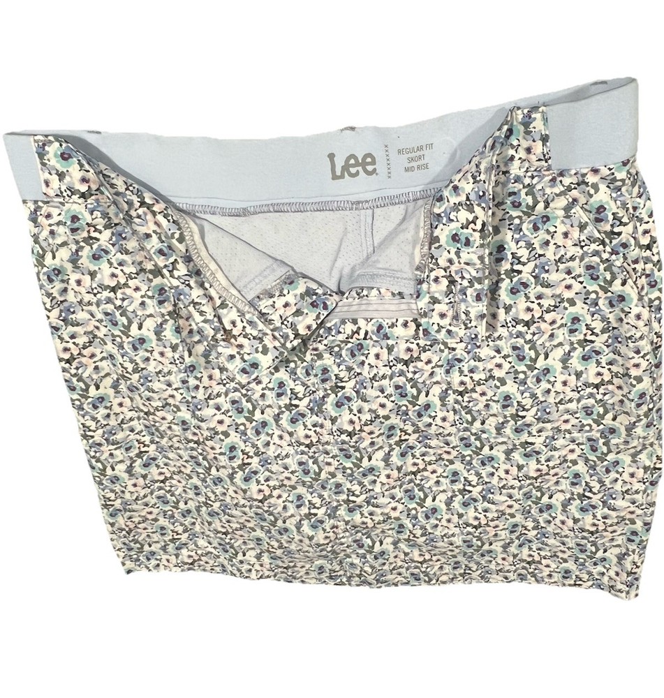 The Lee Skort is a women's athletic skort in a size medium with a regular fit and mid-rise waist. It features a floral print in shades of blue, making it perfect for activewear occasions like tennis, walking, or beach activities. The skort is made from a blend of cotton and spandex for comfort and stretch, with a zip and button closure and pockets for convenience. Machine washable and designed for the summer and spring seasons, this skort combines style and functionality for a versatile wardrobe essential.
