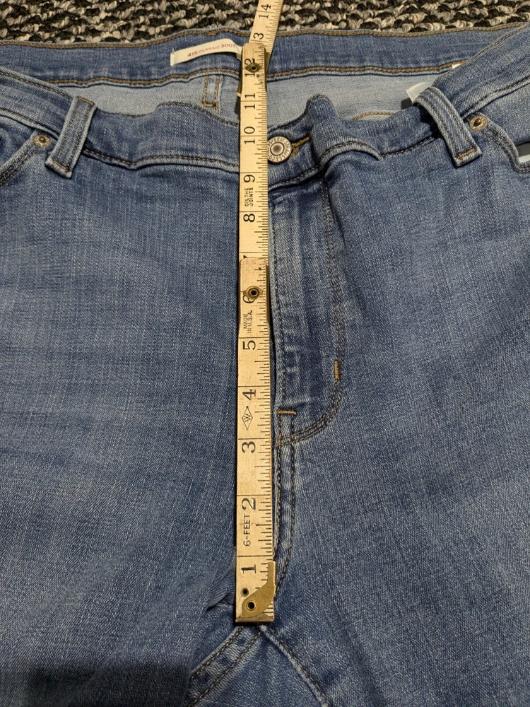 These are in good used condition. The waste is 20 in in a measurement and with the elastic I could stretch it to 23in quite easily. There is a tear and a Levi logo on the back which you can see in the photos. Otherwise these jeans are in great condition. Lou's ask if you have any questions. The measurements are in the photos. Women's Levi's 415 Classic Boot jeans in blue, size 40 with a 29-inch inseam. They feature an elastic waist for comfort and a zip closure. Made of a polyester and cotton blend, they have a solid pattern with button accents and the Levi's logo. This classic fit style has a red tab detail and is suitable for regular sizing.