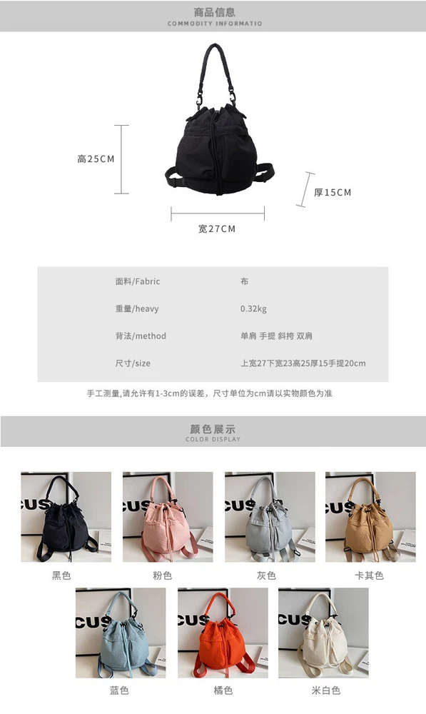 Women\'s Lightweight Shoulder Crossbody Bag Backpack: Colors: Black, Pink, Grey, Khaki, Blue, Orange, Creamy-white Hardness: Soft Opening Method: Pulling Strap Number Of Shoulder Straps: 3 Size: 27 * 25 * 15cm,(10.6*9.8*5.9inch) Note:1inch= 2.54cm, Manual measurement, there will be 1-3cm error, please understand, thank you! Package Includes: 1PCS Backpack (Color According To Your Choice) Kind Reminder: 1. In different indoor and outdoor scenes, and with different displays, there may be slight color differences. 2. The packaging may be slightly compressed during transportation. If the bag is deformed, please use some items to support the interior of the bag , and then leave it for a period of time to restore its shape. Thank you! .