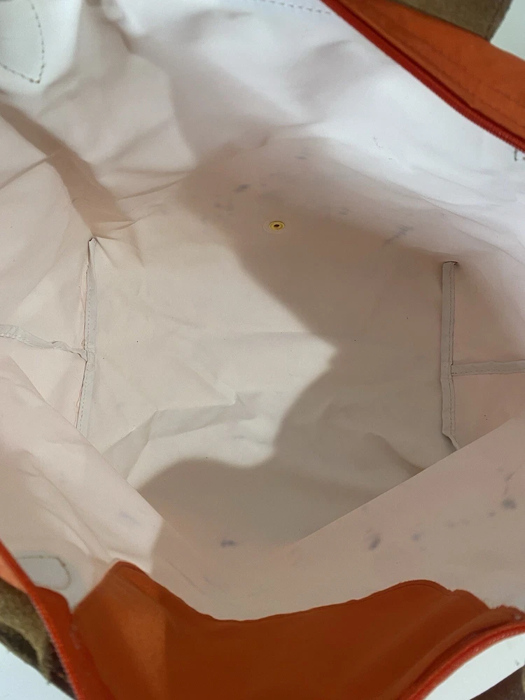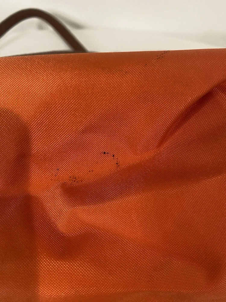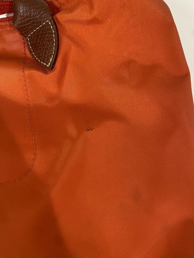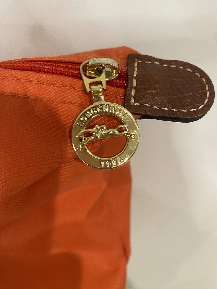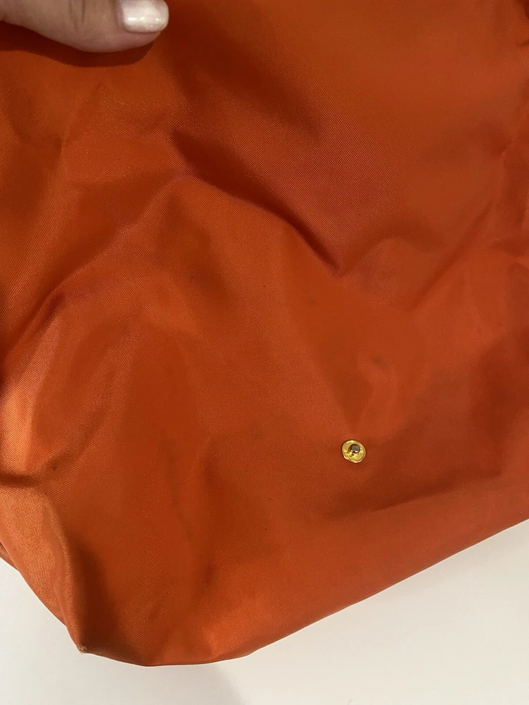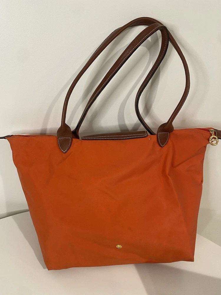 The classic original Longhamp le Pliage tote bag in ORANGE. Dimensions : 11 in (L - measured at the base of the bag) x 10.4 in (H) x 6.1 in (W) Material : Recycled polyamide canvas with inside coating Metallic Hardware : Gold color Trimming : Russian leather (cowhide) Weight : 0.48 lb Closing : Zipped and snap closure Foldable Exterior details Handle Height : 21 cm / 8.3 in Please look carefully at photos. There are marks on the outside and inside. Still beautiful. ALL SALES FINAL Ask questions I only ship within the US