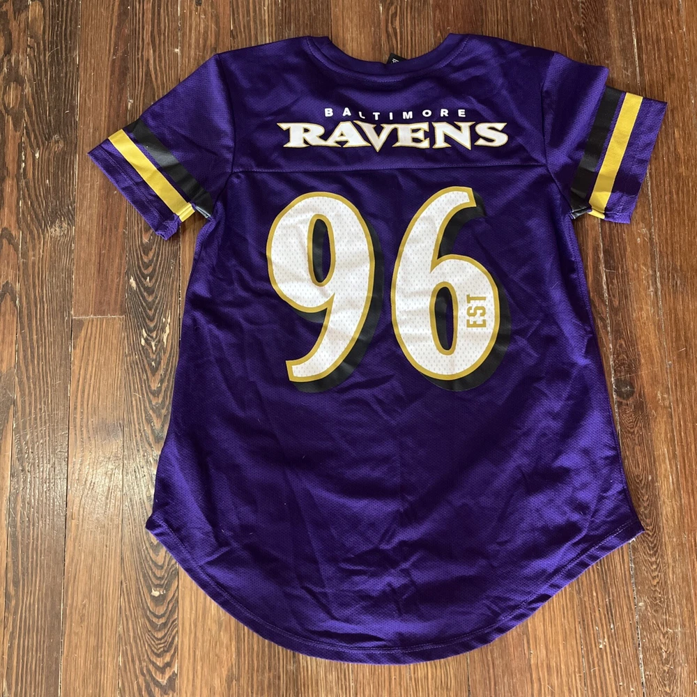 Show your love for the Baltimore Ravens with this Women's M jersey top from the NFL team apparel collection. The purple jersey features the team's iconic logo and number 96 on the back, making it a must-have for any fan. It is made from high-quality materials and designed with comfort in mind, so you can wear it to the game or simply show off your team spirit. This jersey is perfect for women who love football and want to support their favorite team in style.