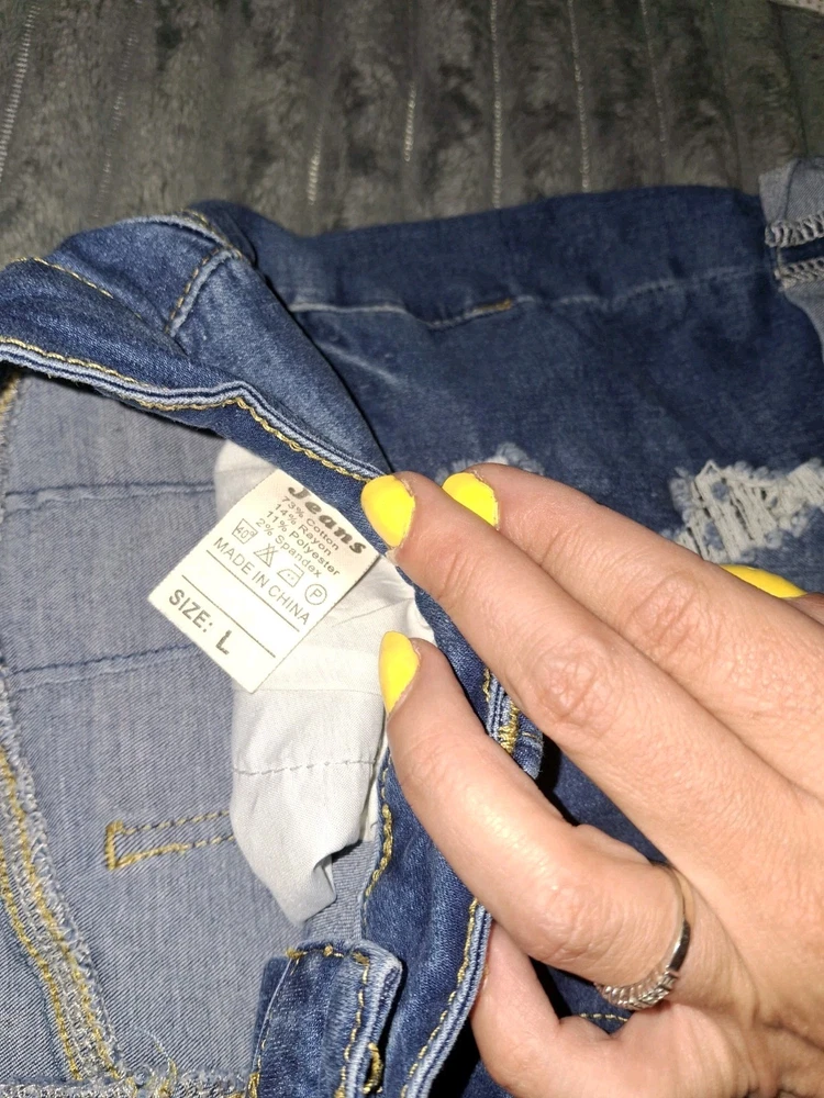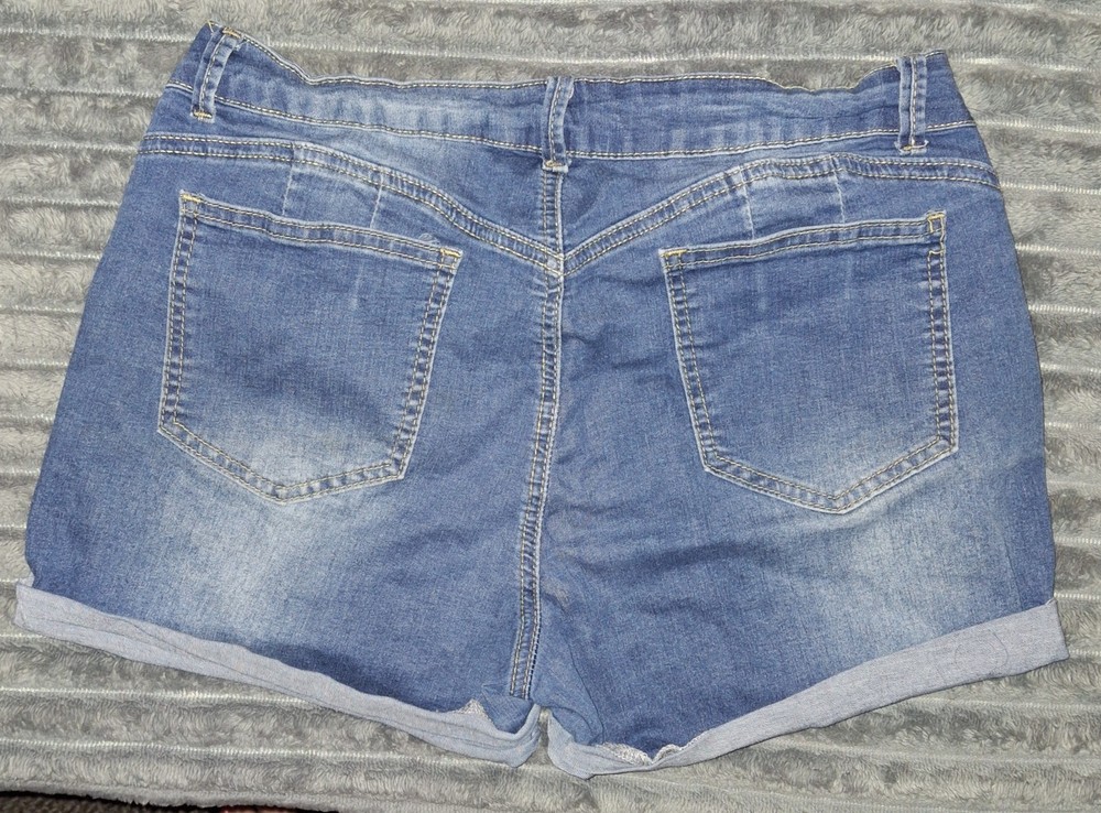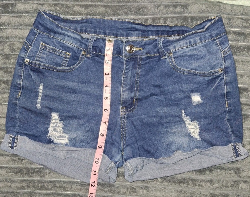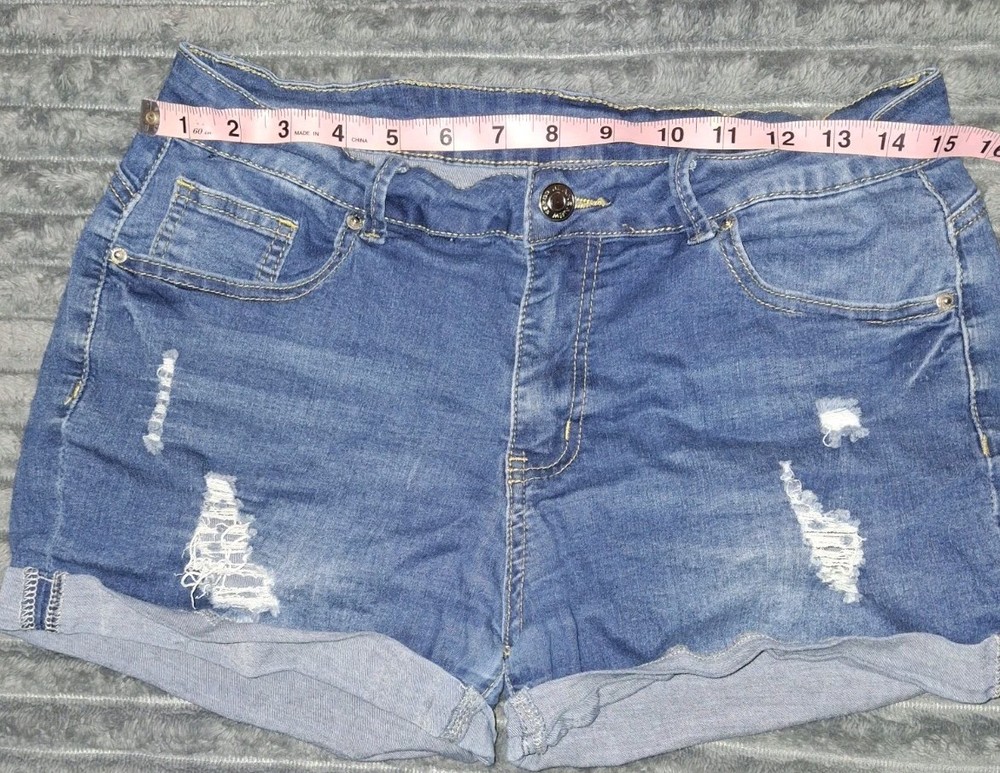 These Women's Mid Rise Jean Shorts in size Large are perfect for a casual summer or spring day. Made from a comfortable denim fabric with added stretch, they feature a zip closure, 5-pocket design, and a cuffed style. The mid-rise waist and hot pants fit offer a versatile look that can easily be dressed up or down for various occasions. Machine washable and easy care, these shorts are a practical and stylish addition to any woman's wardrobe. Made from a blend of polyester, rayon, and cotton, these shorts are designed for comfort and performance, whether you're walking, at the beach, or running errands.