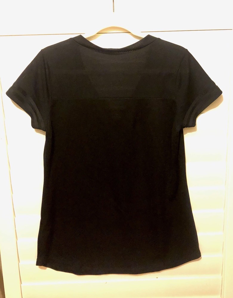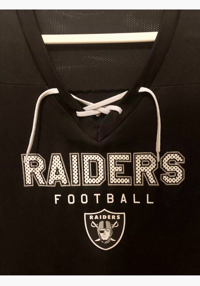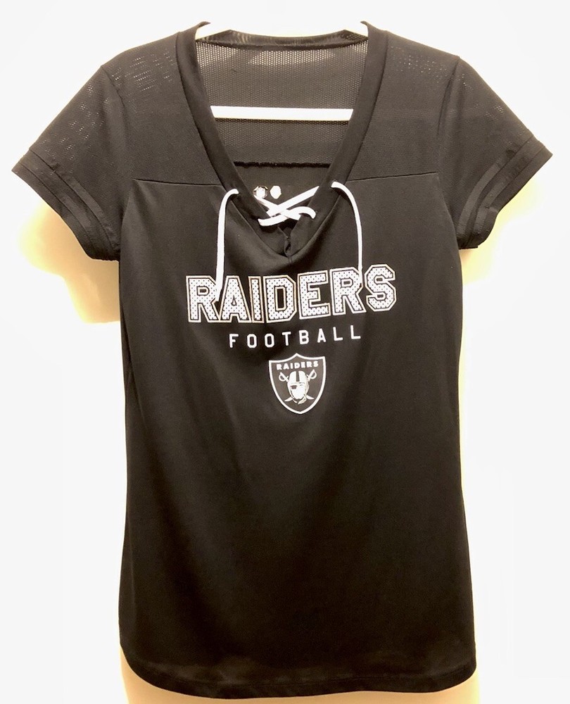 Women’s NFL RAIDERS Team Apparel Fitted Black Short Sleeve Shirt Size Lrg Cute fitted Raiders shirt with lace-up detailing and subtle silver glitter bordering the Raiders logo. Mesh sleeves and top section. Officially licensed team apparel.