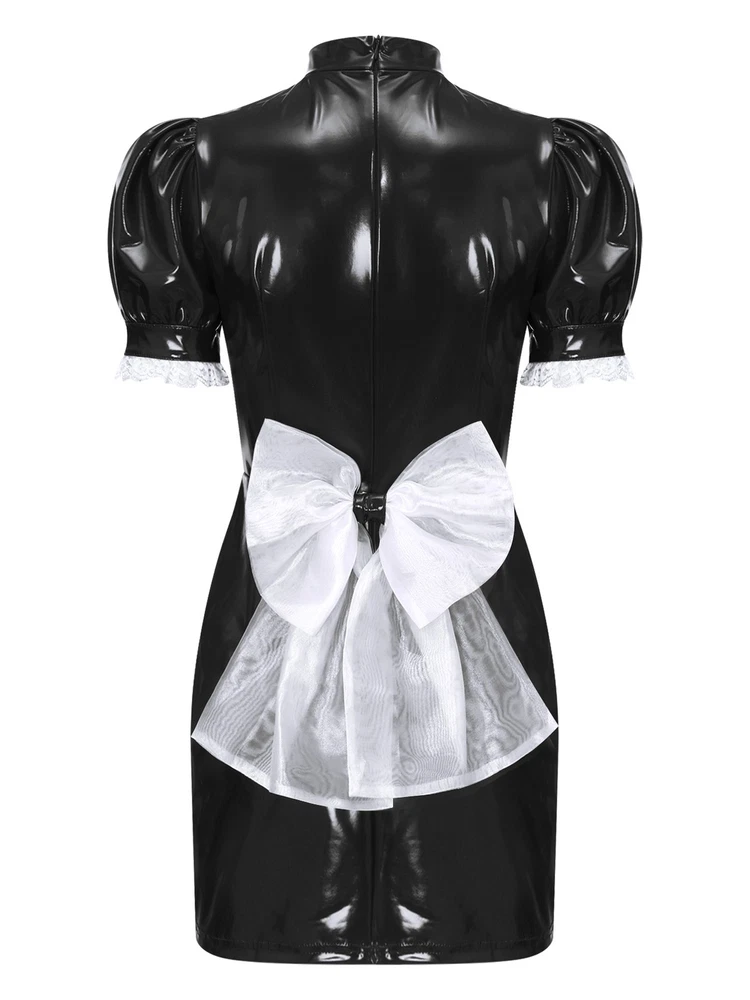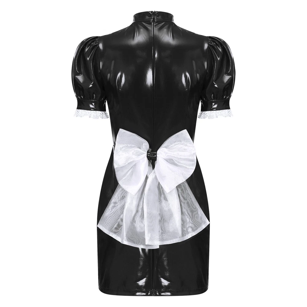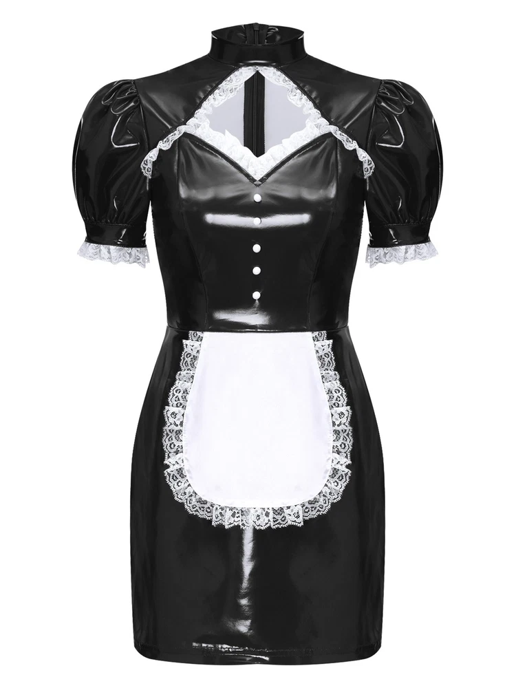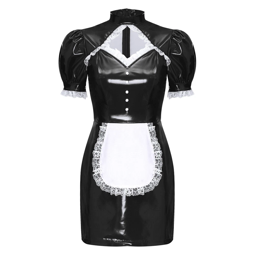 Womens Patent Leather Wet Look Maid Fancy Dress-up Costume Cosplay Bodycon Dress