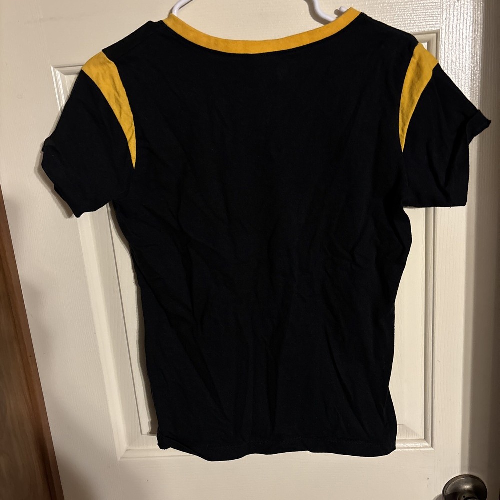 Show your love for the Pittsburg Steelers with this stylish black and gold blouse. Perfect for game day or any day, this shirt features the team's iconic logo and is made from comfortable cotton material. The V-neckline and regular size make it a great choice for any woman, while the V-neckline and basic style make it a versatile addition to any wardrobe. Whether you're cheering from the stands or watching from home, this shirt is sure to show your support for one of the greatest teams in NFL history. W23 International charges are the buyer's responsibility. No international returns.