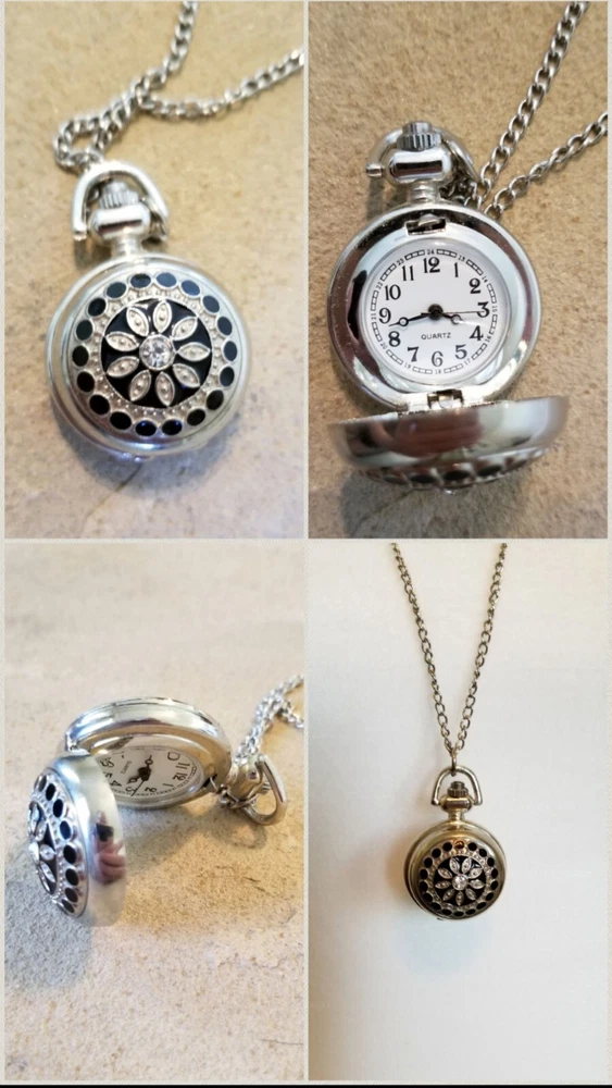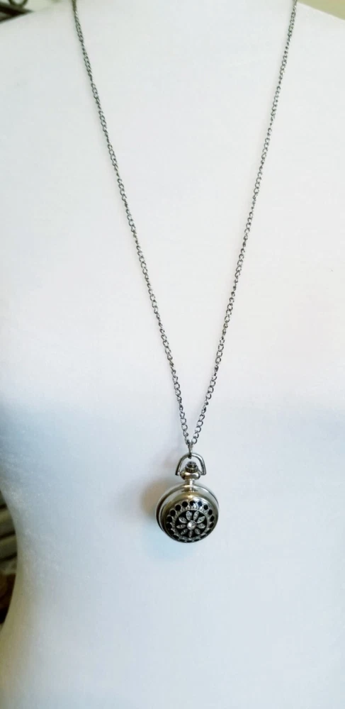 This silver tone pocket watch necklace is in new condition. The pendant shape is round and the necklace length is 30 inches with a lobster closure. The pendant/locket type also has a place for a special photo. Operating Instructions: The watch opens by pressing down on the crown knob. Basic quartz pocket watches operate just like standard quartz wrist watches. To set the time, pull the crown all the way out (or second detent). Push the crown all the way back in to start the movement and begin normal time keeping.