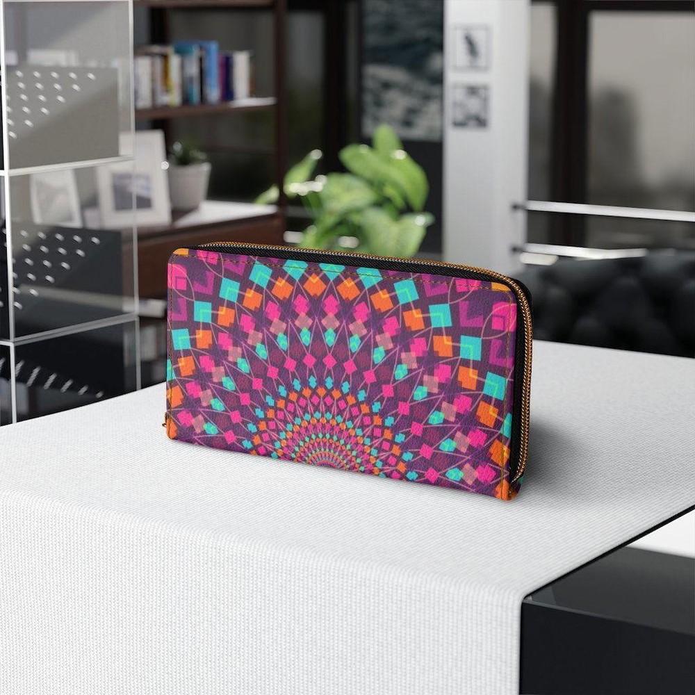 This stylish purple kaleidoscope wallet is a must-have! The cruelty-free faux leather feels luxurious, and the sturdy zipper keeps everything secure. Plenty of slots for cards, cash, and IDs—so functional yet chic. The gold stitching adds a classy touch, and it pairs perfectly with any outfit. Great for everyday use or as a gift—love it!