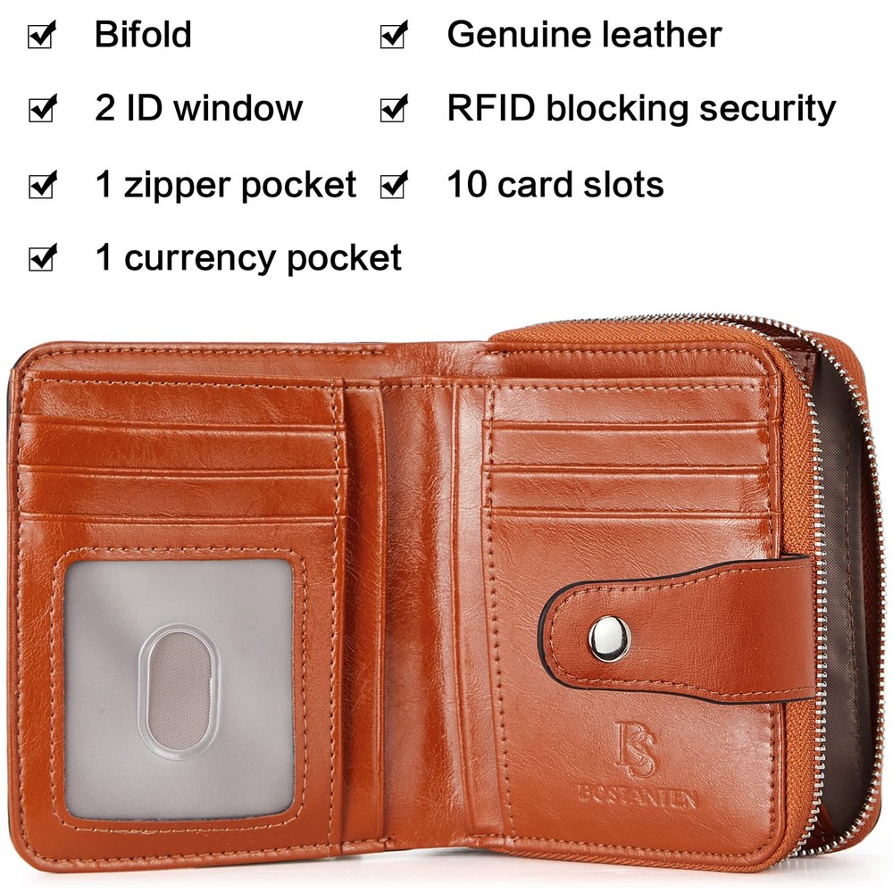 This small wallet for women is made of PU leather, with a snap and smooth zipper closure design, it's durable and the touch feeling is very comfortable. Womens wallet has 16 credit card slots and 2 ID window, 1 coin zipper pocket, 1 full-length compartment to put money. Roomy enough for fitting plenty of cards, change keep them well organized. Leather wallets are an ideal gift for your lover, wife, friends, or family at a birthday, Mother's Day, Christmas, Valentine's, or wedding anniversary. Made of high quality cowhide genuine wax oil leather. Compact yet small enough to put into your pants pocket or your shoulder bags 4.72" x 3.74" x 1.18" in. Weight: 0.13Kg. Roomy enough for fitting plenty of cards, change and dollar bills, coins, keep them well organized Roomy zipper pocket at the back. U-shape silver-color metal zipper around runs smoothly when being pulled open Our women leather wallet features proprietary blocking material, keeping your personal and credit card details safe when traveling or shopping Credit card holder is a nice choice for gift giving