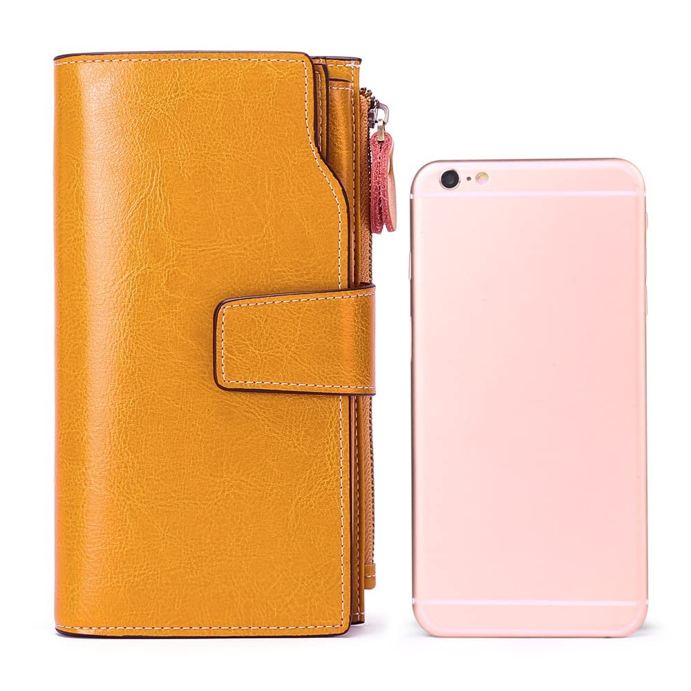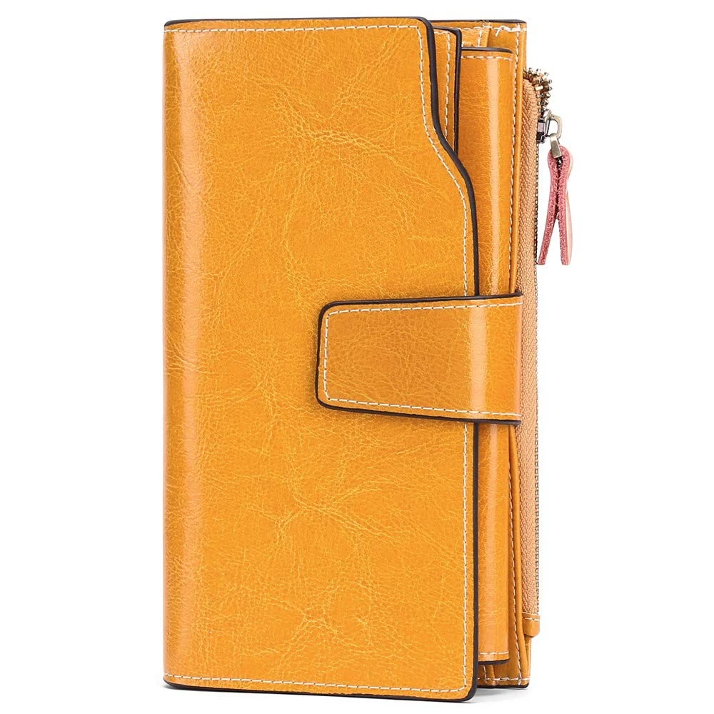 women wallet Genuine Leather: this women's wallet is made of oil waxed leather, it is durable and sturdy, and use a long time will soften more RFID Blocking: the women leather wallets are equipped with advanced rfid secure technology, a unique built-in metal composite, engineered specifically to block 13.56 mhz or higher rfid signals and protect your private digital information stored in rfid chips from thefts Large Capacity:design with 1 zipper pocket, 1 big accessory slot (large enough to hold the smartphone), 3 receipt slots, 17 card slots, 1 id window(for id and photos), 1 envelope pocket, an extremely powerful multifunction wallet at the most slim size Giftware Box: the women's wallet comes with a wonderful present box, it is a magnificent giftware idea for an anniversary, birthday, christmas, and any other important date Warm reminder -- provides our customers with prompt responses and services, if there is any issue regarding our wallet, a satisfactory solution to your issue is always available