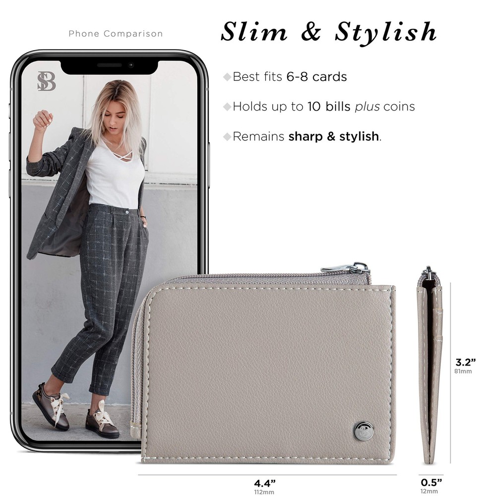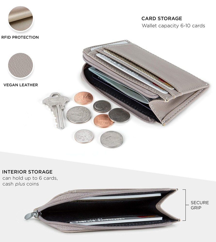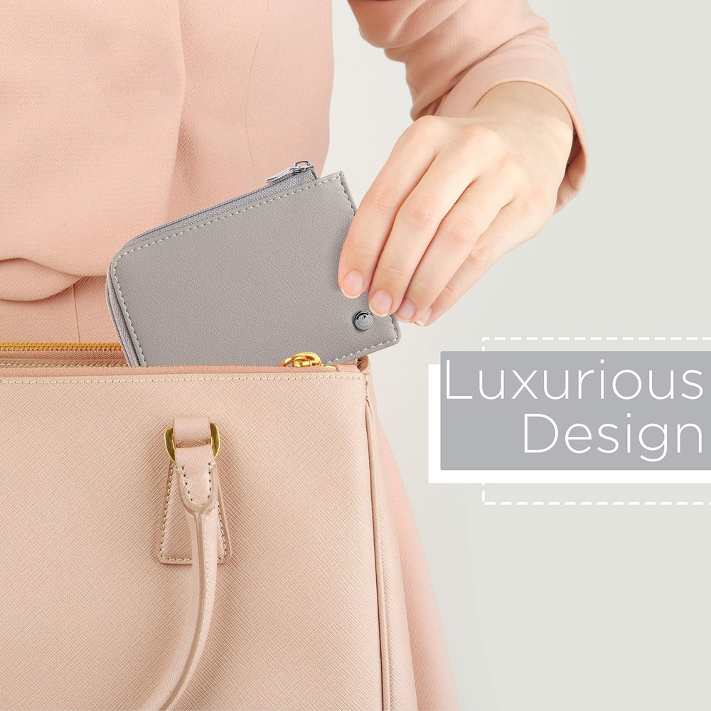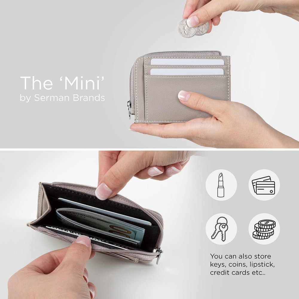 The Mini Wallet by - a Luxurious Little Cutie. Before we talk about how cute and practical The Mini female wallet is, it’s important to mention something that affects all on-the-go women... ... the embarrassment of spilling coins and the frantic fumbling that ensues to cram them back in. You see, some coin purses & pouches put their teeny-tiny coin pouch on the outside. Not only is it too small for anything, but coins slip out as soon as you open it. But this zip wallet is smarter than that. And not just in looks. Because, inside this minimal wallet is a LARGE coin space that also fits lippy and keys. It’s deep and discrete, so nothing falls out. And zipping it is smooth. The wide opening nylon zipper makes it ultra-accessible. Here’s what else you’ll adore about The Mini, Womens Slim Wallet. The cardholder holds up to 9 cards! Inside, 2 card slots hold 3 cards each, and on the outside 3 Easy Access Slots. And it’s not just a credit card case, but also a handy vegan leather business card holder wallet. It’s a skinny wallet too. At 4.4 x 3.2in., you can keep it as a super slim wallet with one card, keys, emergency cash and ID, or you can pack it with 9 cards, coins, keys and 10 bills and pop it in even the smallest crossbody bag. She’s YOUR cute money wallet, so you choose. RFID blocking and available in 8 different colors with a silky smooth interior, this ladies wallet is a handy travel wallet that matches your wardrobe, and effortless to slide cards in and out. She comes in a luxury gift box with a 12-Month Guarantee for Christmas or Mothers Day gifts, and best friend, wife or girlfriend gifts for her birthday. So by now you can see, The Mini is a simple wallet for sure, but with much charm and practicality for women who won’t be weighed down. Try her out now, from . A LUXURIOUS CUTIE: The 'Mini’ by is a real little cutie. Available in 8 vegan leather colors it matches seamlessly with your favorite outfit, while also being compact enough to hide away in your smallest crossbody bag. And it has enough room for cash, coins, cards and even lip gloss or keys. A NO-SPILL CHANGE PURSE: Some thin wallets for women put their teeny-tiny coin pouch on the outside. Too small for fingers, and one of those frustrating designs that coins fall from as soon as its opened. But The Mini keeps its coins tucked away deep on the inside so you won’t embarrass yourself. AND 9 CARD WALLET! It’s remarkable how much this Minimalist Wallet fits. Hidden inside you’ll find 2 card slots to hold 3 cards each, and on the outside 3 Easy Access Slots are for your most used cards. It’s also an RFID Blocking Credit Card Wallet, so you CAN carry all those cards and remain protected. PACK IT - OR NOT: It’s up to you whether you cram your thin wallet full of cards, coins, bills and even lipstick or gloss -- or keep it low profile with emergency cash, atm card, ID, car and house key. The Mini Wallet for Women is 4.4 x 3.2 inches and is the perfect small wallet for women A SMOOTH OPERATOR: Enjoy the smooth glide of The Mini’s wide-opening nylon zipper and the soft interior as you slide your cards out with ease. And if it’s for gifting, you’ll enjoy this compact wallet comes in a cute gift box with a 12-Month Warranty. Try the charming Mini now, from .