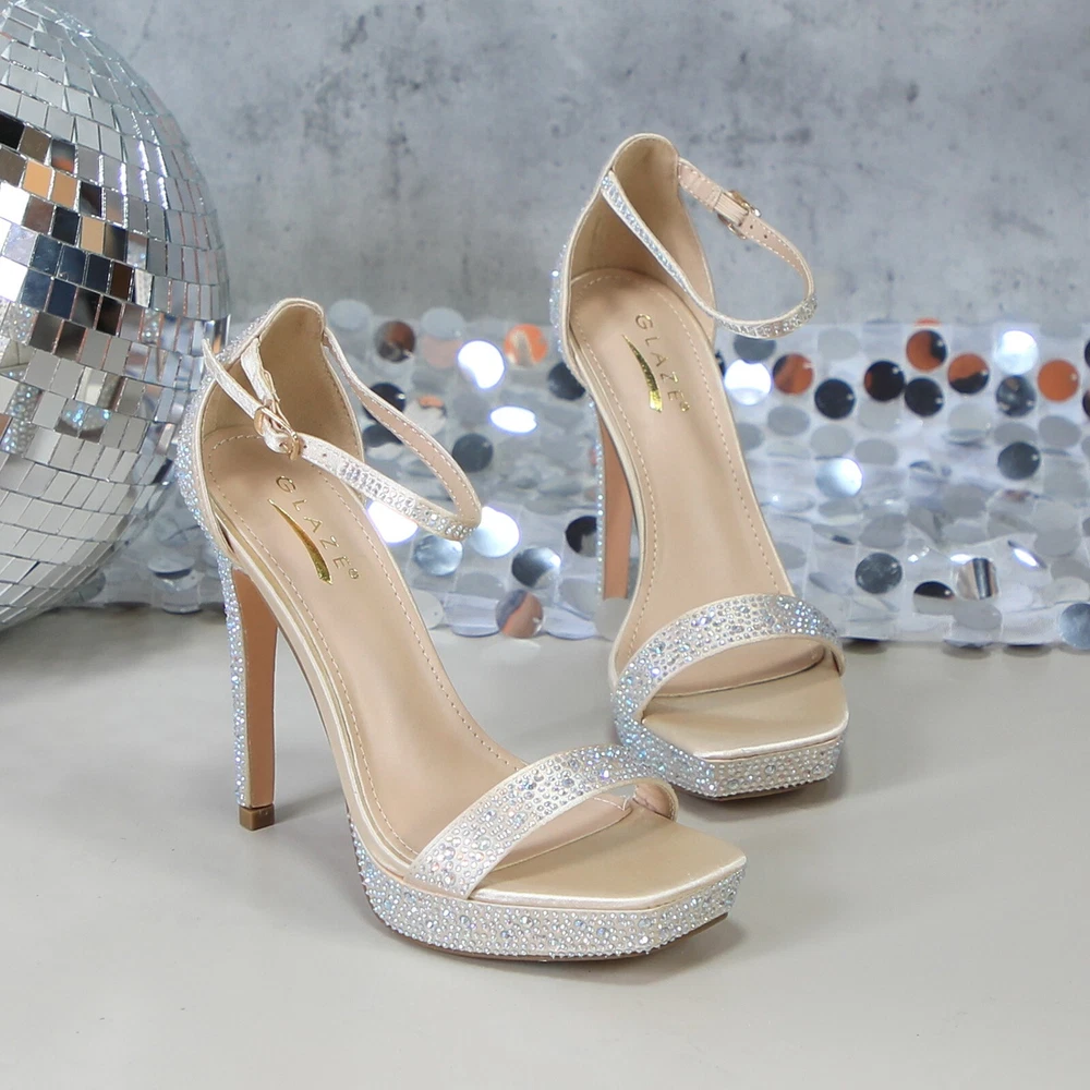 Lining Material: Synthetic Features: Ankle Strap Occasion: Casual, Party/Cocktail Brand: Glaze Outsole Material: Resin Upper Material: Polyurethane Heel Style: Stiletto Shoe Width: Standard Accents: Rhinestone Heel Height: Ultra High (4 in & Higher) Type: Heel Department: Women Toe Shape: Square Toe Insole Material: Polyurethane Season: Fall, Spring, Summer, Winter US Shoe Size: 6-10 Style: Platform Platform Height: 0.5 Inch Closure: Buckle Pattern: Solid Country/Region of Manufacture: China