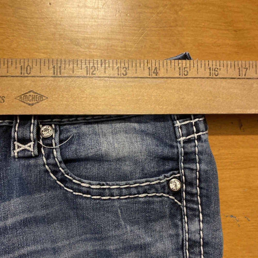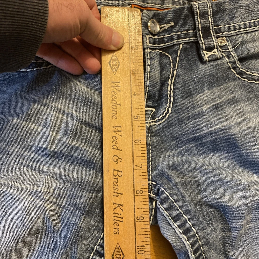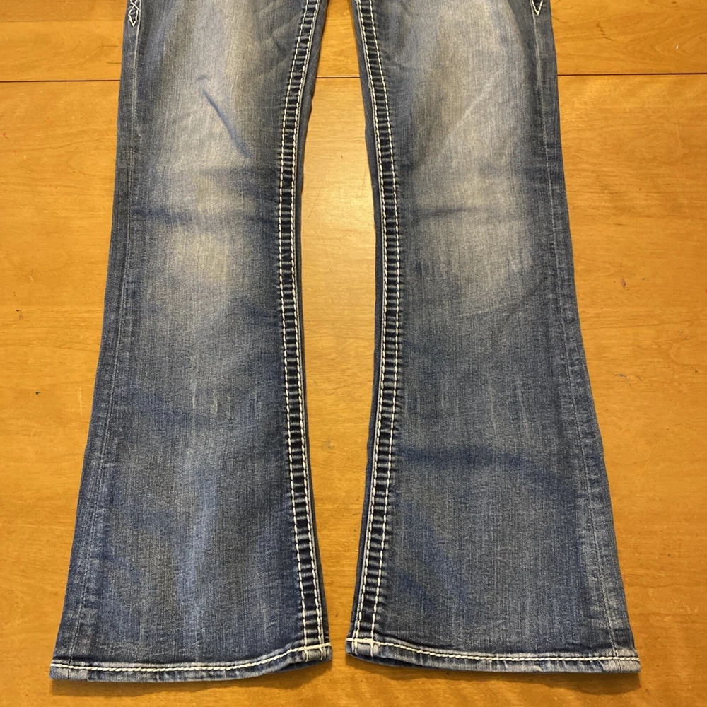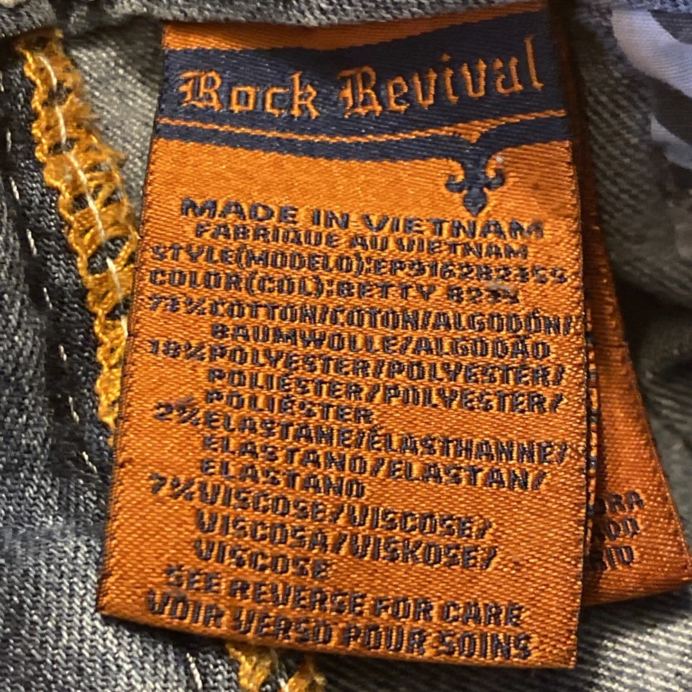 Elevate your denim game with these stunning Rock Revival jeans in size 28. The Betty Bootcut style features a flattering mid-rise fit with a zip and button closure. The jeans are made of a comfortable blend of polyester, viscose, cotton, and elastane that provides a stretchy fit with pockets for added convenience. These are pre owned jeans please look over pictures and measurements