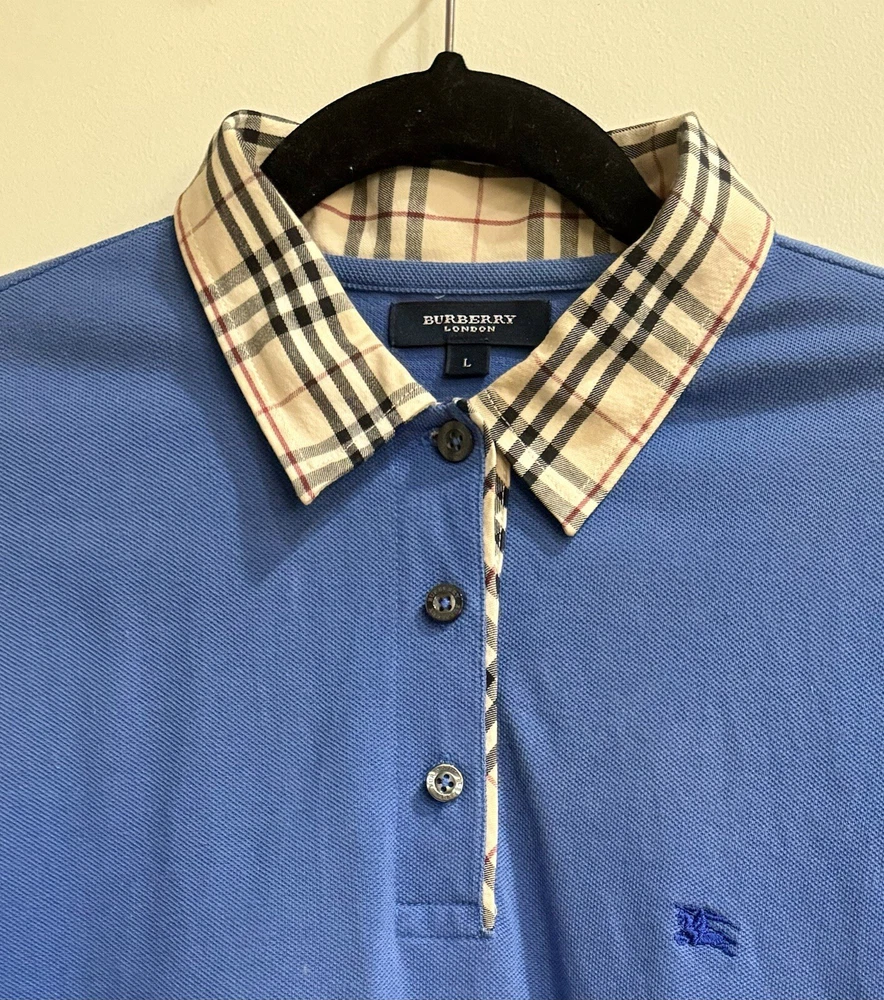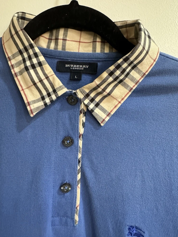 Size: L Department: Women Accents: Button Character: Nova Neckline: Collared Brand: Burberry Pattern: Plaid Type: Polo Size Type: Regular Sleeve Length: Short Sleeve Theme: Classic, Designer, London Material: Cotton Pique Fit: Classic Color: Blue