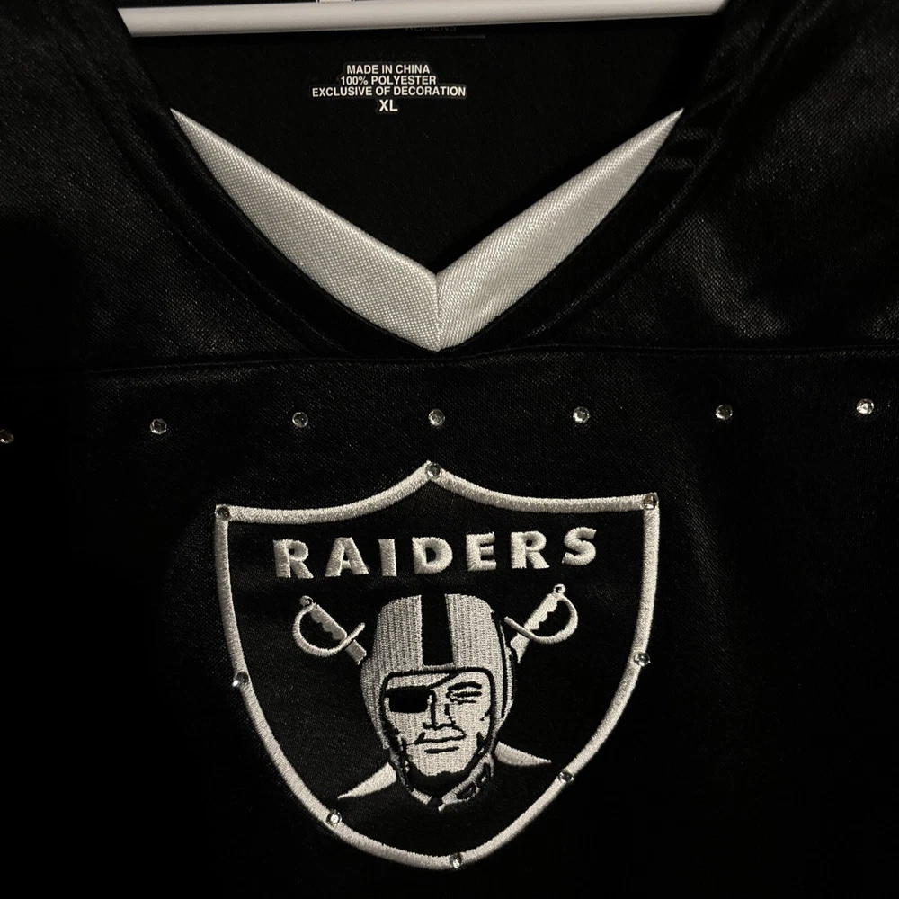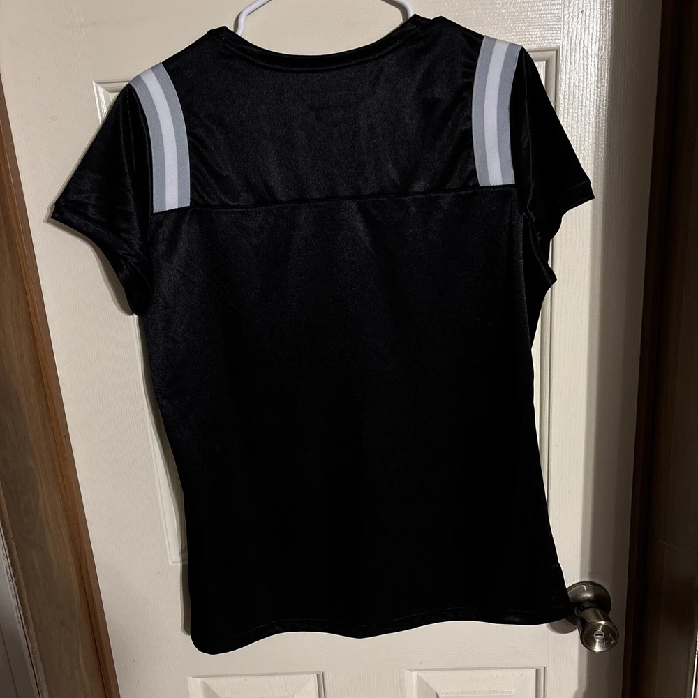 Show off your team spirit with this black, silver, and white Raider blouse from Team Apparel. Perfect for game day or everyday wear, this blouse features a V-neckline, short sleeves, and a collarless design. The beaded accents add a touch of bling to this basic style. W23 Made from lightweight polyester, this blouse is easy to care for and tagless for ultimate comfort. It comes in size XL for regular size women. Whether you're cheering on your favorite team or just want to sport some stylish football gear, this blouse is a must-have addition to your wardrobe. International charges are the buyer’s responsibility. No international returns.