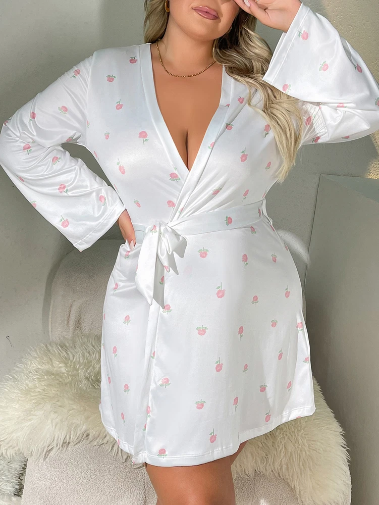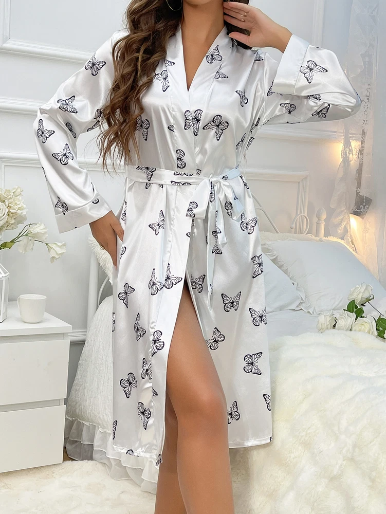 About this item: Butterfly print, full length sleeve, knee length, belted, open front Soft fabric has some stretch Model Measurements: height: 68.9inch; bust: 35.4inch; waist: 24.8inch; hips: 36.6inch. Wear: S Suitable for weddings, spa party, gifts, sleep, pajama party, loungewear, nightwear Please refer to size guide carefully before purchasing at below description