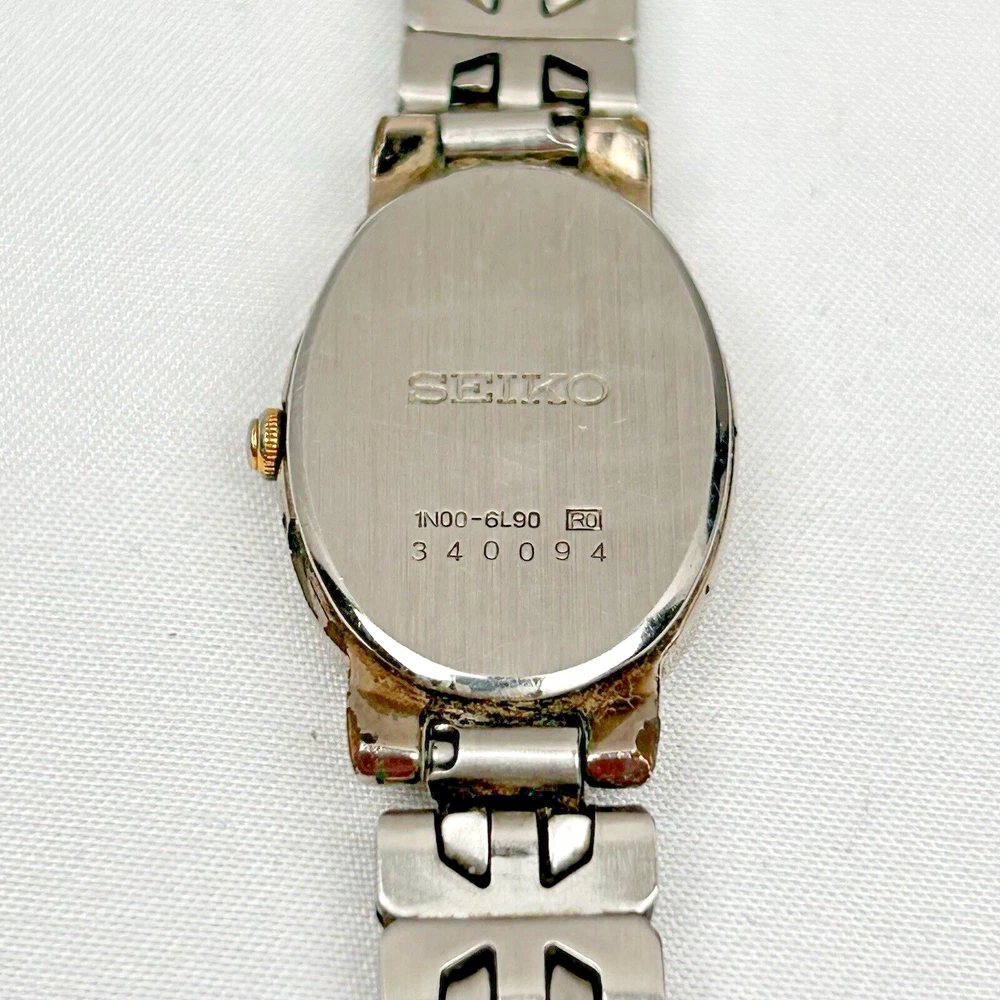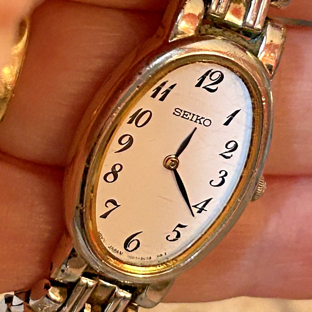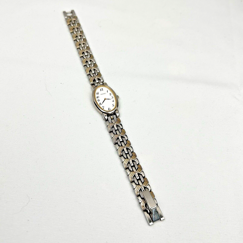 This vintage Women's Seiko Wristwatch has an elegant oval face with a white dial and gold and silver 7.5" chain band. Featuring a 20mm case size and quartz movement, this analog watch is a timeless accessory for any occasion. It is in excellent working condition with a new battery. There are some minor surface scratches and wear due to age, but it still shows very nicely. Add a touch of class to your look with this classic Seiko watch.