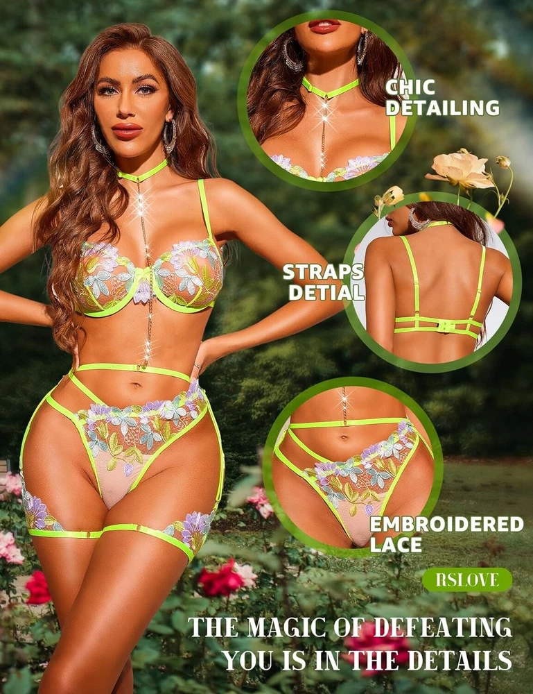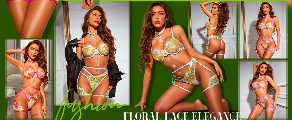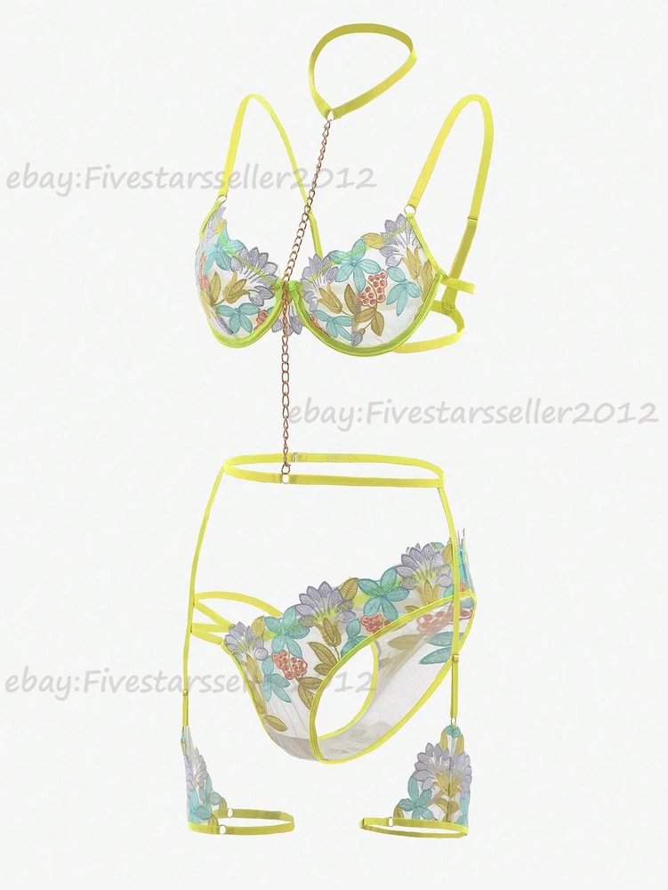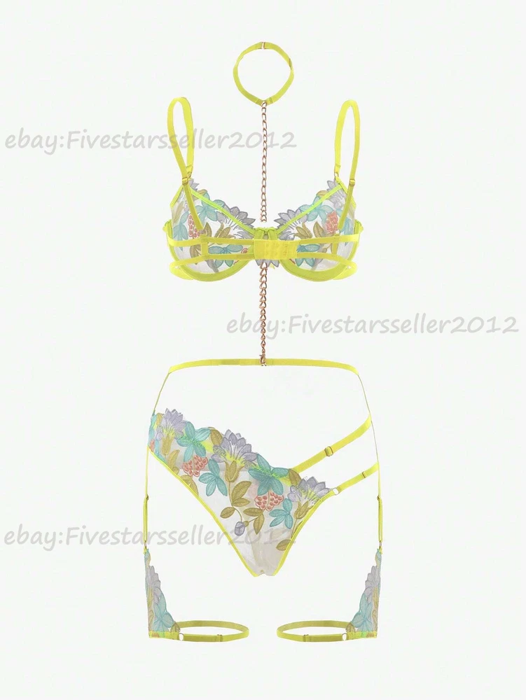 About this item: ✨Chic Choker & Garter: This lingerie set has a removable choker. The choker is connected to the waistband and garter belt with a dazzling chain. The garter height is adjustable, and the straps have elasticity. With the integrated set, you no longer have to worry about finding matching accessories. The sexy choker garter belt enhances the overall sophistication of your outfit, providing the maximum visual impact. As a seductive and exotic lingerie, it will instantly ignite the flames of desire. 🌺Exquisite Floral Lace: This is a floral embroidery 3-piece sexy lingerie set. The bra, panties, and garter belt are adorned with gorgeous and vibrant colored floral patterns, transporting you to a blooming garden. The panties stand out from ordinary lingerie sets with asymmetrical design, adding a touch of uniqueness and allure. Put on this captivating lingerie and unleash your passion. 💖Underwire Support: The bra straps are adjustable, and feature an internal underwire design, providing perfect support and shaping effects. It enhances the allure of your bust line and ensures a slim and snug fit. Come and showcase your sizzling curves with this embroidered lingerie set. 💋Versatile for Every Occasion: This enchanting lingerie set isn't just reserved for special nights; it's your passport to radiance on a multitude of occasions. Whether you're celebrating an anniversary, kindling the flames on Valentine's Day, dancing under the stars at a music festival, or capturing intimate moments in a boudoir photoshoot, this set is designed to elevate every experience. 🌹Package: 1* Choker with Leg Garter Belt, 1* Lace Bra, 1* Embroidered Panty, Each piece embodies exquisite lace craftsmanship, ensuring a harmonious blend of sophistication