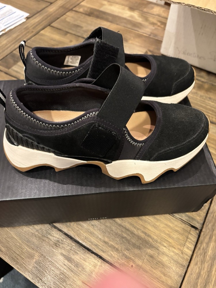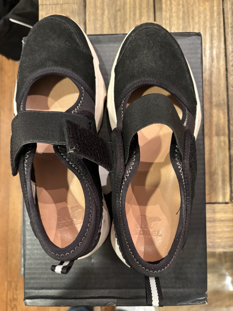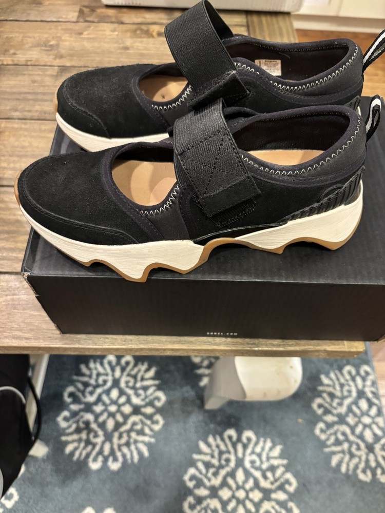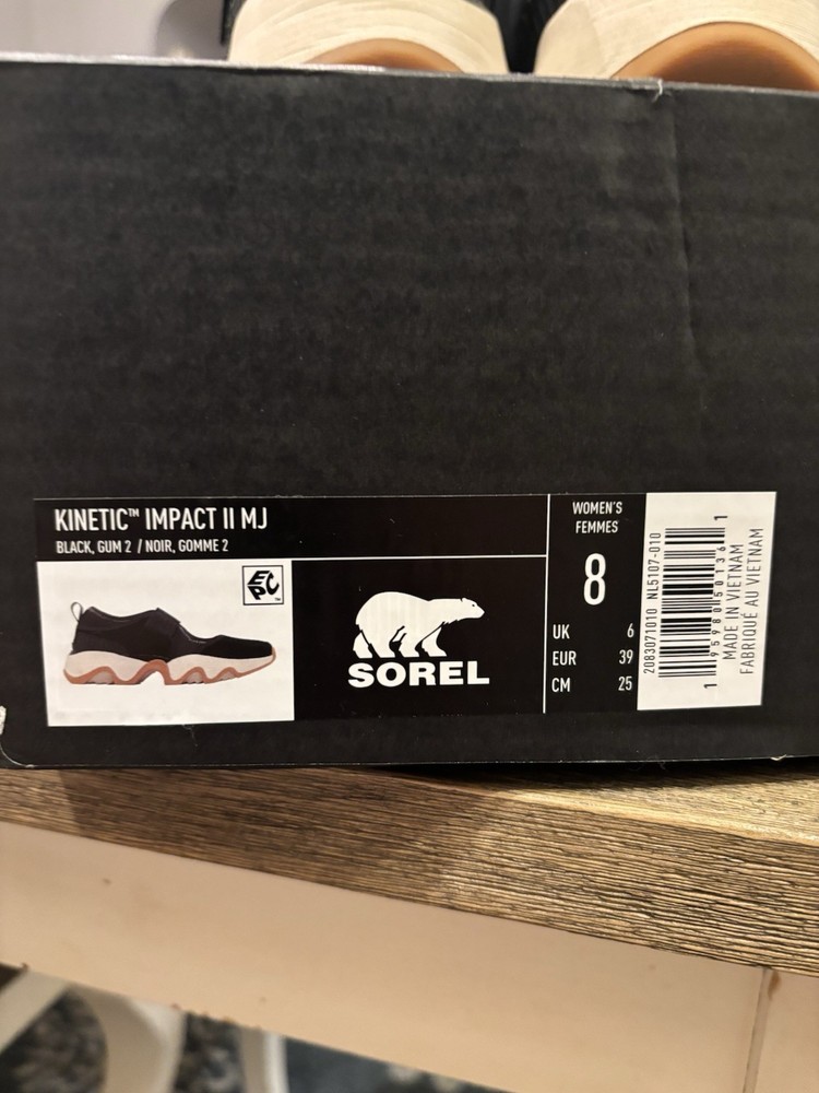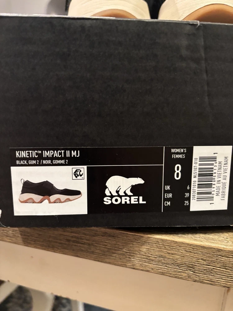 The Women's Sorel Kinetic Impact Sneakers in size 8 feature a stylish black and white color scheme, perfect for activewear occasions. These sneakers are designed for comfort and cushioning, making them ideal for all seasons. The lace-up closure ensures a secure fit, while the mesh upper material adds a breathable element to the overall design. With a focus on both style and functionality, these sneakers are a versatile addition to any woman's shoe collection.