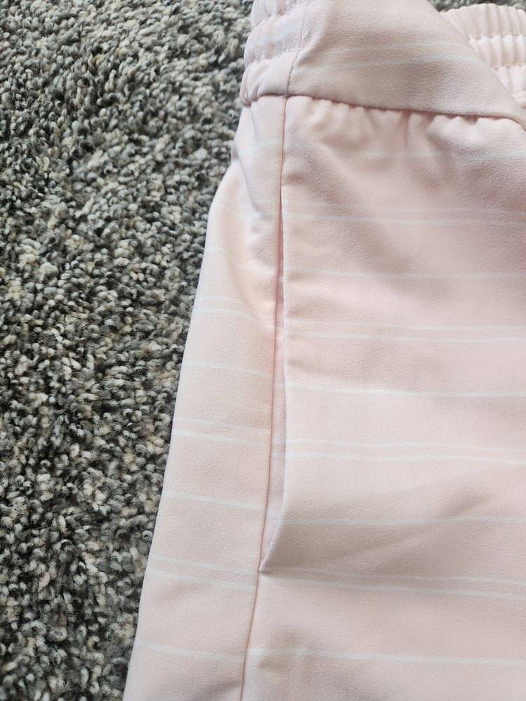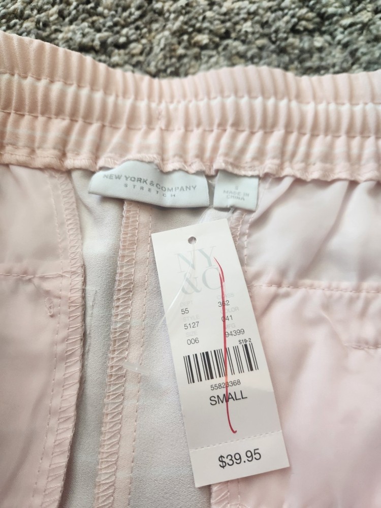 These women's shorts by New York & Company in size small are perfect for a casual occasion. Made from a comfortable spandex and polyester blend, these pink shorts with white stripes feature a flat front design with a mid-rise fit. The regular fit and slash pockets make them both stylish and practical, while the chino style adds a touch of sophistication. Ideal for summer and spring, these machine washable shorts are a versatile addition to any woman's wardrobe.