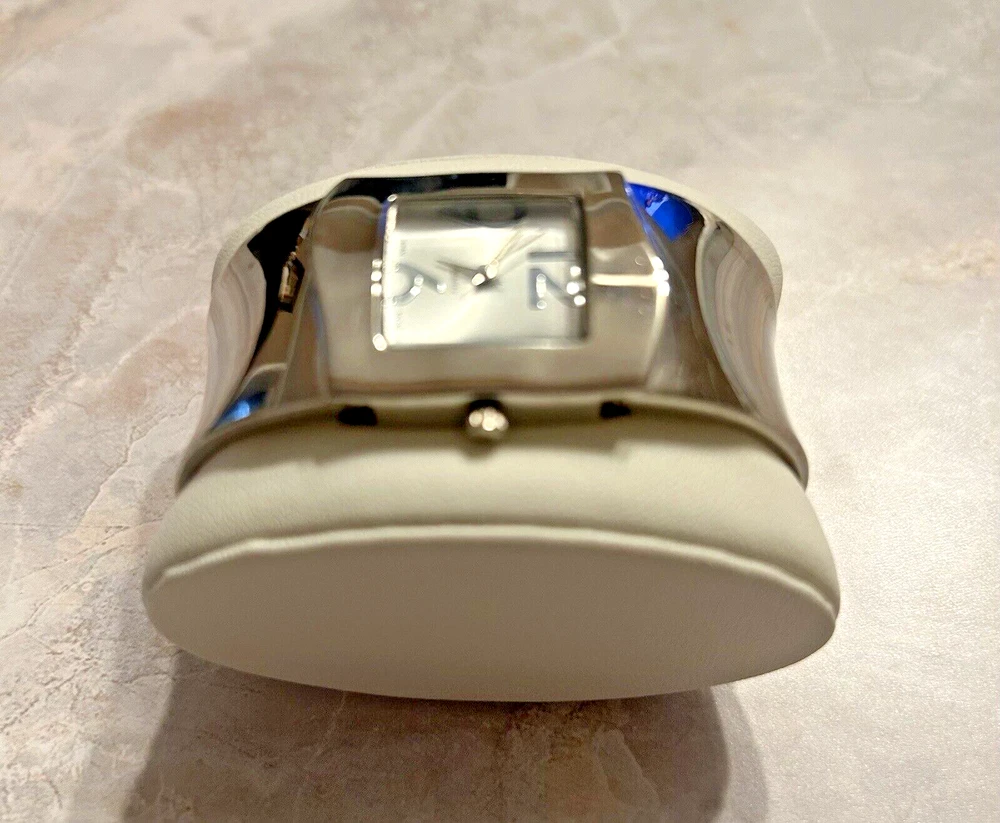 This beautiful women's wristwatch is a vintage piece from Japan with a silver quartz movement. It features a hinge closure and a wavy silver band/strap that complements the silver case color. The watch is analog and does not come with original box/packaging or papers. Perfect for accessories collectors and vintage watch enthusiasts, this piece is a great addition to any jewelry collection. Its classic design and vintage charm make it a versatile accessory that can be worn with any outfit. Get your hands on this unique silver cuff watch bracelet now! Works great just needs new battery.