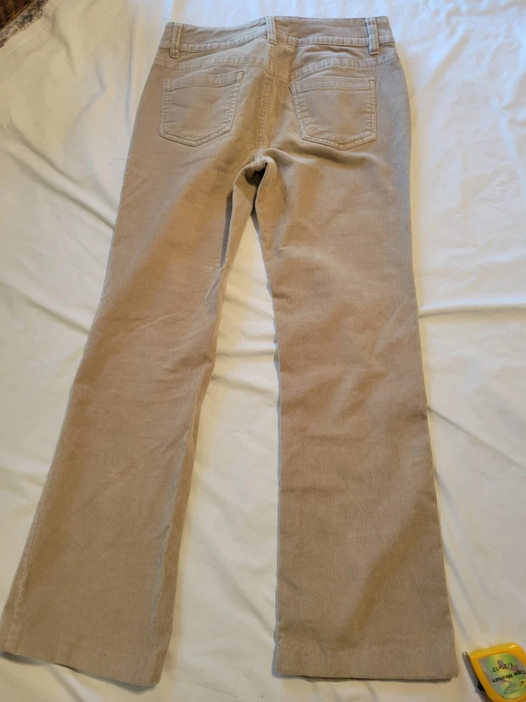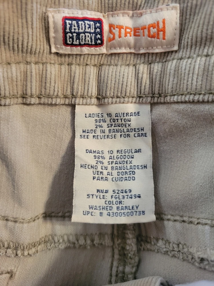 Elevate your wardrobe with these stylish and comfortable beige corduroy pants from Faded Glory. These women's size 10 chino pants feature a solid pattern and a bootcut leg style, making them perfect for travel, casual or business occasions. The pants are made of a cotton blend material with a stretch feature, ensuring maximum comfort and a flattering fit. The pants have a closure of zip and button, making them easy to wear. They also have accents of zipper, giving them a chic look. These pants are perfect for those who love preppy and classic looks. With a waist size of 32 inches and an inseam of 29 inches, these pants are a great addition to your wardrobe.