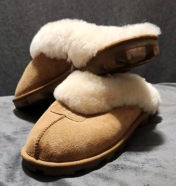 The product is a pair of UGG slippers in women's size 11, designed for comfort and coziness. Made with suede upper material and featuring a slip-on style, these brown slippers are perfect for lounging around the house. With the brand's signature Australian theme, these slippers are both stylish and practical for everyday wear. Perfect for adding a touch of luxury to your home, these UGG slippers are a must-have for any woman looking for comfort and style.